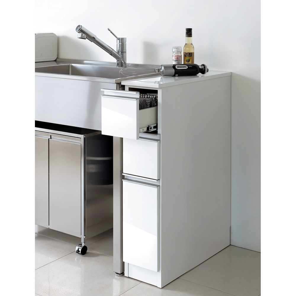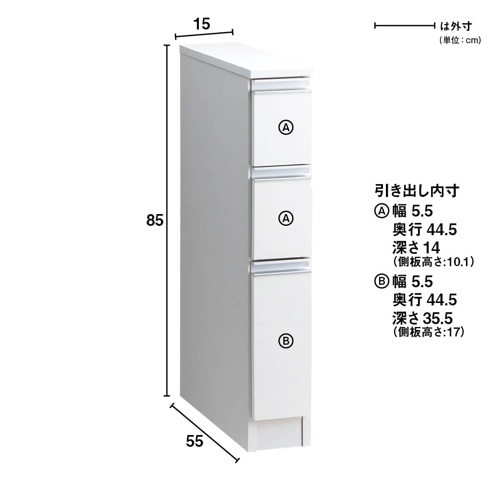 キッチンやダイニングの隙間を有効活用できるキッチン収納家具。丁寧なつくりが魅力です。高さをいかしてキッチン雑貨や食品ストック類を整理できます。幅は15、20、25、30、35、40、45cmの7サイズ、奥行は45と55cmの2サイズをご用意しております。キッチンのすき間を有効活用できるすき間収納シリーズ●散らかりがちなキッチン雑貨を整理できる収納家具を、サイズ豊富にご用意しました。●シンクの高さに合うように本体の高さも85cmです。●幅は15、20、25、30、35、40、45cmの7タイプ、奥行は45cmと55cmの2タイプから、ぴったりのサイズをお選びいただけます。●シンクサイドに設置すれば作業スペースが広がります。細部まで使いやすさにこだわった、国産家具のキッチン収納●前面と天板は光沢感があり見た目にも美しいデザイン。●前面、天板には傷が付きにくく汚れにも強いポリエステル化粧合板、側板にはクリーンイーゴス化粧合板を使用。●気になる汚れもサッとひと拭きでき清潔感を保ちます。●取っ手にはアルミを採用し、高級感と耐久性が感じられるデザインに。●奥のものが取り出しやすいフルスライドレールを3段ともすべてに採用しました。●引き出し内部も化粧を施し、美しく傷にも強い仕上がりです。幅木よけ仕様だから壁にぴったりとつけて設置できます。職人技が光る、安心の日本製■熟練の家具職人が、一点一点心をこめて丁寧に仕上げております。■長く使うものだから、造りのしっかりした収納家具をお求めください。面倒な組み立てのいらない完成品■組み立て不要の完成商品でのお届けになります。届いたその日からすぐにご使用いただけます。