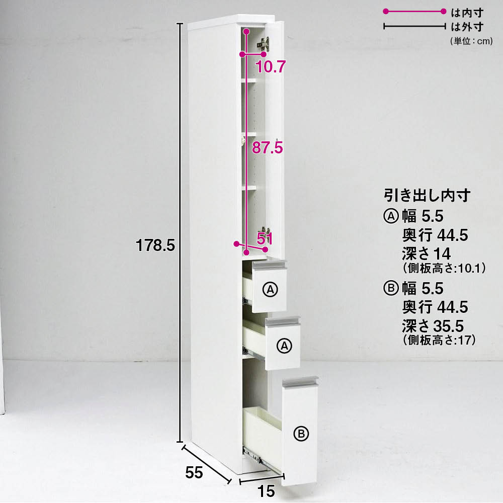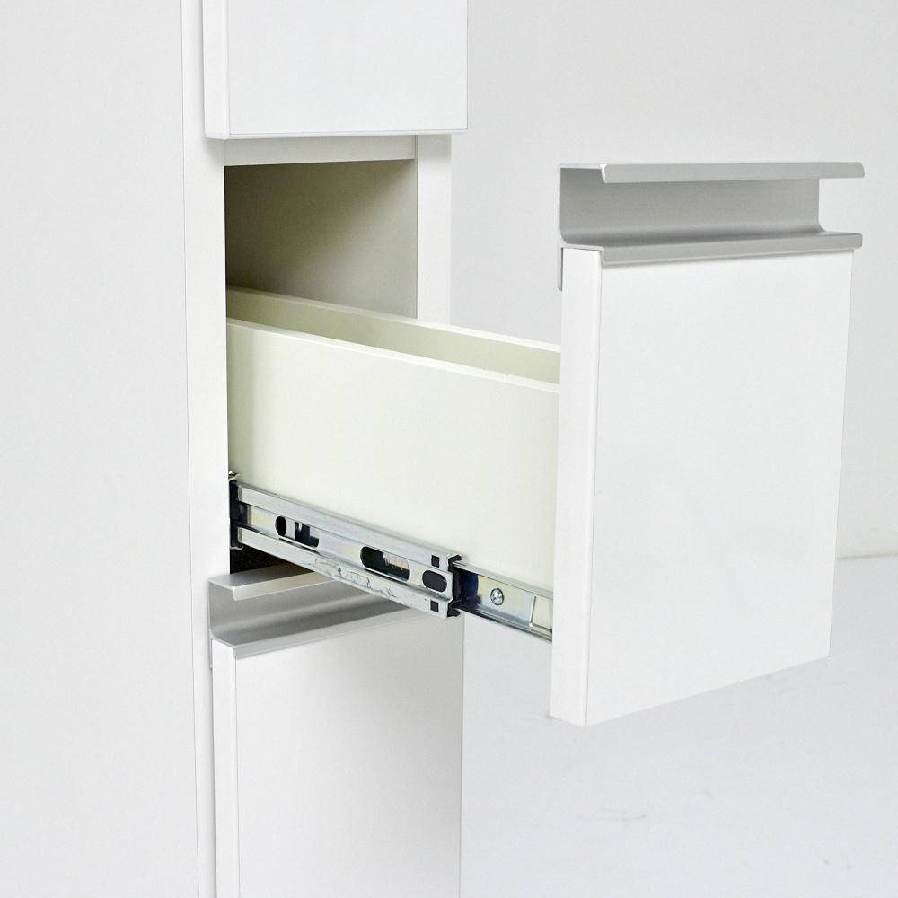 隙間を有効活用できるキッチン収納家具。丁寧なつくりが魅力。幅は15、20、25、30、35、40、45cmの7サイズ、奥行は45と55cmの2サイズをご用意。引き出し3段タイプは上部の棚収納を広く設け、背の高いストックものが収納しやすい設計です。キッチンのすき間を有効活用できるすき間収納シリーズ■散らかりがちなキッチン雑貨を整理できる収納家具を、サイズ豊富にご用意しました。■高さは冷蔵庫横や食器棚横に合わせやすい178cm。■おおよそ上半分を扉付きの棚収納、下半分は引出収納のプレーンな収納バランス。■ボトルものや背の高いストックの袋を収納しやすい対応です。■幅は15、20、25、30、35、40、45cmの7タイプ、奥行は45cmと55cmの2タイプから、ぴったりのサイズをお選びいただけます。■シンクサイドに設置すれば作業スペースが広がります。細部まで使いやすさにこだわった、国産家具のキッチン収納■前面は光沢感があり見た目にも美しいデザイン。■前面は傷が付きにくく汚れにも強いポリエステル化粧合板、側板にはクリーンイーゴス化粧合板を使用。■気になる汚れもサッとひと拭きでき清潔感を保ちます。■取っ手にはアルミを採用し、高級感と耐久性が感じられるデザインに。■奥のものが取り出しやすいフルスライドレールを引き出し3段ともすべてに採用しました。■引き出し内部も化粧を施し、美しく傷にも強い仕上がりです。幅木よけ仕様だから壁にぴったりとつけて設置できます。■上段の扉は両手がふさがっているときでもラクに開閉できるプッシュ式です。職人技が光る、安心の日本製■熟練の家具職人が、一点一点心をこめて丁寧に仕上げております。■長く使うものだから、造りのしっかりした収納家具をお求めください。面倒な組み立てのいらない完成品■組み立て不要の完成商品でのお届けになります。届いたその日からすぐにご使用いただけます。