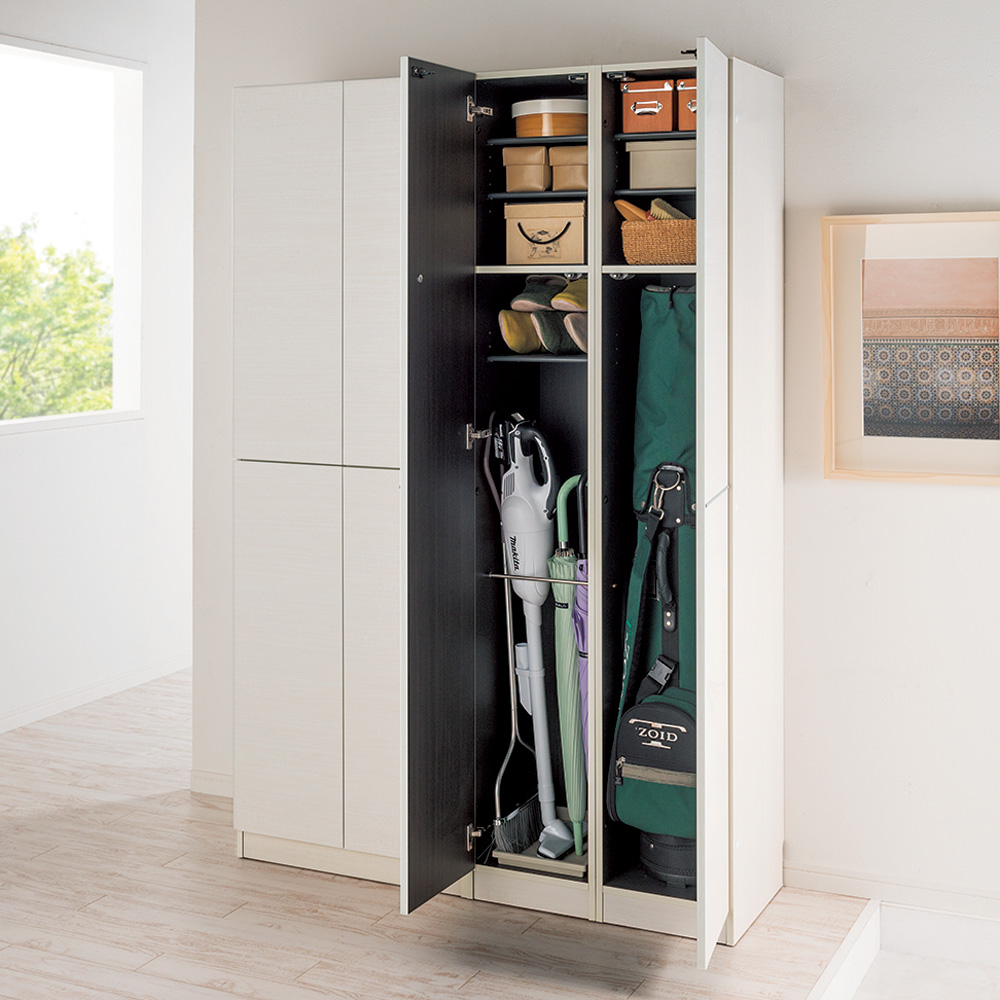 長さのある掃除機、ほうき、傘などが収納可能。