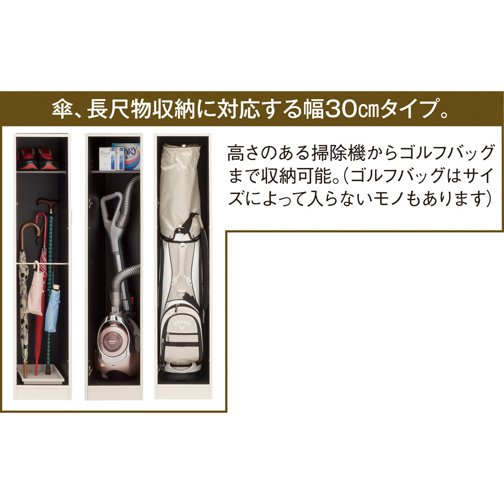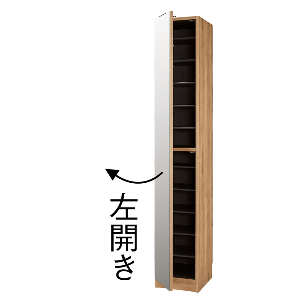 まるで、オートクチュールのような美しい下駄箱。上品な表情と用途を絞り込んだ収納で玄関を素敵に彩るシューズボックス。備え付け家具のように壁面を大量靴収納空間に。私のために作って欲しいを叶えます。あなたの個性を輝かせる!リフォームしたかのような玄関収納をあなたに。●自慢したくなる大量靴収納庫、お洒落でワンランク上の上質な時を奏でます。●デザインだけじゃない、充実の機能性や厳選した材料を採用。●玄関の顔にふさわしいおもてなしの心を感じるエントランス収納です。【家具職人の想い】●お洒落な女性の願いを叶えたい、ファッションだけで無く、家具にも上質を求める心の声を形にしました。●高級感のある佇まいと、日本製であるプライドを大切に心を込めて仕上げています。【製品情報】[色の種類]●純粋で清潔感のあるホワイト。●白を基調とした木目のある上品なホワイトシカモア。●明るく穏やかな印象のライトアッシュ。●静寂と寛ぎを感じるナチュラルオーク。●優しさと包容力を感じるミディアムオーク。●シックで落ち着いたブラックウォルナット。●風格と威厳を併せ持つダークオーク。●トレンドの男前インテリアにも合わせやすいグレーウォルナット。[サイズ・バリエーション]●幅は、30cm・60cm・75cm・90cm。ネット限定で、45cmもご用意。●本体高さは、95.5cmと180.5cm。●天井に合わせてオーダーできる上置きをネット限定でご用意。高さ30cm〜80cmまで1cm単位でオーダー可能。●本体とあわせると天井高さ213cmから263cmまで対応します。●玄関収納やクローゼットに設置してシューズを大切に包み込みます。[機能・構造・仕様]●ホワイトの扉は汚れが付きにくく、美しい光沢のある仕上げ。●ミラー扉タイプは、姿見としてお出かけ前のチェックや玄関を明るく広く感じさせてくれます。●扉には、世界トップクラスと言われているブルム社製のスライドヒンジを搭載。●靴サイズに合わせて可動する棚板は清潔に保てる水洗いできる樹脂製。●高さ95.5cmタイプの天板とオープンタイプの中天板は、水拭き可能な強くて美しい素材を使用。●傘収納タイプは、汚れ防止の樹脂製のトレー付き。バーを外せば高さのある掃除機なども収納可能(内寸高さ112cm)。【活躍空間】●エントランスの壁面収納家具として。●クローゼットに設置して、モダンな印象のシューズクローゼットとして。【担当者からのメッセージ】●リフォーム、リノベーションしたいけど価格が・・・。住設メーカーのお見積もりと是非見比べて下さい。●ご注文を頂いてから、日本の家具専門工場が丁寧に仕上げているオートクチュールな国産収納家具です。●出したら直ぐ使える日本製完成品も女性には嬉しいポイントです。