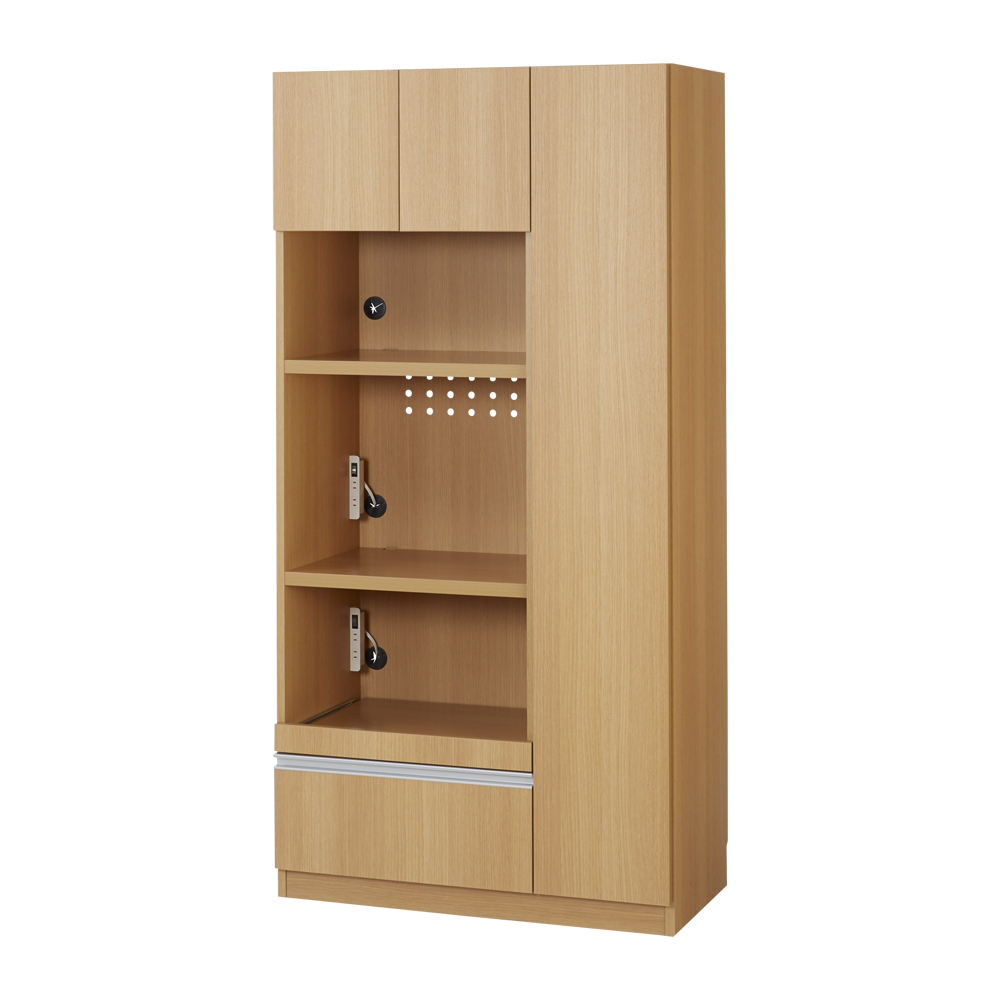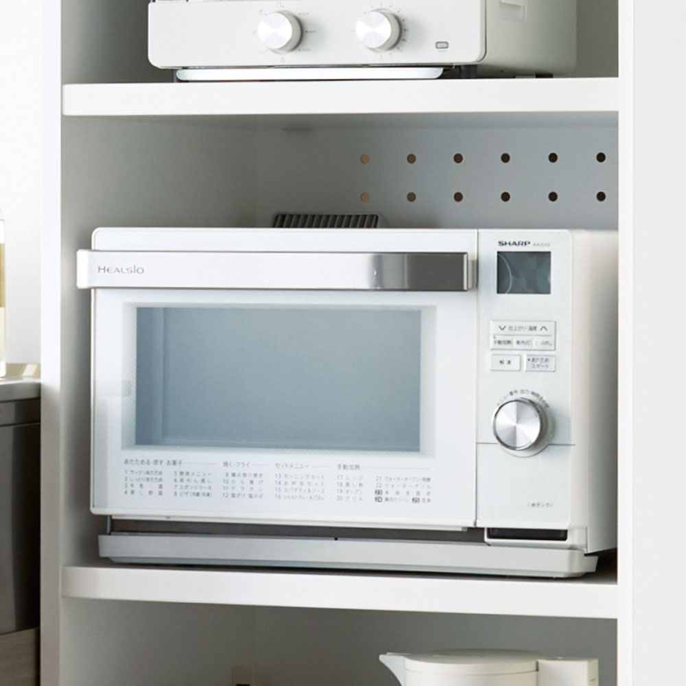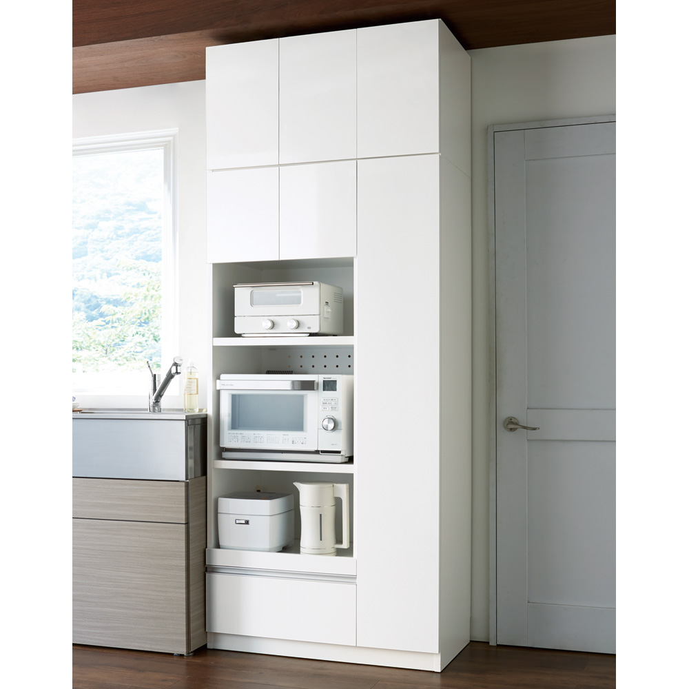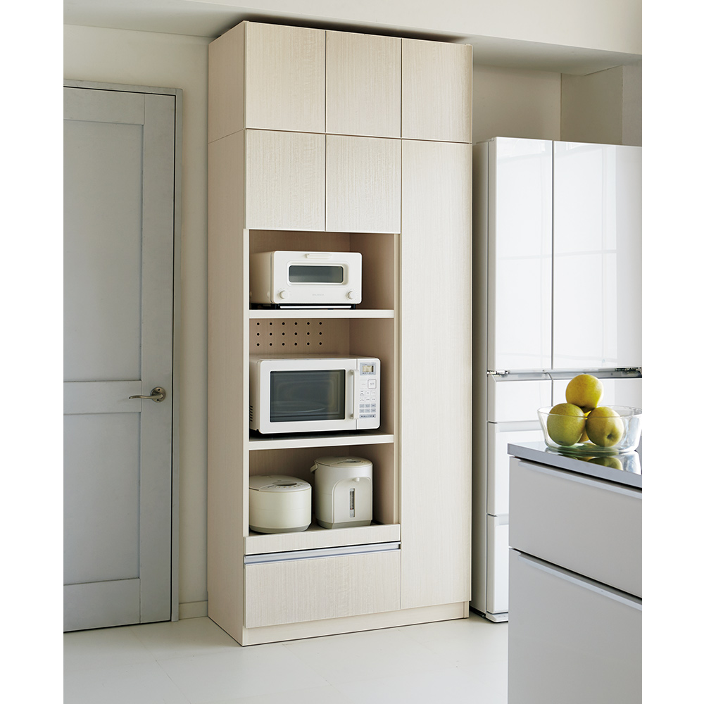 天井のデッドスペースを使えば驚くほど収納力アップ。調理家電も食器も食品ストックもまとめて収納できる省スペースな家電収納庫です。ホワイトシカモア(木目調)マルチボード 幅90cm(お届け商品は奥行45cmタイプ)省スペースで家電とキッチン雑貨をひとまとめに幅90cmのコンパクトなサイズ感で、狭いキッチンのわずかなスペースでも収まるキッチン家電収納庫。コーディネート例(ホワイト マルチボード幅90cm・上置き幅90cm)収納力たっぷり!家電も食器もまとめて収納便利な家電収納部が3段あるので、増えていく調理家電をまとめて省スペースに収納可能。トースターや電子レンジ・オーブンレンジも一か所にしまえます。内寸図(単位:cm)マルチボード幅90cm奥行は45cm(オープン部奥行内寸41cm)・50cm(オープン部奥行内寸46cm)の2タイプがあります。コーディネート例(ナチュラル マルチボード幅90cm・上置き幅90cm)生活感を扉ですっきり隠せる上部は2枚扉でキッチン用品を隠せる収納スペースです。向かって右手の収納棚は、プッシュオープン式で開け閉め簡単。普段使わないストック品や家電・キッチングッズもまとめて整理して、扉で目隠し。3cm間隔で調整可能な可動棚板収納物の大きさに合わせて効率よく整理整頓できます。2か所に2口コンセント付き中央と最下段のオープンスペースには、2口コンセントがついています。蒸気対策のスライドトレー最下段の家電棚はスライドトレー付きなので、炊飯器やポット・電気ケトルなどの蒸気の出る電化製品も安心。食品や調理器具を便利にしまえる引き出し下部には深引き出しが1杯ついています。引き出しの有効高さ内寸は20cm。深型のお鍋やお皿、レトルト食品のストック収納にも便利。こまごまとした調理器具やかさばるタッパーの収納場所としてもお勧め。フルスライドレール仕様のため、奥のものまで取り出しやすくスムーズに引き出せます。手をかけやすい幅広の取っ手で、忙しいお料理中も開け閉め簡単。上:ホワイト・ホワイトシカモア、下:ナチュラル・ダークブラウン選べる4つのカラーキッチンやお部屋のインテリアに合わせて4色をご用意。ホワイト(光沢無地):美しい光沢で清潔感があり、システムキッチンにも合わせやすい定番カラー。ホワイトシカモア(木目調):新築物件やリフォームで人気の上品な白木目で表情豊かなキッチンに。ナチュラル:キッチンをあたたかく演出する天然木調。ダークブラウン:落ち着きのある色味で、お部屋に高級感を添えます。左:ホワイト マルチボード幅90cm・上置き幅90cm、右:ダークブラウン レンジボード幅60cm・上置き幅60cmシリーズ品の高さオーダー上置きで収納力UP天井高さピッタリに設置できる「上置き」は、1cm単位でオーダーを承ります。マンションやキッチン周りでよく見られる下がり天井や、梁にもぴったり対応。家具を設置したときに生まれがちなデッドスペースを、収納棚として有効活用できます。まるで作り付けのシステムキッチンのようにたっぷりと収納可能。