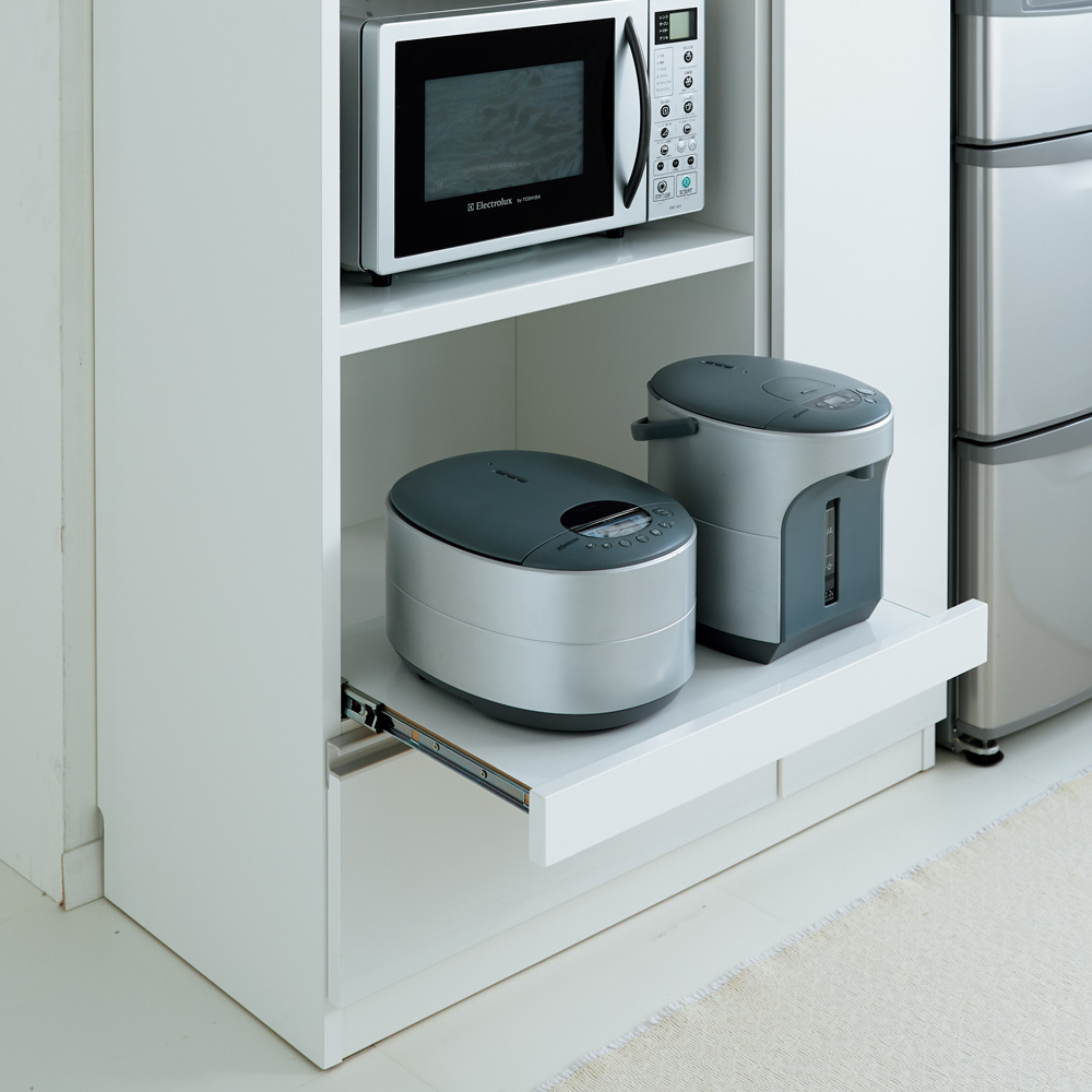 下段の家電収納部はスライドトレー付きで、蒸気の出る家電も安心。