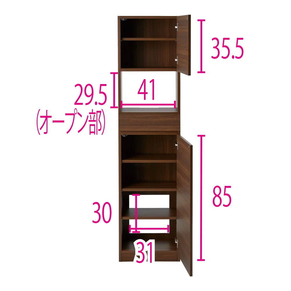 上部扉内内寸:幅41奥行24高さ35cm(棚板:3cm間隔調節3段)、下部扉内内寸:幅41奥行24高さ85cm(棚板:3cm間隔調節15段) ※画像は右開きです。