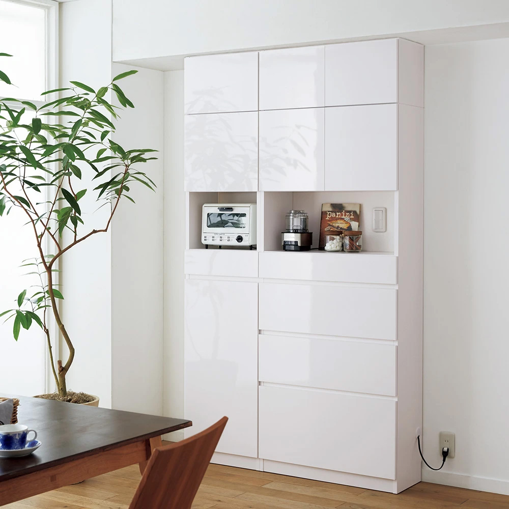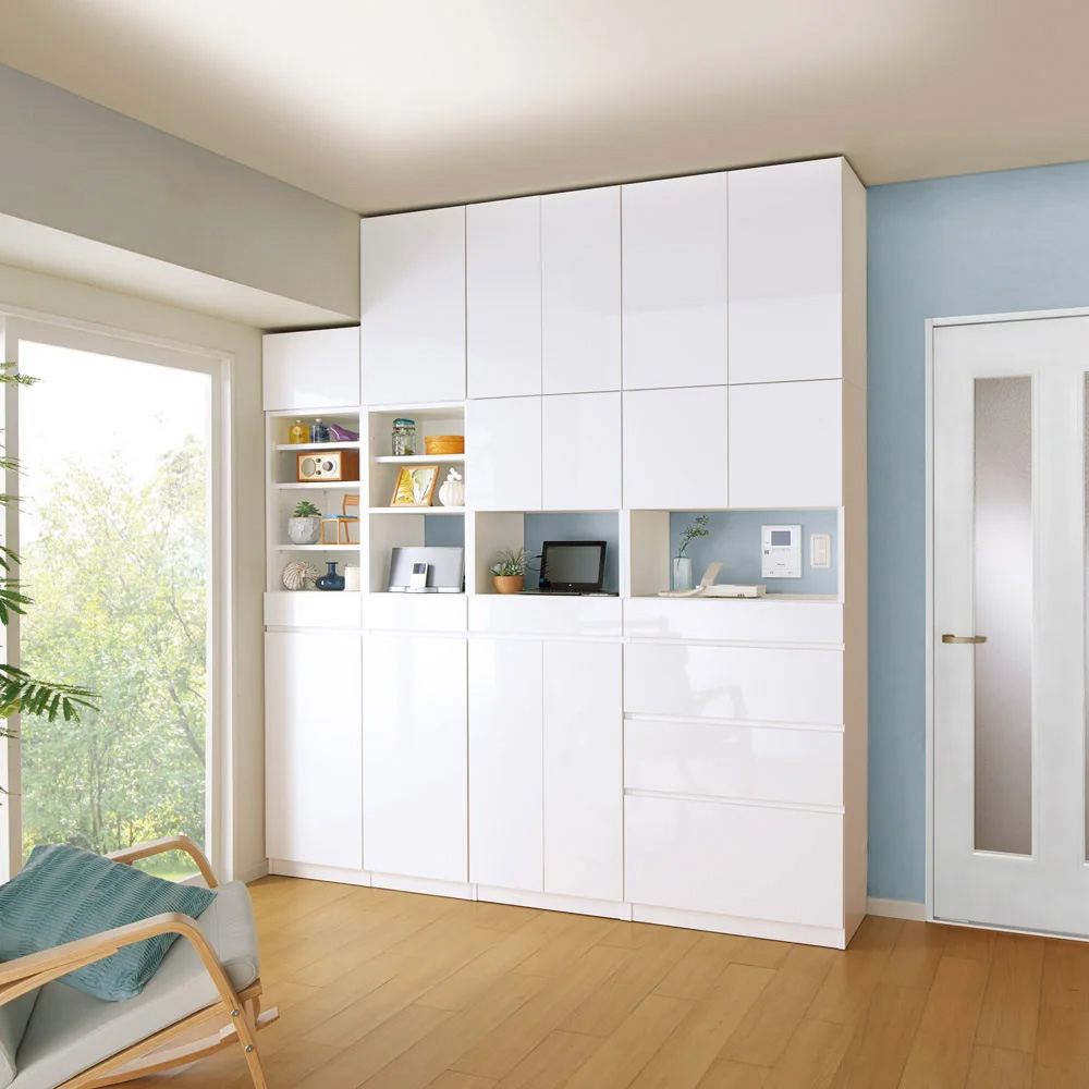 壁のスイッチ類を避けて設置でき、配線をすっきり隠せる壁面収納。突っ張り式上置き(別売り)は高さオーダーできるのでまるで造り付け。コードを隠しつつ、コンセントを活かす工夫も。壁のスイッチやインターフォン、コンセントを避けて、壁一面に収納を。収納を増やしたい!でも壁にスイッチ類があり窓下収納サイズしか置けない…というお悩みを解決!スイッチ避けタイプは電気のスイッチがある高さがオープンになっており、コンセントがある位置は背板をくり抜いているので壁にある物を気にせずに設置できます。また、ルーター、電源タップなどのコード類をすっきり隠せる工夫も満載。大量収納スペースが欲しくても置けなかった方のお悩みを解消できる収納庫です。リビングやダイニング、狭いコーナー、書斎、梁のある場所など家中のどんな場所にもフィットし、収納場所を造りながら簡単にお部屋の模様替えができます。設置したい場所にぴったり。上置きは高さ1cm単位でオーダーできるオーダー家具◆上置きは高さを30〜80cmの間で1cm単位でオーダーすることができます。◆天井高さ212cm〜262cmまで対応でき、スペースを有効活用できます。◆それぞれの設置したい場所にぴったり合わせて、まるで造り付けの収納のように。アイディア満載の細部にこだわった造り◆高さ110cmの位置にある、オープン部分。スイッチを避けられる仕様です。コレクションをディスプレイして飾り棚にも。◆オープン部の中天板は配線できる仕様。中天板奥にカキコミがあるので、電話台・FAX台としても大活躍。音楽プレーヤーやデジタルフォトフレームを飾っても◎◆背板のくりぬきで、コンセントをふさがない。コンセントをふさがず設置できるので、コードを隠して扉内で配線可能。中天板に置いた電子機器もこちらで配線可能です。◆側板に配線穴があり、設置後も配線ラクラク。側板の配線穴からコードを通せて、すっきり。◆スイッチ避けタイプ、収納庫タイプをご用意。オープン部のあるスイッチよけタイプとオープン部の無い収納庫タイプをご用意。スイッチの無い所には収納庫タイプを設置すればより大量収納ができますどちらにも扉タイプと引出タイプがあり、用途に合わせてお選びいただけます。◆引き出しは全段フルスライドレールで開閉ラクラク。スムーズに開けられる上に、探しやすいのもうれしいポイント。◆プッシュ扉ですっきり隠して。扉部分はプッシュ式で取っ手が無くシンプルな見た目です。耐久性抜群のブルム社スライドヒンジ搭載で高級感のある仕様です。◆3cmピッチ可動棚板で収納物に合わせて調整可能◎ピンを棚板に差し込むタイプの棚ダボで、外れや落下を防止します。本棚・CD収納としても。壁一面に並べて大量収納ブックシェルフ。キッチンにもなじむシンプルなデザインなので食器棚としても◎◆上下連結で耐震性向上。化粧キャップ付きボルト連結で、隙間やズレを抑えます。◆幅木よけカットで壁にぴったり設置。上置き以外のアイテムに巾木よけカットがあるので、壁につけておいて頂けます。選べるおしゃれな3色。理想のお部屋のイメージに合わせて。◆(ア)ホワイトはお部屋を選ばない、透明感のある美しい光沢感が魅力。清潔感あるキッチンインテリアにもお勧め。◆(イ)ライトアッシュは優しい色合いと木目柄が、ナチュラルモダンなインテリアにお勧め。モダンな北欧家具や北欧インテリアとマッチ。◆(ウ)ウォルナットははっきりとした天然木調が印象的。大人のシックなインテリアにぴったり。書斎で書棚使いも重厚感があり魅力的です。◆(エ)モードブラックはニュアンスを感じさせるテクスチャーが特長。洗練された黒を主役にすることで、都会的なお部屋を演出できます。安心と信頼の職人技が光る国産家具◆熟練の家具職人がひとつずつ丁寧に仕上げたワンランク上の壁面収納です。◆細部の丁寧な仕上がりなど日本製ならではの高品質な家具をお楽しみください。◆環境に配慮したF☆☆☆☆の材料を使用した商品です。