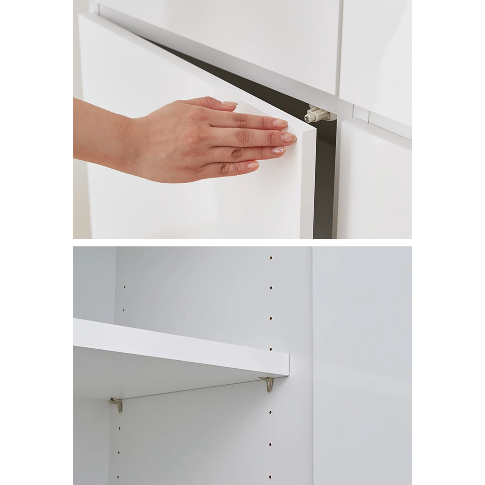 (写真上)プッシュ扉で開閉簡単。取っ手が無くスタイリッシュです。(写真下)3cmピッチで調整できる可動棚板。ピンを棚板に差し込むタイプの棚ダボで、外れや落下を防止します。 ※棚板サイズ:幅40奥行33厚さ2cm