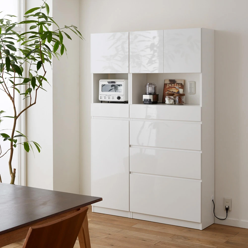 壁のスイッチ類を避けて設置でき、配線をすっきり隠せる壁面収納。突っ張り式上置き(別売り)は高さオーダーできるのでまるで造り付け。コードを隠しつつ、コンセントを活かす工夫も。壁のスイッチやインターフォン、コンセントを避けて、壁一面に収納を。収納を増やしたい!でも壁にスイッチ類があり窓下収納サイズしか置けない…というお悩みを解決!スイッチ避けタイプは電気のスイッチがある高さがオープンになっており、コンセントがある位置は背板をくり抜いているので壁にある物を気にせずに設置できます。また、ルーター、電源タップなどのコード類をすっきり隠せる工夫も満載。大量収納スペースが欲しくても置けなかった方のお悩みを解消できる収納庫です。リビングやダイニング、狭いコーナー、書斎、梁のある場所など家中のどんな場所にもフィットし、収納場所を造りながら簡単にお部屋の模様替えができます。設置したい場所にぴったり。上置きは高さ1cm単位でオーダーできるオーダー家具◆上置きは高さを30〜80cmの間で1cm単位でオーダーすることができます。◆天井高さ212cm〜262cmまで対応でき、スペースを有効活用できます。◆それぞれの設置したい場所にぴったり合わせて、まるで造り付けの収納のように。アイディア満載の細部にこだわった造り◆高さ110cmの位置にある、オープン部分。スイッチを避けられる仕様です。コレクションをディスプレイして飾り棚にも。◆オープン部の中天板は配線できる仕様。中天板奥にカキコミがあるので、電話台・FAX台としても大活躍。音楽プレーヤーやデジタルフォトフレームを飾っても◎◆背板のくりぬきで、コンセントをふさがない。コンセントをふさがず設置できるので、コードを隠して扉内で配線可能。中天板に置いた電子機器もこちらで配線可能です。◆側板に配線穴があり、設置後も配線ラクラク。側板の配線穴からコードを通せて、すっきり。◆スイッチ避けタイプ、収納庫タイプをご用意。オープン部のあるスイッチよけタイプとオープン部の無い収納庫タイプをご用意。スイッチの無い所には収納庫タイプを設置すればより大量収納ができますどちらにも扉タイプと引出タイプがあり、用途に合わせてお選びいただけます。◆引き出しは全段フルスライドレールで開閉ラクラク。スムーズに開けられる上に、探しやすいのもうれしいポイント。◆プッシュ扉ですっきり隠して。扉部分はプッシュ式で取っ手が無くシンプルな見た目です。耐久性抜群のブルム社スライドヒンジ搭載で高級感のある仕様です。◆3cmピッチ可動棚板で収納物に合わせて調整可能◎ピンを棚板に差し込むタイプの棚ダボで、外れや落下を防止します。本棚・CD収納としても。壁一面に並べて大量収納ブックシェルフ。キッチンにもなじむシンプルなデザインなので食器棚としても◎◆上下連結で耐震性向上。化粧キャップ付きボルト連結で、隙間やズレを抑えます。◆幅木よけカットで壁にぴったり設置。上置き以外のアイテムに巾木よけカットがあるので、壁につけておいて頂けます。選べるおしゃれな3色。理想のお部屋のイメージに合わせて。◆(ア)ホワイトはお部屋を選ばない、透明感のある美しい光沢感が魅力。清潔感あるキッチンインテリアにもお勧め。◆(イ)ライトアッシュは優しい色合いと木目柄が、ナチュラルモダンなインテリアにお勧め。モダンな北欧家具や北欧インテリアとマッチ。◆(ウ)ウォルナットははっきりとした天然木調が印象的。大人のシックなインテリアにぴったり。書斎で書棚使いも重厚感があり魅力的です。◆(エ)モードブラックはニュアンスを感じさせるテクスチャーが特長。洗練された黒を主役にすることで、都会的なお部屋を演出できます。安心と信頼の職人技が光る国産家具◆熟練の家具職人がひとつずつ丁寧に仕上げたワンランク上の壁面収納です。◆細部の丁寧な仕上がりなど日本製ならではの高品質な家具をお楽しみください。◆環境に配慮したF☆☆☆☆の材料を使用した商品です。