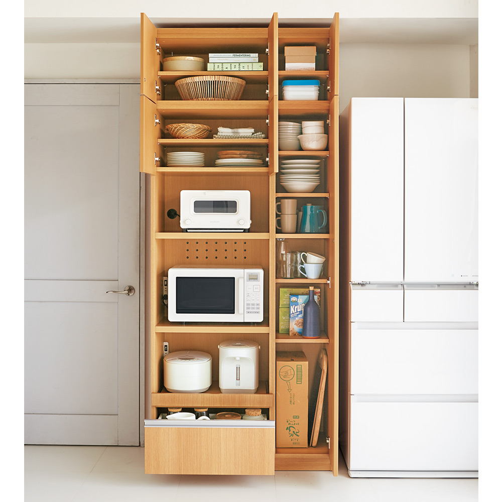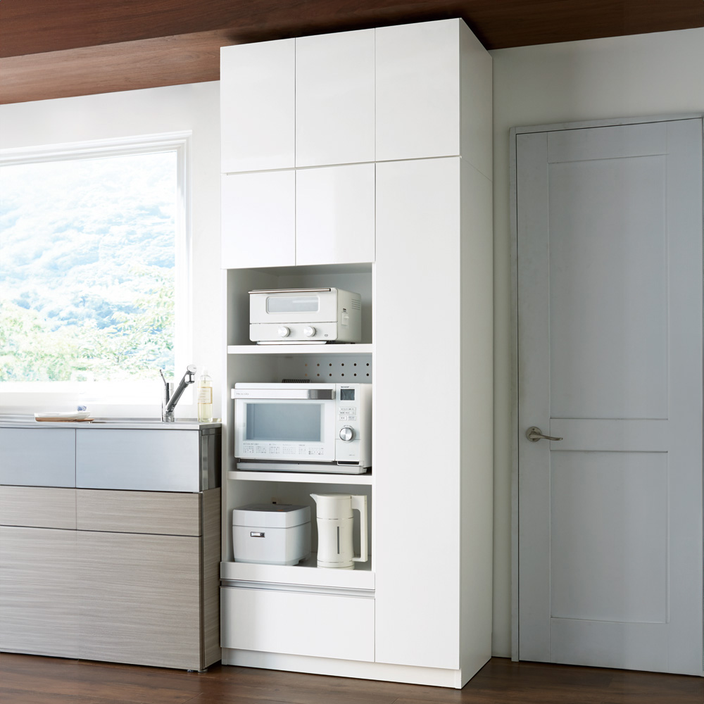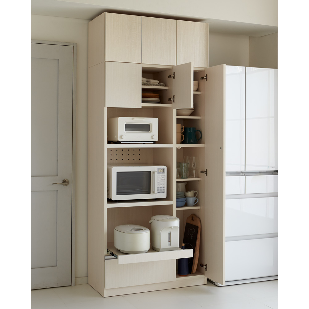 天井のデッドスペースを使えば驚くほど収納力アップ。調理家電も食器も食品ストックもまとめて収納できる省スペースな家電収納庫です。ホワイトシカモア(木目調)マルチボード 幅90cm(お届け商品は奥行50cmタイプ)省スペースで家電とキッチン雑貨をひとまとめに幅90cmのコンパクトなサイズ感で、狭いキッチンのわずかなスペースでも収まるキッチン家電収納庫。コーディネート例(ホワイト マルチボード幅90cm・上置き幅90cm)収納力たっぷり!家電も食器もまとめて収納便利な家電収納部が3段あるので、増えていく調理家電をまとめて省スペースに収納可能。トースターや電子レンジ・オーブンレンジも一か所にしまえます。内寸図(単位:cm)マルチボード幅90cm奥行は45cm(オープン部奥行内寸41cm)・50cm(オープン部奥行内寸46cm)の2タイプがあります。コーディネート例(ナチュラル マルチボード幅90cm・上置き幅90cm)生活感を扉ですっきり隠せる上部は2枚扉でキッチン用品を隠せる収納スペースです。向かって右手の収納棚は、プッシュオープン式で開け閉め簡単。普段使わないストック品や家電・キッチングッズもまとめて整理して、扉で目隠し。3cm間隔で調整可能な可動棚板収納物の大きさに合わせて効率よく整理整頓できます。2か所に2口コンセント付き中央と最下段のオープンスペースには、2口コンセントがついています。蒸気対策のスライドトレー最下段の家電棚はスライドトレー付きなので、炊飯器やポット・電気ケトルなどの蒸気の出る電化製品も安心。食品や調理器具を便利にしまえる引き出し下部には深引き出しが1杯ついています。引き出しの有効高さ内寸は20cm。深型のお鍋やお皿、レトルト食品のストック収納にも便利。こまごまとした調理器具やかさばるタッパーの収納場所としてもお勧め。フルスライドレール仕様のため、奥のものまで取り出しやすくスムーズに引き出せます。手をかけやすい幅広の取っ手で、忙しいお料理中も開け閉め簡単。上:ホワイト・ホワイトシカモア、下:ナチュラル・ダークブラウン選べる4つのカラーキッチンやお部屋のインテリアに合わせて4色をご用意。ホワイト(光沢無地):美しい光沢で清潔感があり、システムキッチンにも合わせやすい定番カラー。ホワイトシカモア(木目調):新築物件やリフォームで人気の上品な白木目で表情豊かなキッチンに。ナチュラル:キッチンをあたたかく演出する天然木調。ダークブラウン:落ち着きのある色味で、お部屋に高級感を添えます。左:ホワイト マルチボード幅90cm・上置き幅90cm、右:ダークブラウン レンジボード幅60cm・上置き幅60cmシリーズ品の高さオーダー上置きで収納力UP天井高さピッタリに設置できる「上置き」は、1cm単位でオーダーを承ります。マンションやキッチン周りでよく見られる下がり天井や、梁にもぴったり対応。家具を設置したときに生まれがちなデッドスペースを、収納棚として有効活用できます。まるで作り付けのシステムキッチンのようにたっぷりと収納可能。