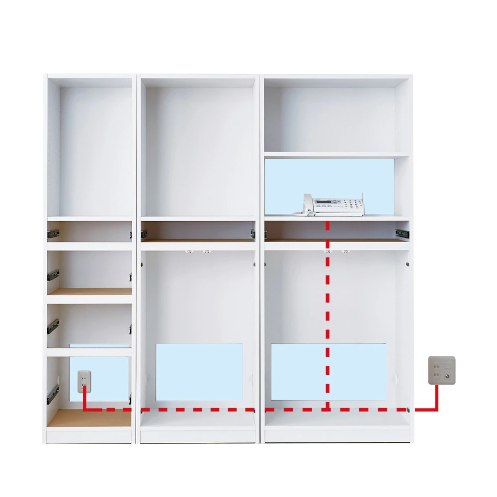 壁のスイッチ類を避けて設置でき、配線をすっきり隠せる壁面収納。突っ張り式上置き(別売り)は高さオーダーできるのでまるで造り付け。コードを隠しつつ、コンセントを活かす工夫も。壁のスイッチやインターフォン、コンセントを避けて、壁一面に収納を。収納を増やしたい!でも壁にスイッチ類があり窓下収納サイズしか置けない…というお悩みを解決!スイッチ避けタイプは電気のスイッチがある高さがオープンになっており、コンセントがある位置は背板をくり抜いているので壁にある物を気にせずに設置できます。また、ルーター、電源タップなどのコード類をすっきり隠せる工夫も満載。大量収納スペースが欲しくても置けなかった方のお悩みを解消できる収納庫です。リビングやダイニング、狭いコーナー、書斎、梁のある場所など家中のどんな場所にもフィットし、収納場所を造りながら簡単にお部屋の模様替えができます。設置したい場所にぴったり。上置きは高さ1cm単位でオーダーできるオーダー家具◆上置きは高さを30〜80cmの間で1cm単位でオーダーすることができます。◆天井高さ212cm〜262cmまで対応でき、スペースを有効活用できます。◆それぞれの設置したい場所にぴったり合わせて、まるで造り付けの収納のように。アイディア満載の細部にこだわった造り◆高さ110cmの位置にある、オープン部分。スイッチを避けられる仕様です。コレクションをディスプレイして飾り棚にも。◆オープン部の中天板は配線できる仕様。中天板奥にカキコミがあるので、電話台・FAX台としても大活躍。音楽プレーヤーやデジタルフォトフレームを飾っても◎◆背板のくりぬきで、コンセントをふさがない。コンセントをふさがず設置できるので、コードを隠して扉内で配線可能。中天板に置いた電子機器もこちらで配線可能です。◆側板に配線穴があり、設置後も配線ラクラク。側板の配線穴からコードを通せて、すっきり。◆スイッチ避けタイプ、収納庫タイプをご用意。オープン部のあるスイッチよけタイプとオープン部の無い収納庫タイプをご用意。スイッチの無い所には収納庫タイプを設置すればより大量収納ができますどちらにも扉タイプと引出タイプがあり、用途に合わせてお選びいただけます。◆引き出しは全段フルスライドレールで開閉ラクラク。スムーズに開けられる上に、探しやすいのもうれしいポイント。◆プッシュ扉ですっきり隠して。扉部分はプッシュ式で取っ手が無くシンプルな見た目です。耐久性抜群のブルム社スライドヒンジ搭載で高級感のある仕様です。◆3cmピッチ可動棚板で収納物に合わせて調整可能◎ピンを棚板に差し込むタイプの棚ダボで、外れや落下を防止します。本棚・CD収納としても。壁一面に並べて大量収納ブックシェルフ。キッチンにもなじむシンプルなデザインなので食器棚としても◎◆上下連結で耐震性向上。化粧キャップ付きボルト連結で、隙間やズレを抑えます。◆幅木よけカットで壁にぴったり設置。上置き以外のアイテムに巾木よけカットがあるので、壁につけておいて頂けます。選べるおしゃれな3色。理想のお部屋のイメージに合わせて。◆(ア)ホワイトはお部屋を選ばない、透明感のある美しい光沢感が魅力。清潔感あるキッチンインテリアにもお勧め。◆(イ)ライトアッシュは優しい色合いと木目柄が、ナチュラルモダンなインテリアにお勧め。モダンな北欧家具や北欧インテリアとマッチ。◆(ウ)ウォルナットははっきりとした天然木調が印象的。大人のシックなインテリアにぴったり。書斎で書棚使いも重厚感があり魅力的です。◆(エ)モードブラックはニュアンスを感じさせるテクスチャーが特長。洗練された黒を主役にすることで、都会的なお部屋を演出できます。安心と信頼の職人技が光る国産家具◆熟練の家具職人がひとつずつ丁寧に仕上げたワンランク上の壁面収納です。◆細部の丁寧な仕上がりなど日本製ならではの高品質な家具をお楽しみください。◆環境に配慮したF☆☆☆☆の材料を使用した商品です。