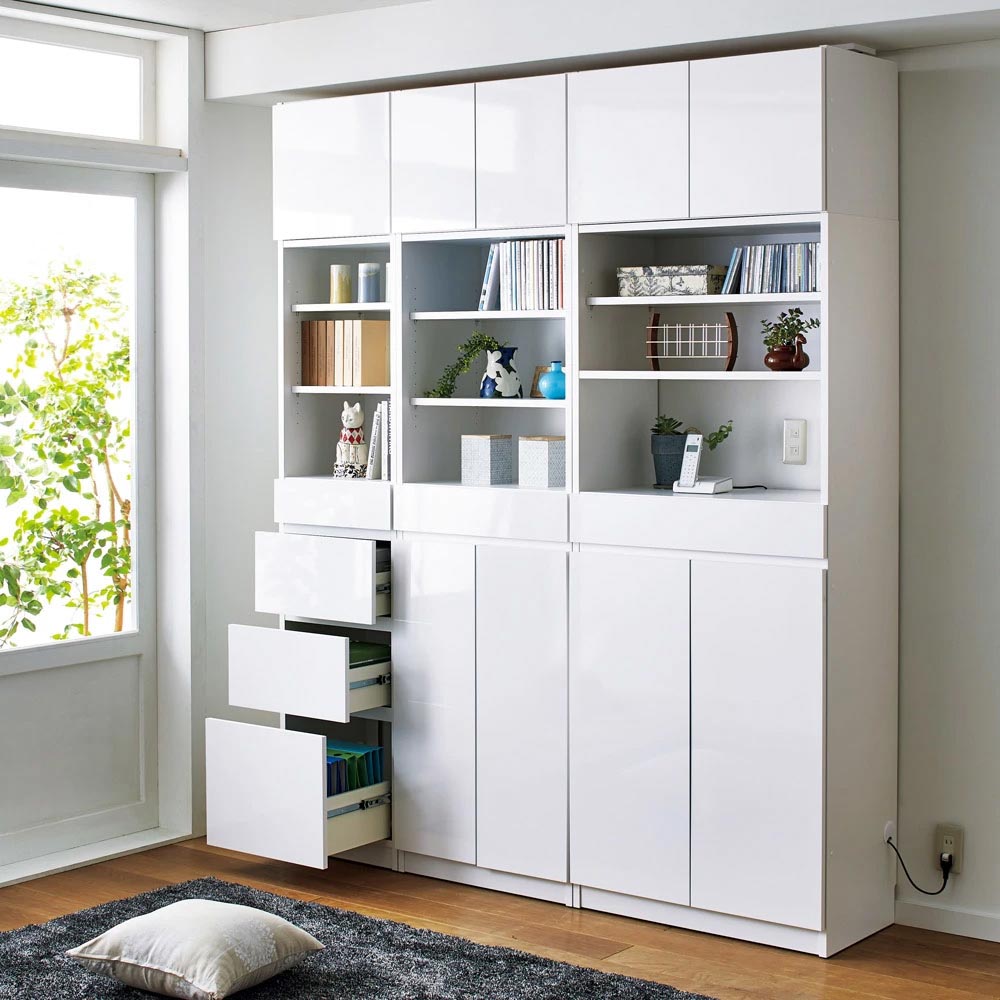 壁のスイッチ類を避けて設置でき、配線をすっきり隠せる壁面収納。突っ張り式上置き(別売り)は高さオーダーできるのでまるで造り付け。コードを隠しつつ、コンセントを活かす工夫も。壁のスイッチやインターフォン、コンセントを避けて、壁一面に収納を。収納を増やしたい!でも壁にスイッチ類があり窓下収納サイズしか置けない…というお悩みを解決!スイッチ避けタイプは電気のスイッチがある高さがオープンになっており、コンセントがある位置は背板をくり抜いているので壁にある物を気にせずに設置できます。また、ルーター、電源タップなどのコード類をすっきり隠せる工夫も満載。大量収納スペースが欲しくても置けなかった方のお悩みを解消できる収納庫です。リビングやダイニング、狭いコーナー、書斎、梁のある場所など家中のどんな場所にもフィットし、収納場所を造りながら簡単にお部屋の模様替えができます。設置したい場所にぴったり。上置きは高さ1cm単位でオーダーできるオーダー家具◆上置きは高さを30〜80cmの間で1cm単位でオーダーすることができます。◆天井高さ212cm〜262cmまで対応でき、スペースを有効活用できます。◆それぞれの設置したい場所にぴったり合わせて、まるで造り付けの収納のように。アイディア満載の細部にこだわった造り◆高さ110cmの位置にある、オープン部分。スイッチを避けられる仕様です。コレクションをディスプレイして飾り棚にも。◆オープン部の中天板は配線できる仕様。中天板奥にカキコミがあるので、電話台・FAX台としても大活躍。音楽プレーヤーやデジタルフォトフレームを飾っても◎◆背板のくりぬきで、コンセントをふさがない。コンセントをふさがず設置できるので、コードを隠して扉内で配線可能。中天板に置いた電子機器もこちらで配線可能です。◆側板に配線穴があり、設置後も配線ラクラク。側板の配線穴からコードを通せて、すっきり。◆スイッチ避けタイプ、収納庫タイプをご用意。オープン部のあるスイッチよけタイプとオープン部の無い収納庫タイプをご用意。スイッチの無い所には収納庫タイプを設置すればより大量収納ができますどちらにも扉タイプと引出タイプがあり、用途に合わせてお選びいただけます。◆引き出しは全段フルスライドレールで開閉ラクラク。スムーズに開けられる上に、探しやすいのもうれしいポイント。◆プッシュ扉ですっきり隠して。扉部分はプッシュ式で取っ手が無くシンプルな見た目です。耐久性抜群のブルム社スライドヒンジ搭載で高級感のある仕様です。◆3cmピッチ可動棚板で収納物に合わせて調整可能◎ピンを棚板に差し込むタイプの棚ダボで、外れや落下を防止します。本棚・CD収納としても。壁一面に並べて大量収納ブックシェルフ。キッチンにもなじむシンプルなデザインなので食器棚としても◎◆上下連結で耐震性向上。化粧キャップ付きボルト連結で、隙間やズレを抑えます。◆幅木よけカットで壁にぴったり設置。上置き以外のアイテムに巾木よけカットがあるので、壁につけておいて頂けます。選べるおしゃれな3色。理想のお部屋のイメージに合わせて。◆(ア)ホワイトはお部屋を選ばない、透明感のある美しい光沢感が魅力。清潔感あるキッチンインテリアにもお勧め。◆(イ)ライトアッシュは優しい色合いと木目柄が、ナチュラルモダンなインテリアにお勧め。モダンな北欧家具や北欧インテリアとマッチ。◆(ウ)ウォルナットははっきりとした天然木調が印象的。大人のシックなインテリアにぴったり。書斎で書棚使いも重厚感があり魅力的です。◆(エ)モードブラックはニュアンスを感じさせるテクスチャーが特長。洗練された黒を主役にすることで、都会的なお部屋を演出できます。安心と信頼の職人技が光る国産家具◆熟練の家具職人がひとつずつ丁寧に仕上げたワンランク上の壁面収納です。◆細部の丁寧な仕上がりなど日本製ならではの高品質な家具をお楽しみください。◆環境に配慮したF☆☆☆☆の材料を使用した商品です。