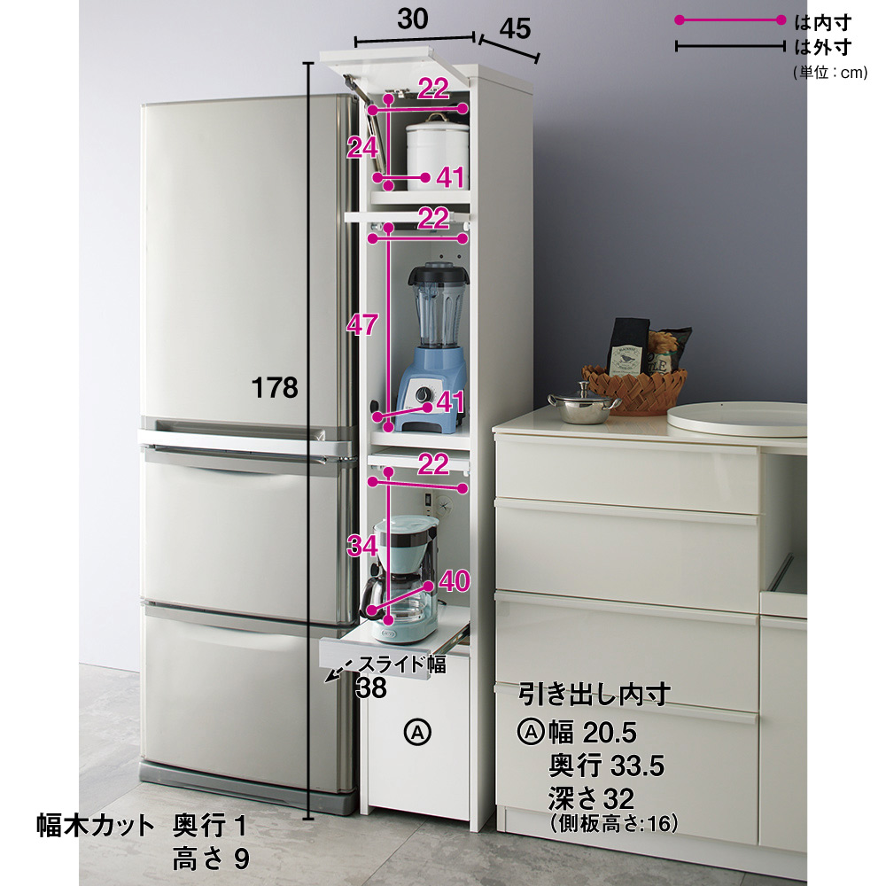 毎日使うキッチン家電、キッチン雑貨をすっきり目隠し。上品な光沢にアルミが映えるおしゃれなデザインと、多彩なサイズ展開がおすすめのポイントです。美しく清潔感のある光沢素材×アルミ素材のキッチン収納棚で収納物をすっきり目隠し。◆前面は光沢のある塗装で、水に強く拭き掃除もしやすいのがポイントです。◆食器はすっきり隠したいけど家電は使いやすく。そんな要望に応えるフラップ扉付きのおすすめキッチン収納棚です。使いやすさにこだわった安心の国産です。◆2、3段目の扉はフラップ式開けたままをキープできる構造。レンジを使う時などキッチンでの作業に便利です。◆最下段引き出しはフルスライドレール付きなので、奥まで開閉スムーズ。◆2口コンセント付きなので、家電収納時にきれいに配線できます。豊富なサイズラインナップ◆奥行は45cmと55cmの2タイプ。幅は30cm〜60cmまで5cm単位で7タイプご用意しています。◆狭いキッチンスペースでもゆったり使えるように扉は手前に引き出す構造です。