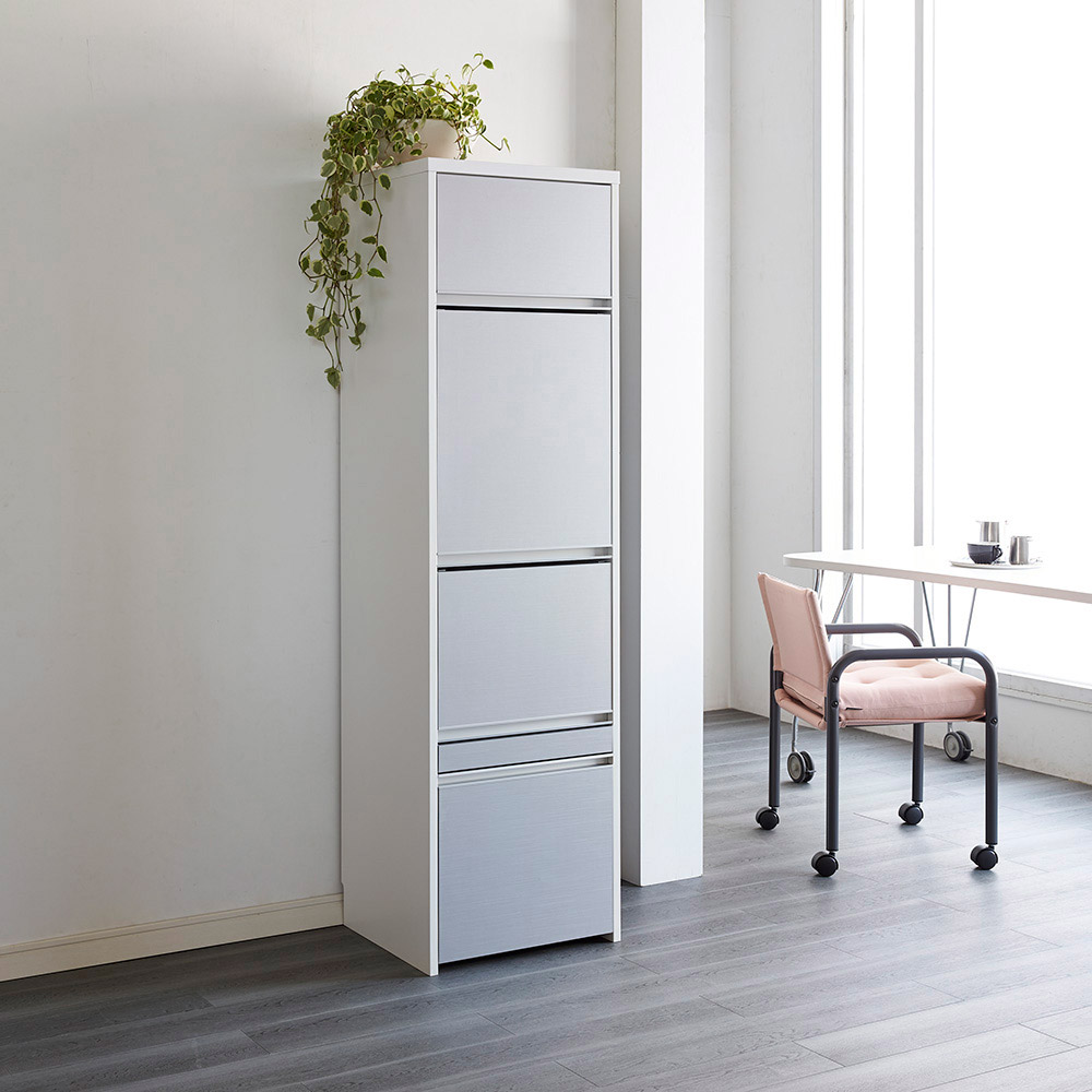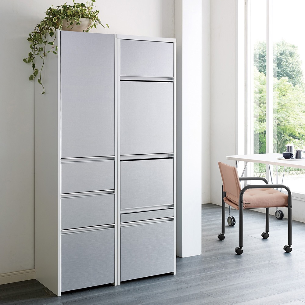 キッチン家電、キッチン雑貨をすっきり目隠し。上品な光沢にアルミが映えるおしゃれなデザインと、多彩なサイズ展開がおすすめのシリーズです。美しく清潔感のある光沢素材×アルミ素材収納物をすっきり目隠しできるキッチン収納◆前面は光沢のある素材で、水に強く拭き掃除もしやすいのがポイントです。◆家電を隠したいけど使いやすく。そんな要望に応えるフラップ扉のおすすめキッチン収納棚です。使いやすさにこだわった機能◆2、3段目の扉はフラップ式で開けたままをキープでき、キッチン作業に便利です。◆家電を使う時は開けたまま、来客時は扉を閉めれば家電を隠せます。◆引き出しはフルスライドレール仕様で奥まで開閉がスムーズです。◆引き出し内部は化粧仕上げ。汚れにも配慮した収納物に優しい仕様です。◆フラップ扉の家電収納部(2カ所)は2口コンセント付き。きれいに配線できます。◆巾木カットを施しているので壁にピッタリ寄せて設置できます。奥行・幅が選べる豊富なラインナップ◆奥行は45cmと55cmの2タイプをご用意。奥行55cmは大型電子レンジも収納可能。◆幅は40cm〜80cmまで10cm単位で5タイプご用意しています。◆狭いキッチンスペースでもゆったり使えるように扉は手前に引き出す構造です。造りもしっかり、安心の国産家具◆日本の家具職人が、一点一点心を込めて丁寧に仕上げております。◆組立不要。届いたらすぐに使える完成品なのも嬉しいポイント。◆日本製ですがお求めやすい価格帯なので、新生活にもおすすめです。