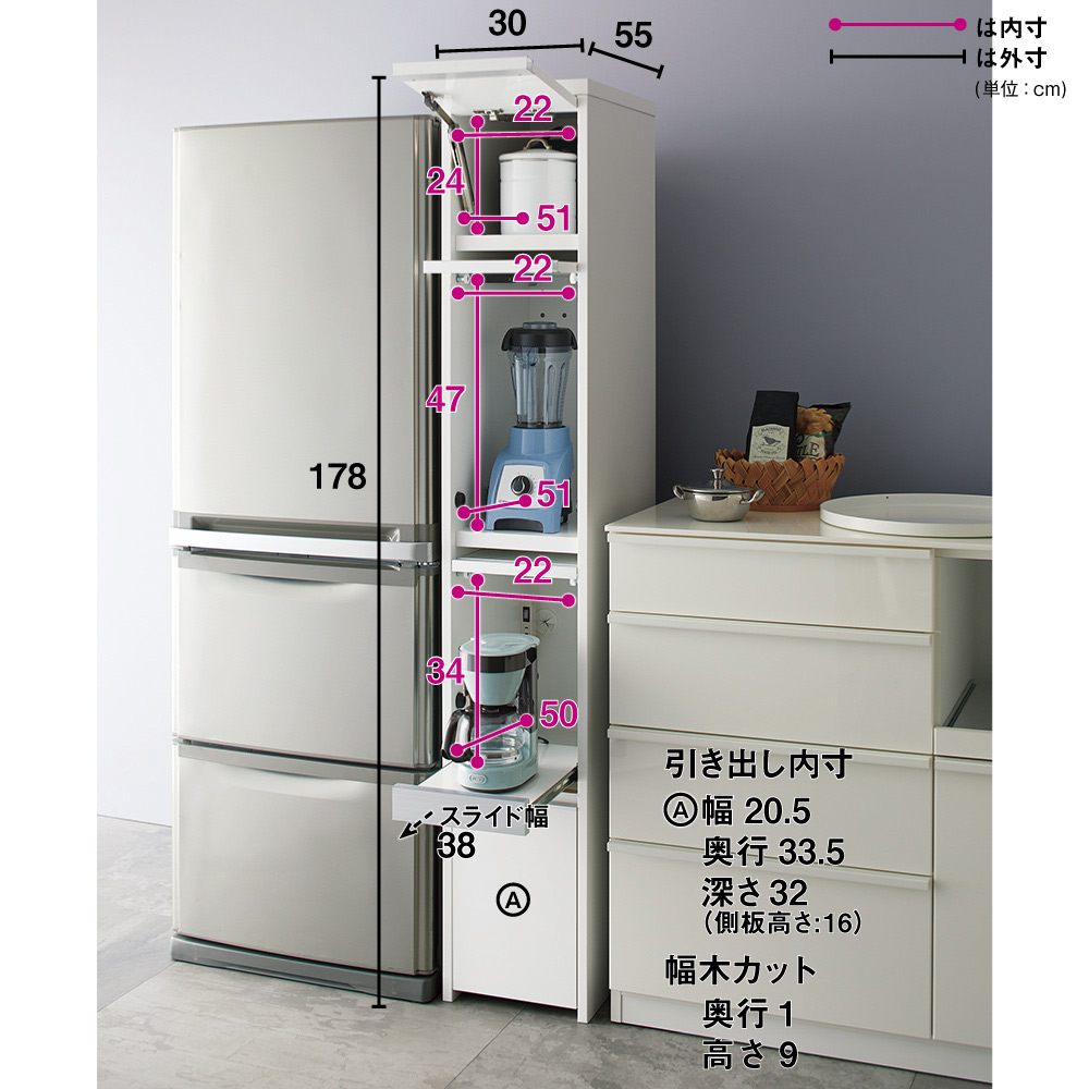 毎日使うキッチン家電、キッチン雑貨をすっきり目隠し。上品な光沢にアルミが映えるおしゃれなデザインと、多彩なサイズ展開がおすすめのポイントです。美しく清潔感のある光沢素材×アルミ素材のキッチン収納棚で収納物をすっきり目隠し。◆前面は光沢のある塗装で、水に強く拭き掃除もしやすいのがポイントです。◆食器はすっきり隠したいけど家電は使いやすく。そんな要望に応えるフラップ扉付きのおすすめキッチン収納棚です。使いやすさにこだわった安心の国産です。◆2、3段目の扉はフラップ式開けたままをキープできる構造。レンジを使う時などキッチンでの作業に便利です。◆最下段引き出しはフルスライドレール付きなので、奥まで開閉スムーズ。◆2口コンセント付きなので、家電収納時にきれいに配線できます。豊富なサイズラインナップ◆奥行は45cmと55cmの2タイプ。幅は30cm〜60cmまで5cm単位で7タイプご用意しています。◆狭いキッチンスペースでもゆったり使えるように扉は手前に引き出す構造です。