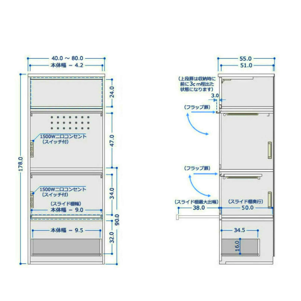キッチン家電、キッチン雑貨をすっきり目隠し。上品な光沢にアルミが映えるおしゃれなデザインと、多彩なサイズ展開がおすすめのシリーズです。美しく清潔感のある光沢素材×アルミ素材収納物をすっきり目隠しできるキッチン収納◆前面は光沢のある素材で、水に強く拭き掃除もしやすいのがポイントです。◆家電を隠したいけど使いやすく。そんな要望に応えるフラップ扉のおすすめキッチン収納棚です。使いやすさにこだわった機能◆2、3段目の扉はフラップ式で開けたままをキープでき、キッチン作業に便利です。◆家電を使う時は開けたまま、来客時は扉を閉めれば家電を隠せます。◆引き出しはフルスライドレール仕様で奥まで開閉がスムーズです。◆引き出し内部は化粧仕上げ。汚れにも配慮した収納物に優しい仕様です。◆フラップ扉の家電収納部(2カ所)は2口コンセント付き。きれいに配線できます。◆巾木カットを施しているので壁にピッタリ寄せて設置できます。奥行・幅が選べる豊富なラインナップ◆奥行は45cmと55cmの2タイプをご用意。奥行55cmは大型電子レンジも収納可能。◆幅は40cm〜80cmまで10cm単位で5タイプご用意しています。◆狭いキッチンスペースでもゆったり使えるように扉は手前に引き出す構造です。造りもしっかり、安心の国産家具◆日本の家具職人が、一点一点心を込めて丁寧に仕上げております。◆組立不要。届いたらすぐに使える完成品なのも嬉しいポイント。◆日本製ですがお求めやすい価格帯なので、新生活にもおすすめです。