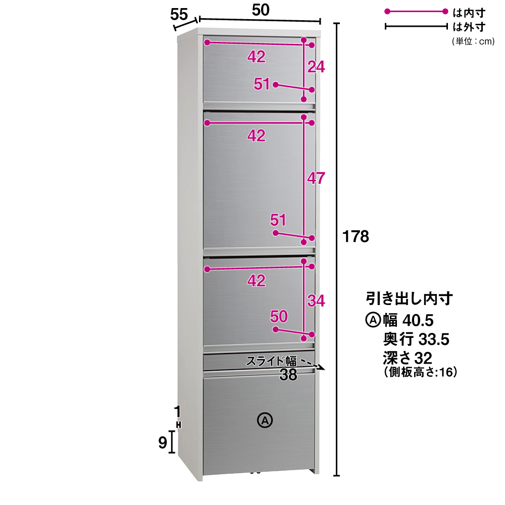 引き出しはフルスライドレール付きで、奥まで開閉スムーズ。