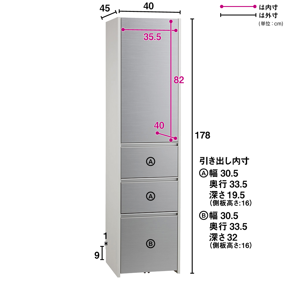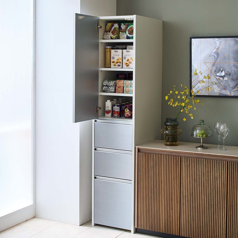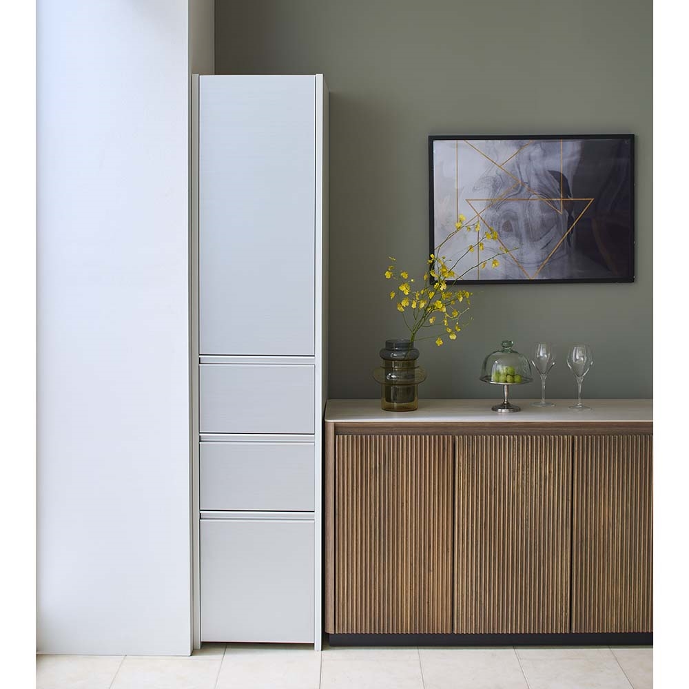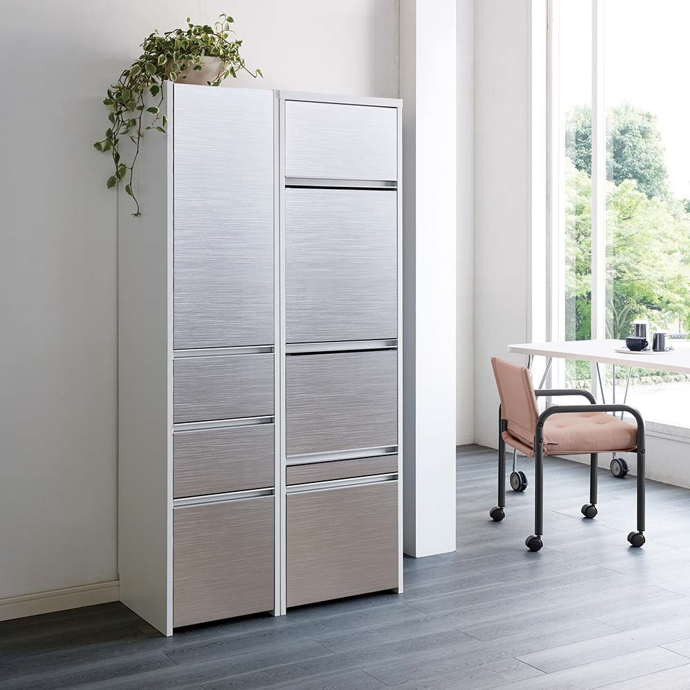 キッチン家電、キッチン雑貨をすっきり目隠し。上品な光沢にアルミが映えるおしゃれなデザインと、多彩なサイズ展開がおすすめのシリーズです。美しく清潔感のある光沢素材×アルミ素材収納物をすっきり目隠しできるキッチン収納◆前面は光沢のある素材で、水に強く拭き掃除もしやすいのがポイントです。◆食器やキッチンアイテム、食品ストックまで大量に収納できる食器棚です。使いやすさにこだわった機能◆扉はプッシュ式で簡単に開閉ができます。耐震ラッチ付きで地震対策も。◆引き出しは全段フルスライドレール仕様で奥まで開閉がスムーズです。◆引き出し内部は化粧仕上げ。汚れにも配慮した収納物に優しい仕様です。◆巾木カットを施しているので壁にピッタリ寄せて設置できます。奥行・幅が選べる豊富なラインナップ◆奥行は45cmと55cmの2タイプをご用意。◆幅は40cm〜80cmまで10cm単位で5タイプご用意しています。◆狭いキッチンスペースでもゆったり使えるように扉は手前に引き出す構造です。造りもしっかり、安心の国産家具◆日本の家具職人が、一点一点心を込めて丁寧に仕上げております。◆組立不要。届いたらすぐに使える完成品なのも嬉しいポイント。◆日本製ですがお求めやすい価格帯なので、新生活にもおすすめです。
