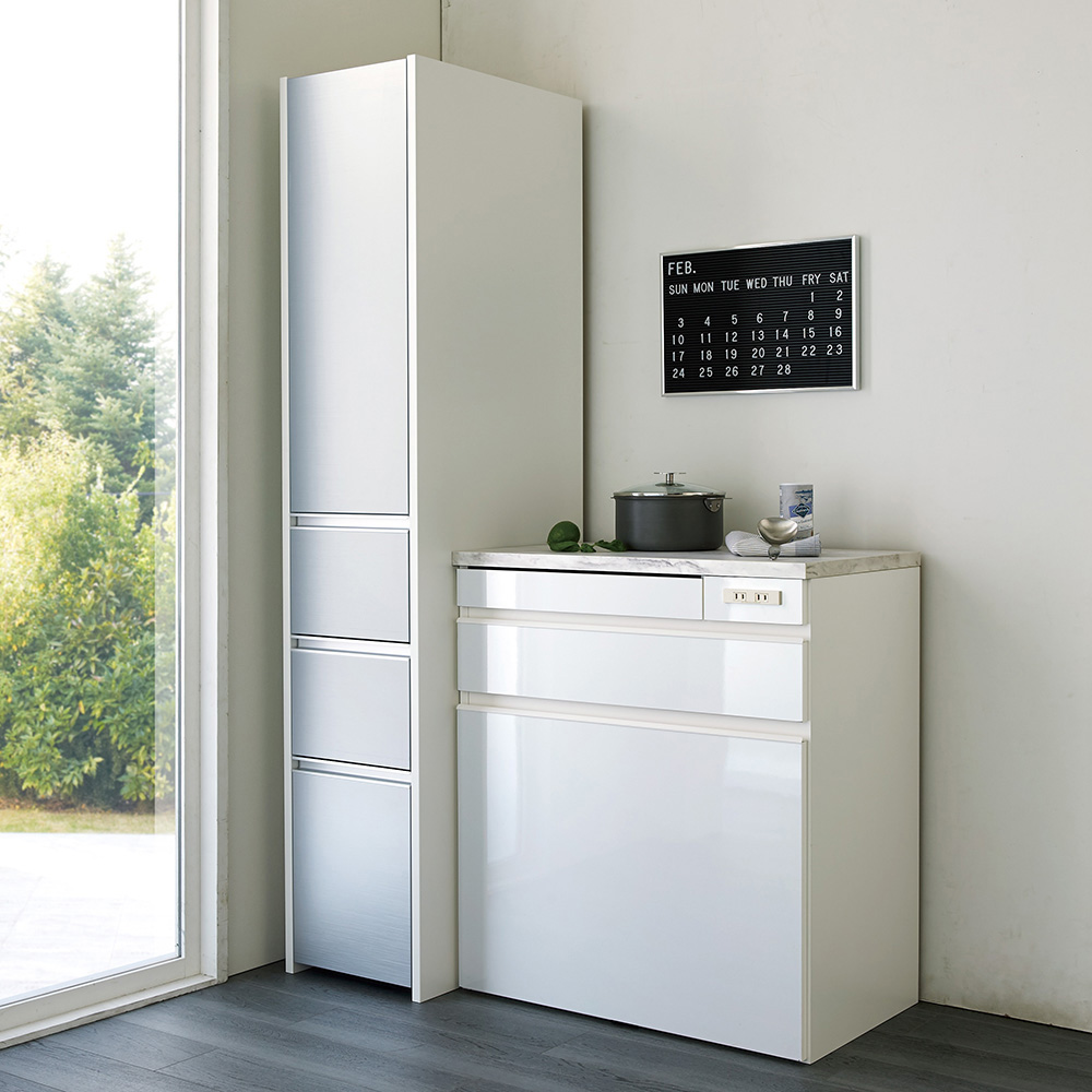 上品な光沢にアルミが映えるスタイリッシュなデザインと、多彩なサイズ展開が魅力のシリーズ。毎日使うキッチン家電を隠して収納できる家電収納に加え、ストックやお皿をスマートに収納できるストッカータイプが登場しました。