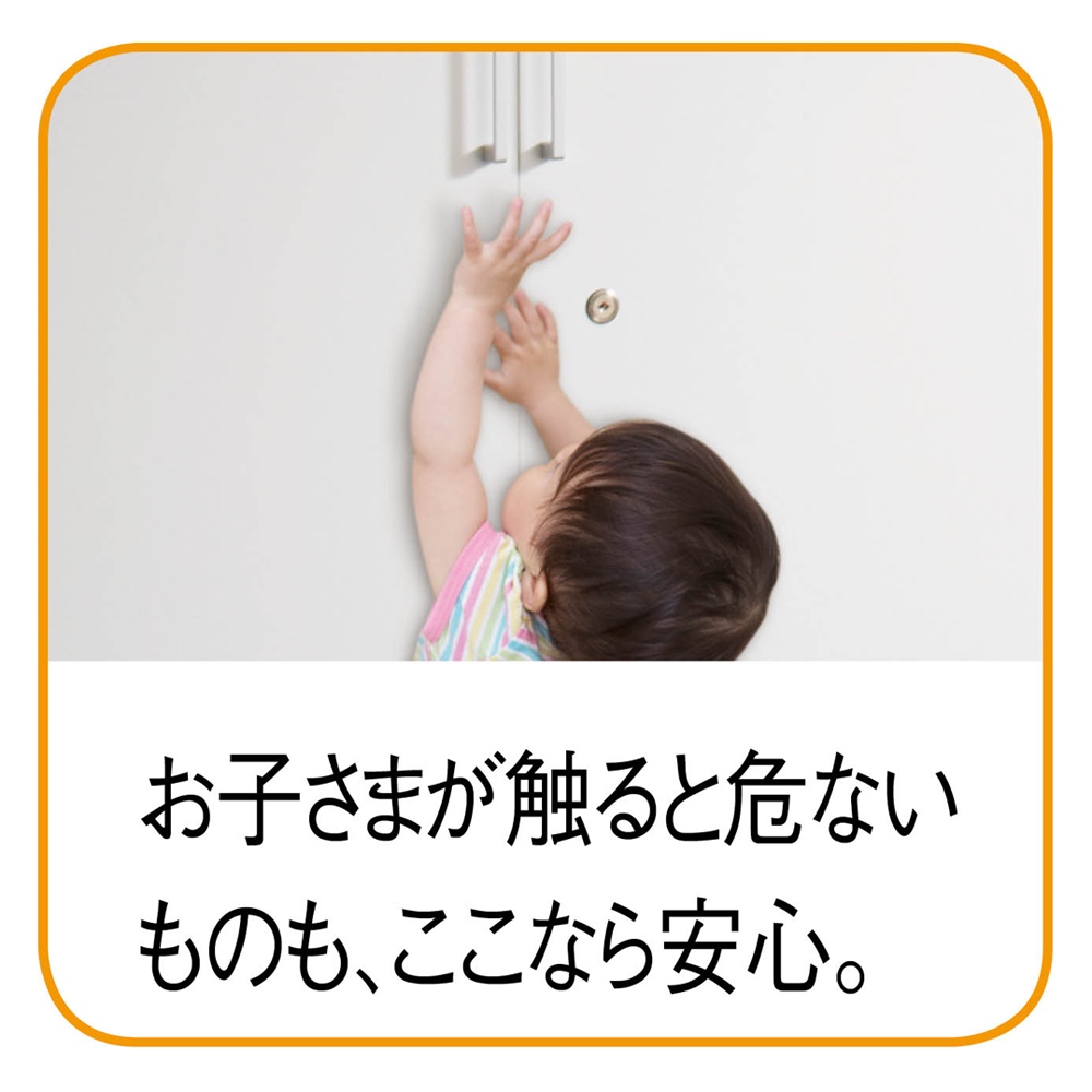 【鍵付きのメリット1】小さなお子様が扉を開けられないようにしっかりロック。触ると危険な乾電池や裁縫セット、はさみやカッターなどの収納に。