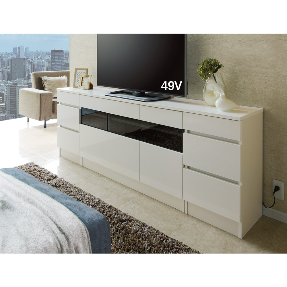 統一感のあるデザインで、テレビ視聴も在宅ワークも叶えるシリーズのテレビ台。奥行35cmの薄型だから、リビングにも圧迫感なく設置できます。テレビもテレワークも収納もおまかせのユニット。シリーズを組み合わせて機能的な美空間を!●同シリーズでレイアウトすることで、テレビとワークスペースの一体化が叶い、ホテルのような洗練された空間がつくれます。●テレビ台は幅80.5cm・幅120.5cm・幅160.5cmの3サイズをご用意。お部屋の広さやテレビサイズに合わせて選べます。●デスクは幅が1cm単位でオーダーでき、限られたスペースにぴったり設置が可能。「70cm〜90cm」と「91cm〜120cm」の2タイプをご用意。●チェストは狭い場所にも置きやすい幅40.5cmのスリムサイズ。3段の引き出しに、文具や書類・ゲームソフトなどさまざまな物がきれいに整理できます。●キャビネットは幅60.5cm・幅80.5cm・幅120.5cmの3サイズをご用意。設置場所や収納量で選べます。引き出し付きなので、細々したものも整理できます。テレビが見やすく、おしゃれなデザイン●ライン状にあしらったアクリルがアクセント。シンプルなのに品よくスタイリッシュな佇まいです。●スリムな幅80.5cm。寝室や書斎にも置きやすく、32Vまでのテレビに対応します。●ダイニングチェアやベッドから、またソファに座ってテレビを見るのに適した高さ70cm。奥行35cmの薄型だから圧迫感もなく、お部屋を広く使えます。●シリーズのサイズオーダーデスク・チェスト・キャビネットと同じ高さ・奥行なので、見映えよく並べられます。収納スペースも充実、使いやすい工夫も!●天板下は扉付きの棚仕様。たっぷり入り、散らかりがちなリビングも整然と片付きます。可動棚2枚付きで、棚板は3cm間隔・11段階に高さ調節できます。●テレビ下に収納を充実させることで、よく使う物を他の部屋にいちいち取りに行かなくて済むというメリットもあります。●扉は軽く押すと開くプッシュ式。開閉がラクで見た目もスマートです。●デッキ収納部はライン状にアクリル貼りで、扉を閉じたままリモコン操作ができます。また、扉内背板にはコード穴付きで、配線もすっきり。お部屋のインテリアに合わせて6色から選べます色は(ア)ホワイト(光沢) (イ)ブラック(光沢) (ウ)ナチュラルオーク (エ)ダークオーク(オ)セピアウォルナット (カ)グレーウォルナット の6カラーをご用意しました。●(ア)(イ)は光沢仕上げで(ウ)〜(カ)は風合いのある木目シートを使用。●汚れに強く、お手入れも簡単な素材です。●ホルムアルデヒドの発生を最小限に抑えたグレードの素材(F☆☆☆☆合板・塗料・接着剤)を主材にした商品です。●丈夫で丁寧なつくりの日本製です。●組み立て不要の完成品でお届けしますので、届いたらすぐにご使用いただけます。シリーズ商品のご案内「省スペースホテルライク ハイタイプテレビ台シリーズ」は以下のシリーズ商品がございます。・テレビ台幅80.5cm・テレビ台幅120.5cm・テレビ台幅160.5cm・幅サイズオーダーデスク幅70〜90cm・幅サイズオーダーデスク幅91〜120cm・チェスト幅40.5cm・キャビネット幅60.5cm・キャビネット幅80.5cm・キャビネット幅120.5cm