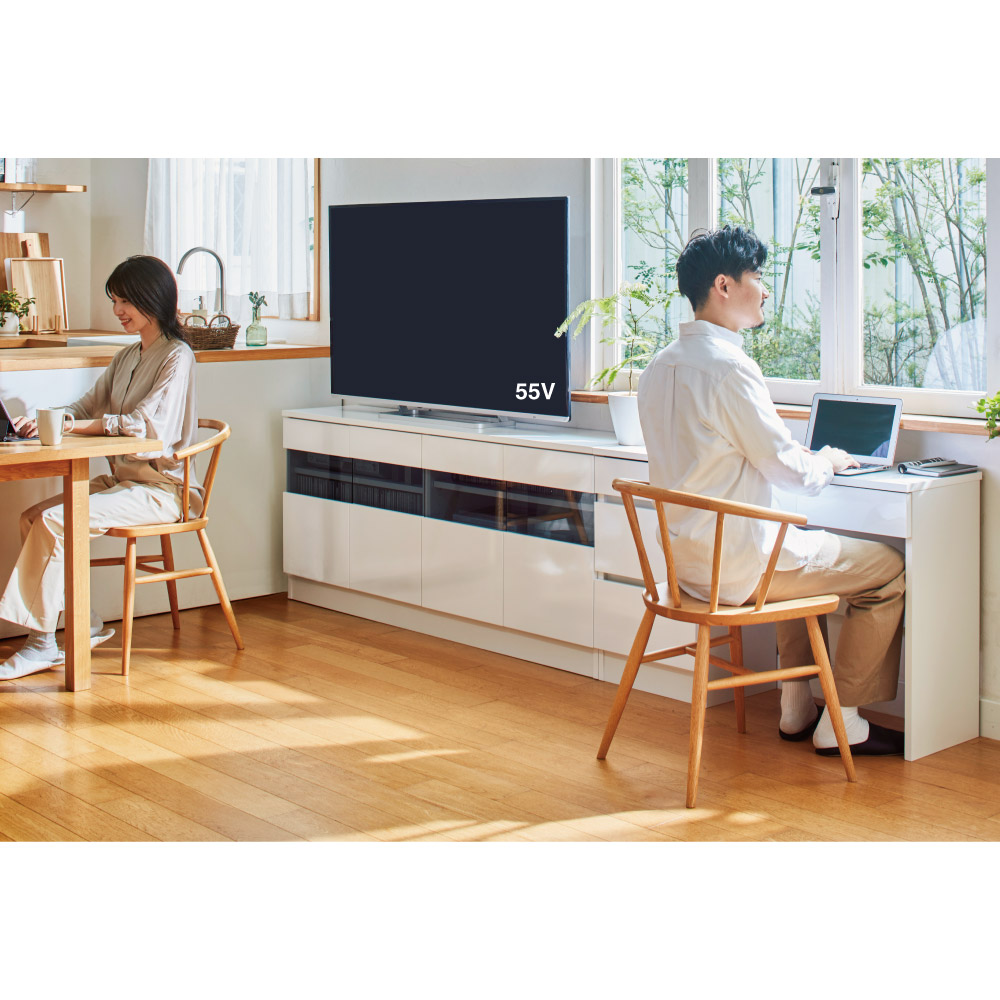 コーディネート例(ア)ホワイト光沢 リビングに個別のワークスペースが作れます。 ※お届けは写真左のテレビ台・幅160.5cmタイプです。