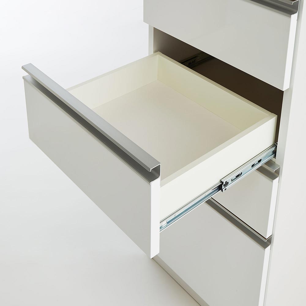 引出しのハンドルはアルミ製。水汚れがふき取りやすく清潔を保ちやすい素材です。