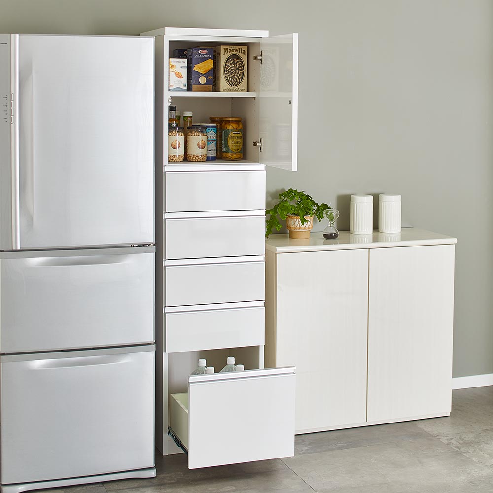 隙間を有効活用できるキッチン収納家具。丁寧なつくりが魅力。幅は15、20、25、30、35、40、45cmの7サイズ、奥行は45と55cmの2サイズをご用意。引き出し5段タイプは小引き出しを多く設け、スパイス類や細々した調理器具をより多く、整理整頓しやすいよう設計しています。キッチンのすき間を有効活用できるすき間収納シリーズ■散らかりがちなキッチン雑貨を整理できる収納家具を、サイズ豊富にご用意しました。■高さは冷蔵庫横や食器棚横に合わせやすい178cm。■一般的なすき間収納よりも扉付きの棚収納部分を減らし、引出を多く設けることで細かいものを整理整頓しやすい設計に。■調理雑貨やスパイス類のストック等の収納に便利なタイプです。■幅は15、20、25、30、35、40、45cmの7タイプ、奥行は45cmと55cmの2タイプから、ぴったりのサイズをお選びいただけます。■シンクサイドに設置すれば作業スペースが広がります。細部まで使いやすさにこだわった、国産家具のキッチン収納■前面は光沢感があり見た目にも美しいデザイン。■前面は傷が付きにくく汚れにも強いポリエステル化粧合板、側板にはクリーンイーゴス化粧合板を使用。■気になる汚れもサッとひと拭きでき清潔感を保ちます。■取っ手にはアルミを採用し、高級感と耐久性が感じられるデザインに。■上4段にはスライドレールを、下段深引き出しには奥のものが取り出しやすいフルスライドレールを採用しました。■引き出し内部も化粧を施し、美しく傷にも強い仕上がりです。幅木よけ仕様だから壁にぴったりとつけて設置できます。■上段の扉は両手がふさがっているときでもラクに開閉できるプッシュ式です。職人技が光る、安心の日本製■熟練の家具職人が、一点一点心をこめて丁寧に仕上げております。■長く使うものだから、造りのしっかりした収納家具をお求めください。面倒な組み立てのいらない完成品■組み立て不要の完成商品でのお届けになります。届いたその日からすぐにご使用いただけます。