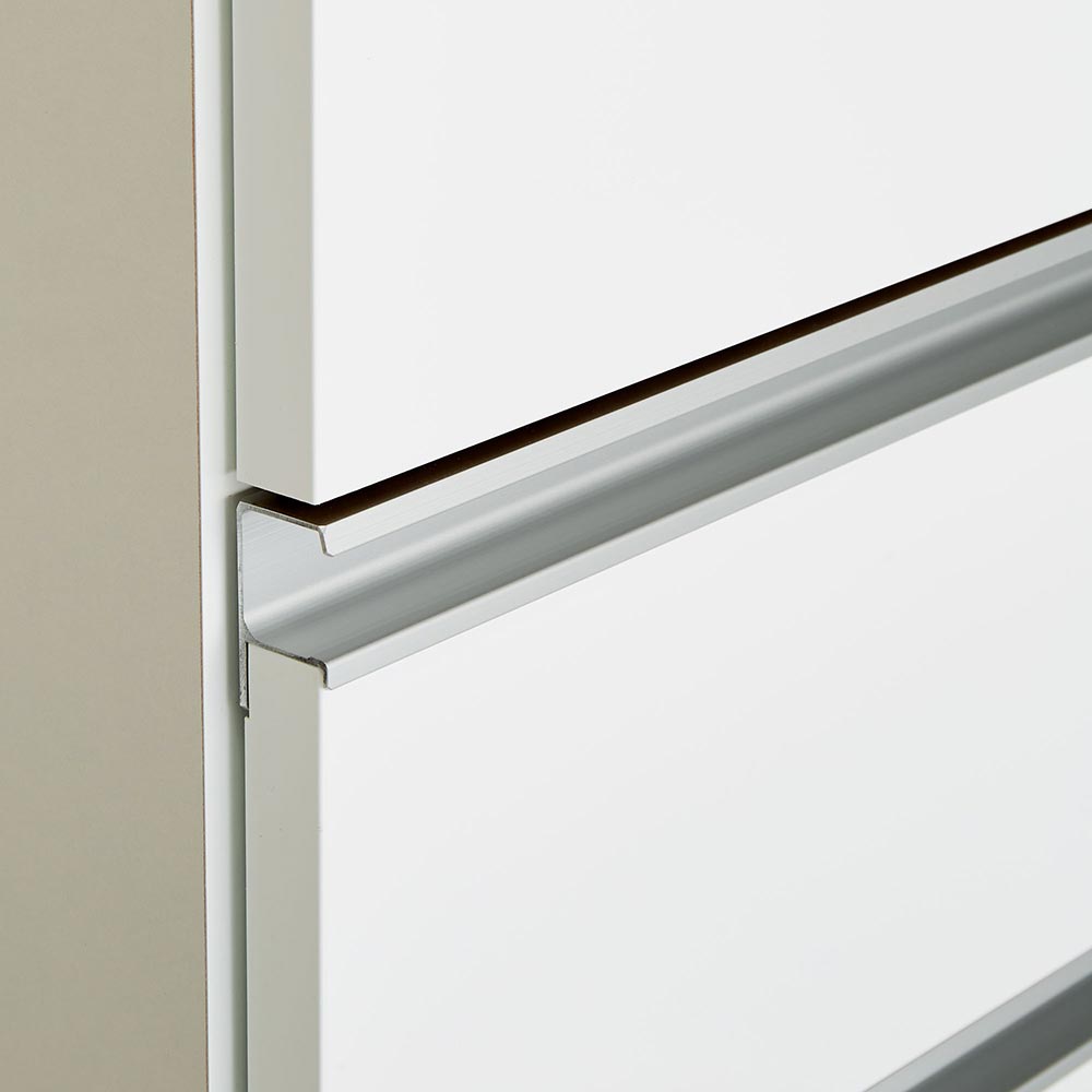 引出しのハンドルはアルミ製。水汚れがふき取りやすく清潔を保ちやすい素材です。