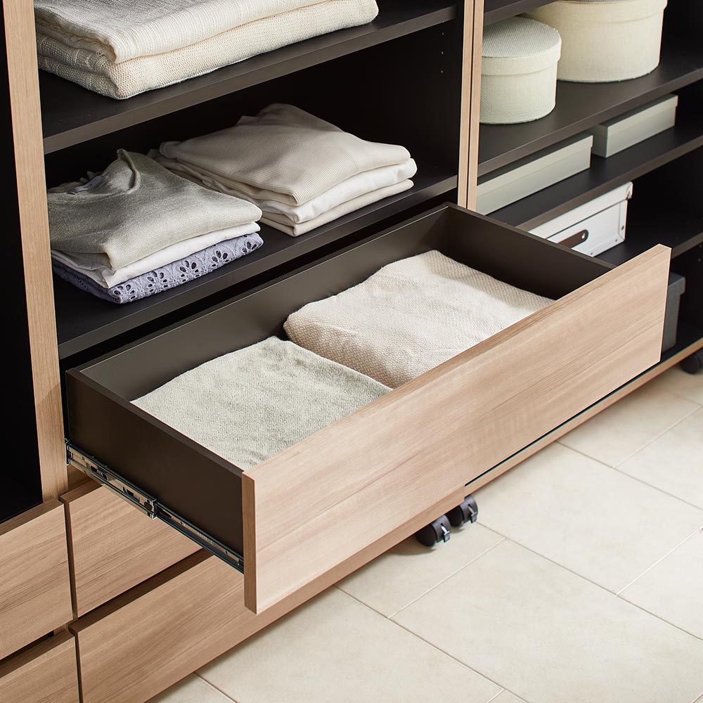引き出しの内側もブラックカラーでおしゃれ。下着や靴下、ファッション小物などは、引き出しにたたんで収納できます。(引き出し内寸奥行33.6cm高さ13cm)