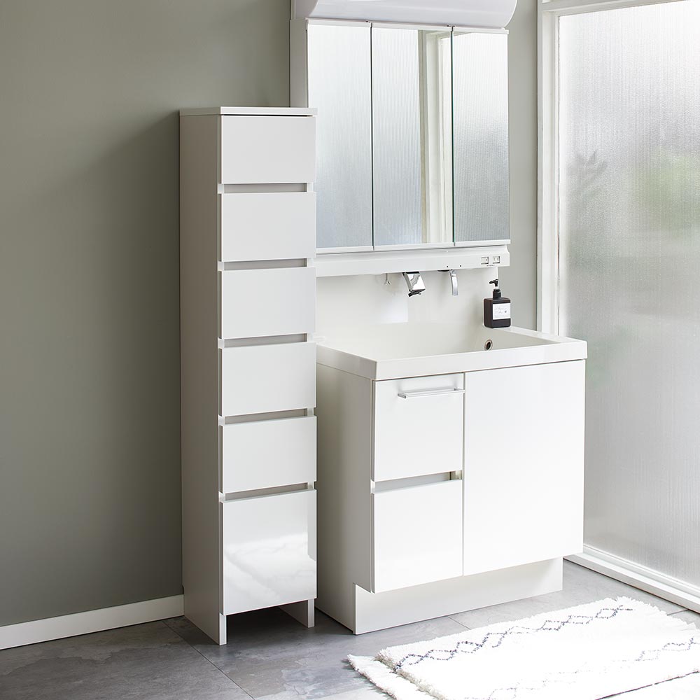 狭いランドリーにも置けるスリムなモダンデザイン。わずかなすき間を有効活用して分類収納できるから、すっきりとモデルルームのような褒められサニタリーに。アイテム別、家族別に洗濯物を分類収納できるので、脱衣所を効率化したい時短派にぴったりです。すき間を有効活用できるサイズバリエーション●高さ86cm(3段):洗面台横にぴったりの高さ●高さ107.5cm(4段):洗濯機横にぴったりの高さ●高さ150cm(6段):小柄な女性でも無理なく引き出せる高さ幅は30・45cm、奥行は30・40cmからそれぞれ選べます。アイテム別、家族別に洗濯物を分類収納引き出しの中身は衣類やタオルをいつでも清潔に保てるよう、すべてに内部化粧が施してあります。下着などもひっかかりなく大切にしまえます。アイテム別、家族別に洗濯物を分類収納できるので、脱衣所を効率化したい時短派にぴったりです!●浅引き出し:タオルや家族分の下着やパジャマなど●深引き出し(最下段のみ):洗剤の詰め替えパックやスプレー類など 背の高いボトル類も立てて収納できます。こだわりのサニタリーに似合う、スリムなモダンデザイントレンドのモルタルや石目調のこだわりのサニタリーにも似合う石目柄ダークグレーも加えた全3色のカラーバリエーション。さらに取っ手レスでスマートな印象に仕上げました。また全ての天板・前面は水ハネにも耐える素材を使用しているので、汚れてもサッと拭くだけでお手入れも簡単!洗濯機近くや洗面台の隣でも安心してお使いいただけます。安心と信頼の国内生産品日本の熟練の家具職人がひとつずつ丁寧に仕上げたワンランク上の商品です。国産家具だからこその丁寧な仕上がりにより、安心して長くお楽しみいただけます。面倒な組み立てのない完成商品商品は、組立不要の完成品でお届けします。届いたらすぐにご利用いただけるのも嬉しいポイントです。
