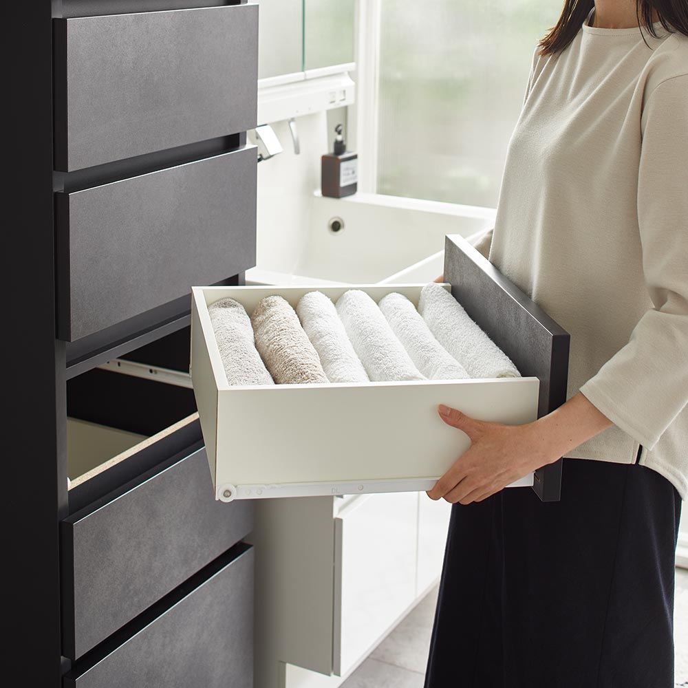 狭いランドリーにも置けるスリムなモダンデザイン。わずかなすき間を有効活用して分類収納できるから、すっきりとモデルルームのような褒められサニタリーに。アイテム別、家族別に洗濯物を分類収納できるので、脱衣所を効率化したい時短派にぴったりです。すき間を有効活用できるサイズバリエーション●高さ86cm(3段):洗面台横にぴったりの高さ●高さ107.5cm(4段):洗濯機横にぴったりの高さ●高さ150cm(6段):小柄な女性でも無理なく引き出せる高さ幅は30・45cm、奥行は30・40cmからそれぞれ選べます。アイテム別、家族別に洗濯物を分類収納引き出しの中身は衣類やタオルをいつでも清潔に保てるよう、すべてに内部化粧が施してあります。下着などもひっかかりなく大切にしまえます。アイテム別、家族別に洗濯物を分類収納できるので、脱衣所を効率化したい時短派にぴったりです!●浅引き出し:タオルや家族分の下着やパジャマなど●深引き出し(最下段のみ):洗剤の詰め替えパックやスプレー類など 背の高いボトル類も立てて収納できます。こだわりのサニタリーに似合う、スリムなモダンデザイントレンドのモルタルや石目調のこだわりのサニタリーにも似合う石目柄ダークグレーも加えた全3色のカラーバリエーション。さらに取っ手レスでスマートな印象に仕上げました。また全ての天板・前面は水ハネにも耐える素材を使用しているので、汚れてもサッと拭くだけでお手入れも簡単!洗濯機近くや洗面台の隣でも安心してお使いいただけます。安心と信頼の国内生産品日本の熟練の家具職人がひとつずつ丁寧に仕上げたワンランク上の商品です。国産家具だからこその丁寧な仕上がりにより、安心して長くお楽しみいただけます。面倒な組み立てのない完成商品商品は、組立不要の完成品でお届けします。届いたらすぐにご利用いただけるのも嬉しいポイントです。