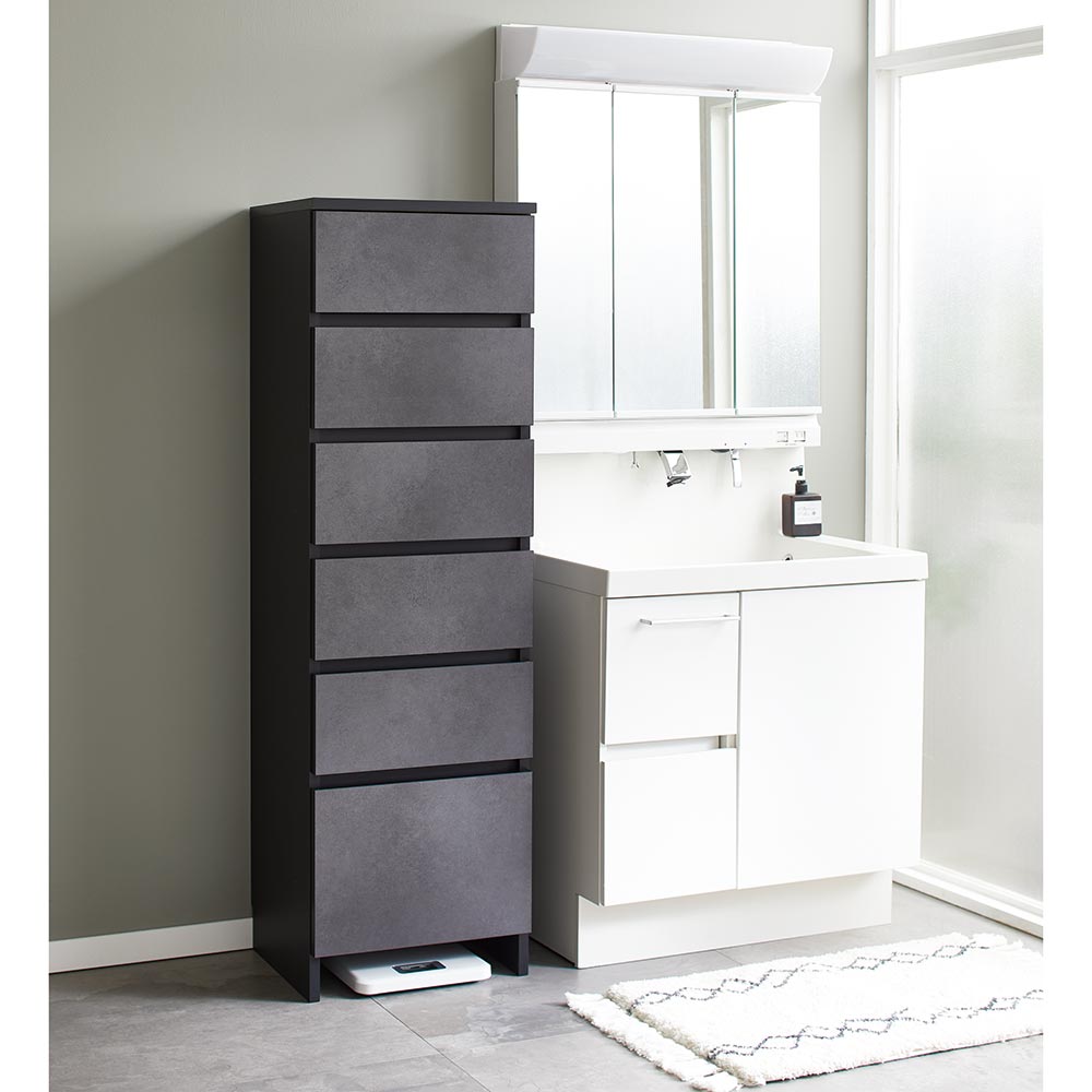狭いランドリーにも置けるスリムなモダンデザイン。わずかなすき間を有効活用して分類収納できるから、すっきりとモデルルームのような褒められサニタリーに。アイテム別、家族別に洗濯物を分類収納できるので、脱衣所を効率化したい時短派にぴったりです。すき間を有効活用できるサイズバリエーション●高さ86cm(3段):洗面台横にぴったりの高さ●高さ107.5cm(4段):洗濯機横にぴったりの高さ●高さ150cm(6段):小柄な女性でも無理なく引き出せる高さ幅は30・45cm、奥行は30・40cmからそれぞれ選べます。アイテム別、家族別に洗濯物を分類収納引き出しの中身は衣類やタオルをいつでも清潔に保てるよう、すべてに内部化粧が施してあります。下着などもひっかかりなく大切にしまえます。アイテム別、家族別に洗濯物を分類収納できるので、脱衣所を効率化したい時短派にぴったりです!●浅引き出し:タオルや家族分の下着やパジャマなど●深引き出し(最下段のみ):洗剤の詰め替えパックやスプレー類など 背の高いボトル類も立てて収納できます。こだわりのサニタリーに似合う、スリムなモダンデザイントレンドのモルタルや石目調のこだわりのサニタリーにも似合う石目柄ダークグレーも加えた全3色のカラーバリエーション。さらに取っ手レスでスマートな印象に仕上げました。また全ての天板・前面は水ハネにも耐える素材を使用しているので、汚れてもサッと拭くだけでお手入れも簡単!洗濯機近くや洗面台の隣でも安心してお使いいただけます。安心と信頼の国内生産品日本の熟練の家具職人がひとつずつ丁寧に仕上げたワンランク上の商品です。国産家具だからこその丁寧な仕上がりにより、安心して長くお楽しみいただけます。面倒な組み立てのない完成商品商品は、組立不要の完成品でお届けします。届いたらすぐにご利用いただけるのも嬉しいポイントです。