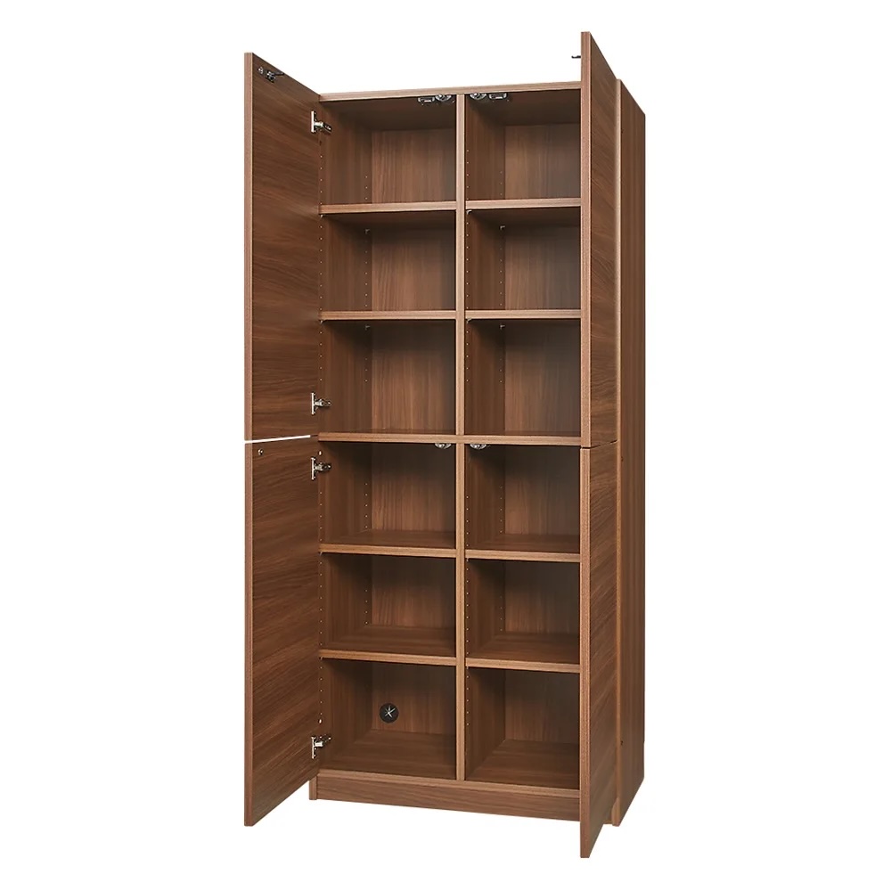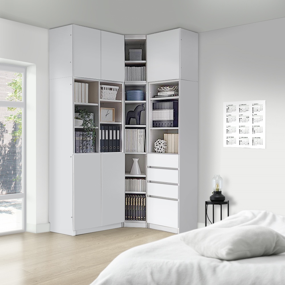 部屋のコーナーまで有効活用できる本棚シリーズ!奥行2タイプ・6色から選べる贅沢仕様の収納庫。コーナーまで逃さず収納スペースに!統一された美しい収納空間を作れます。■インコーナーがあることで、平面の収納だけでなく、 部屋のスペース余すことなく収納に変えられます。■本に囲まれた図書館のような空間が実現する本棚シリーズです。幅1cm単位のサイズオーダーだからスペースぴったりに!!リフォームしたみたいに美しい本棚■30〜59cmの間で幅オーダー出来るぴったりの収納をお届けします。(幅60/80の決め打ちサイズも販売。コーナータイプは幅30cmのみの展開です)■高さオーダーの上置きも併用することで天井までぴったり余すことなく収納に! 高さ30〜80cmまでオーダー1cm単位オーダー出来ます。豊富なバリエーションから選べるから収納物に合わせてセレクト【オープンタイプ】本の他にも写真やオブジェを飾ってディスプレイに!【上オープン下扉タイプ】飾りたいものと隠すものを分類して収納できます。【上下扉タイプ】本以外に日用品や季節家電等もまとめて目隠し収納できます。【上オープン下引き出しタイプ】細々したリビング小物を分類収納するのには引き出しタイプが便利です。【コーナータイプ】コーナーまで余すことなく使いたい、統一したインテリアで部屋を囲みたい方には欠かせないアイテムです。選べる奥行32・42cm奥行は選べる2種類。本をメインに収納したい方には薄型の奥行32cmを、日用品ストック等まとめて収納したい方には奥行42cmタイプがおすすめです。収納する物に合わせてお選びください。選べる6色展開!光沢ホワイト、ホワイトシカモア、ナチュラルオーク、ブラックウォルナット、グレイウォルナット、モードブラック。部屋のテイストに合わせて選べる豊富な色展開です。ここがすごい!!届いてすぐ使える完成品。組み立てる必要のない「完成品」の家具。兵庫県の工場で職人がプレス機などを使用して丁寧に組み立てますので、丈夫で耐久性に優れています。材料と耐久性を考慮しており、小さくても細くても重厚感があります。手間なく安心、届いてすぐに使えるというのも大きな魅力のひとつです。安心の材料、安心の国産家具家具の主材料である木質素材(MDF・パーチクルボード・ラワン合板等)はもちろん、接着剤に至るまで、ホルムアルデヒドの発散量が極めて少なく、高い安全性を示すF☆☆☆☆(Fフォースター)規格品を使用。シックハウス症候群などからお客様の健康をお守りします。嬉しい気配りが満載棚板の裏にはすき間があり、棚の上段に家電を設置しても下部の配線穴までコードを通せます。巾木やコードを逃がす為の巾木カットしているので壁にぴったり設置できます。