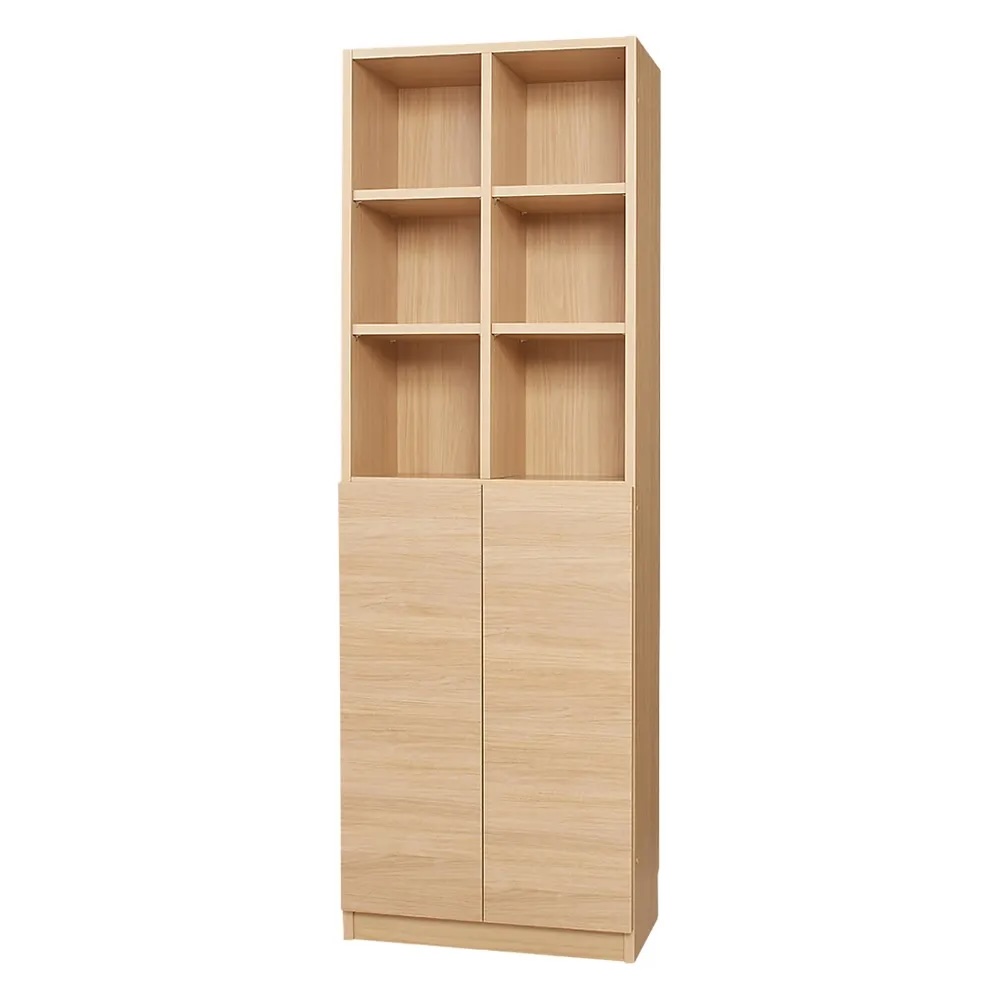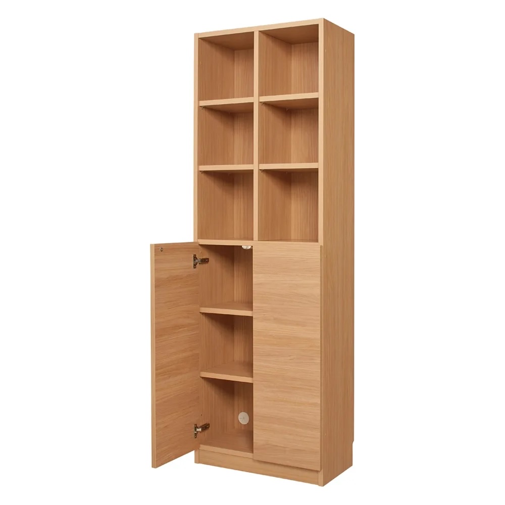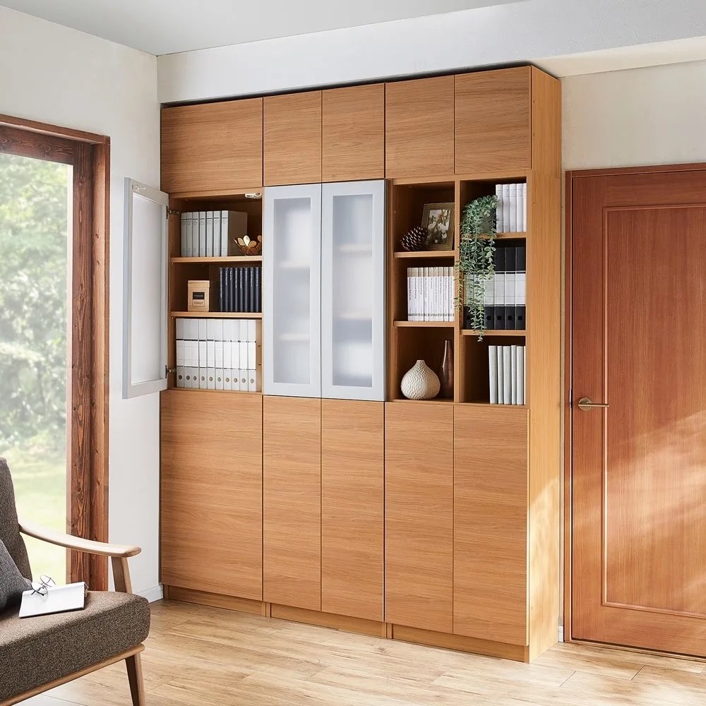 部屋のコーナーまで有効活用できる本棚シリーズ!奥行2タイプ・6色から選べる贅沢仕様の収納庫。コーナーまで逃さず収納スペースに!統一された美しい収納空間を作れます。■インコーナーがあることで、平面の収納だけでなく、 部屋のスペース余すことなく収納に変えられます。■本に囲まれた図書館のような空間が実現する本棚シリーズです。幅1cm単位のサイズオーダーだからスペースぴったりに!!リフォームしたみたいに美しい本棚■30〜59cmの間で幅オーダー出来るぴったりの収納をお届けします。(幅60/80の決め打ちサイズも販売。コーナータイプは幅30cmのみの展開です)■高さオーダーの上置きも併用することで天井までぴったり余すことなく収納に! 高さ30〜80cmまでオーダー1cm単位オーダー出来ます。豊富なバリエーションから選べるから収納物に合わせてセレクト【オープンタイプ】本の他にも写真やオブジェを飾ってディスプレイに!【上オープン下扉タイプ】飾りたいものと隠すものを分類して収納できます。【上下扉タイプ】本以外に日用品や季節家電等もまとめて目隠し収納できます。【上オープン下引き出しタイプ】細々したリビング小物を分類収納するのには引き出しタイプが便利です。【コーナータイプ】コーナーまで余すことなく使いたい、統一したインテリアで部屋を囲みたい方には欠かせないアイテムです。選べる奥行32・42cm奥行は選べる2種類。本をメインに収納したい方には薄型の奥行32cmを、日用品ストック等まとめて収納したい方には奥行42cmタイプがおすすめです。収納する物に合わせてお選びください。選べる6色展開!光沢ホワイト、ホワイトシカモア、ナチュラルオーク、ブラックウォルナット、グレイウォルナット、モードブラック。部屋のテイストに合わせて選べる豊富な色展開です。ここがすごい!!届いてすぐ使える完成品。組み立てる必要のない「完成品」の家具。兵庫県の工場で職人がプレス機などを使用して丁寧に組み立てますので、丈夫で耐久性に優れています。材料と耐久性を考慮しており、小さくても細くても重厚感があります。手間なく安心、届いてすぐに使えるというのも大きな魅力のひとつです。安心の材料、安心の国産家具家具の主材料である木質素材(MDF・パーチクルボード・ラワン合板等)はもちろん、接着剤に至るまで、ホルムアルデヒドの発散量が極めて少なく、高い安全性を示すF☆☆☆☆(Fフォースター)規格品を使用。シックハウス症候群などからお客様の健康をお守りします。嬉しい気配りが満載棚板の裏にはすき間があり、棚の上段に家電を設置しても下部の配線穴までコードを通せます。巾木やコードを逃がす為の巾木カットしているので壁にぴったり設置できます。