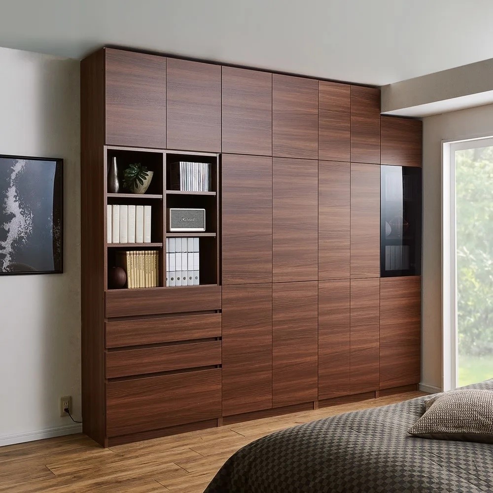 コーディネート例(エ)ブラックウォルナット 梁を避けて天井までぴったりオーダーできます。 ※写真の天井高さ240cm・梁下高さ220cm