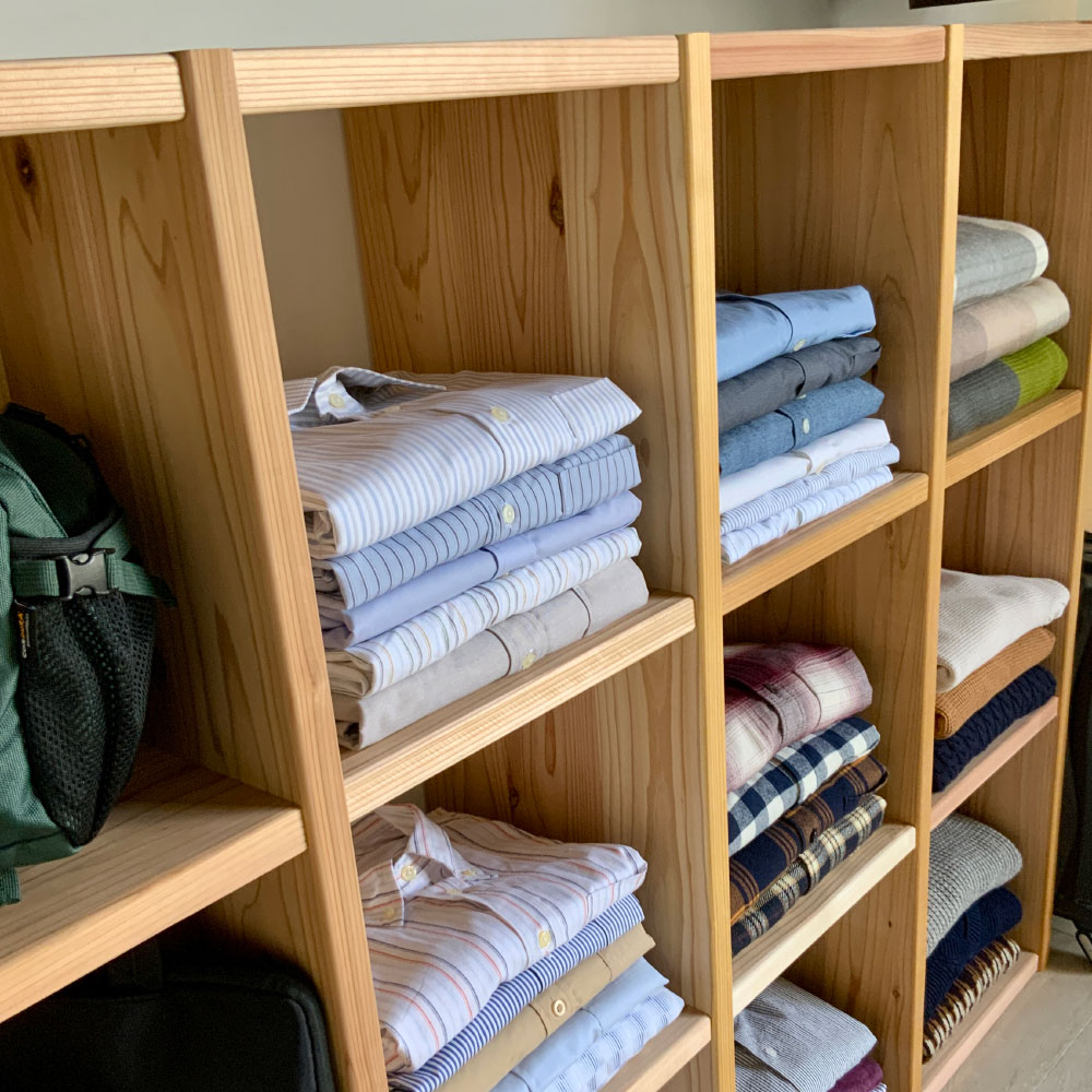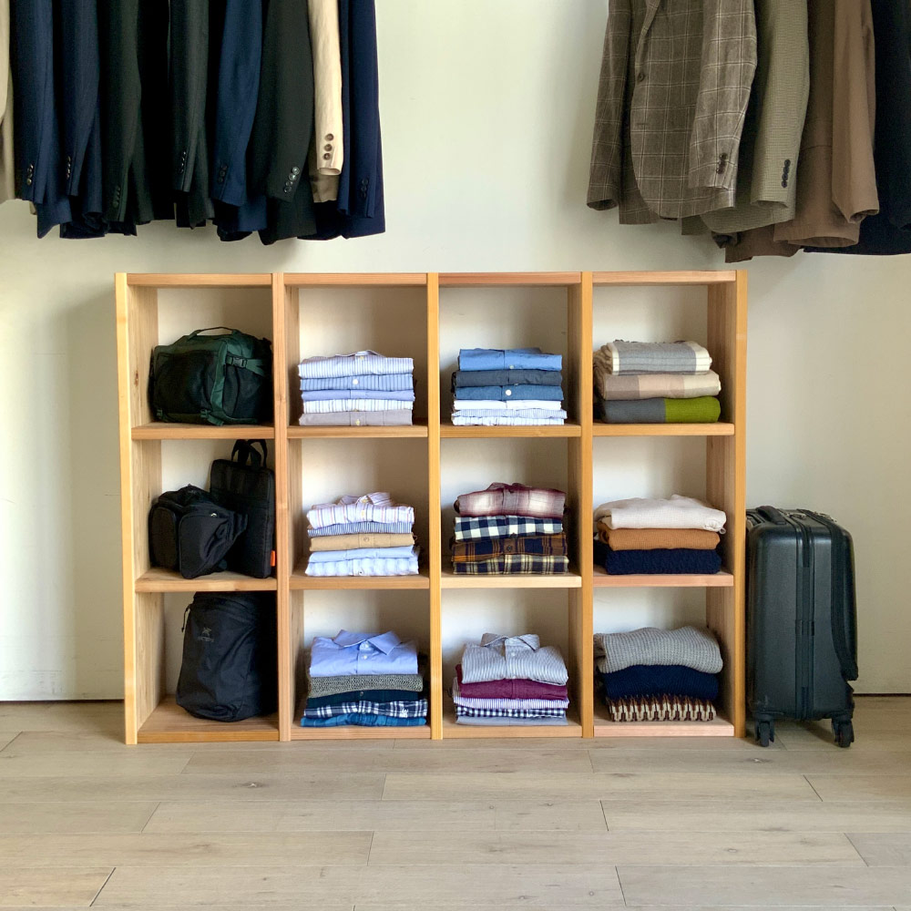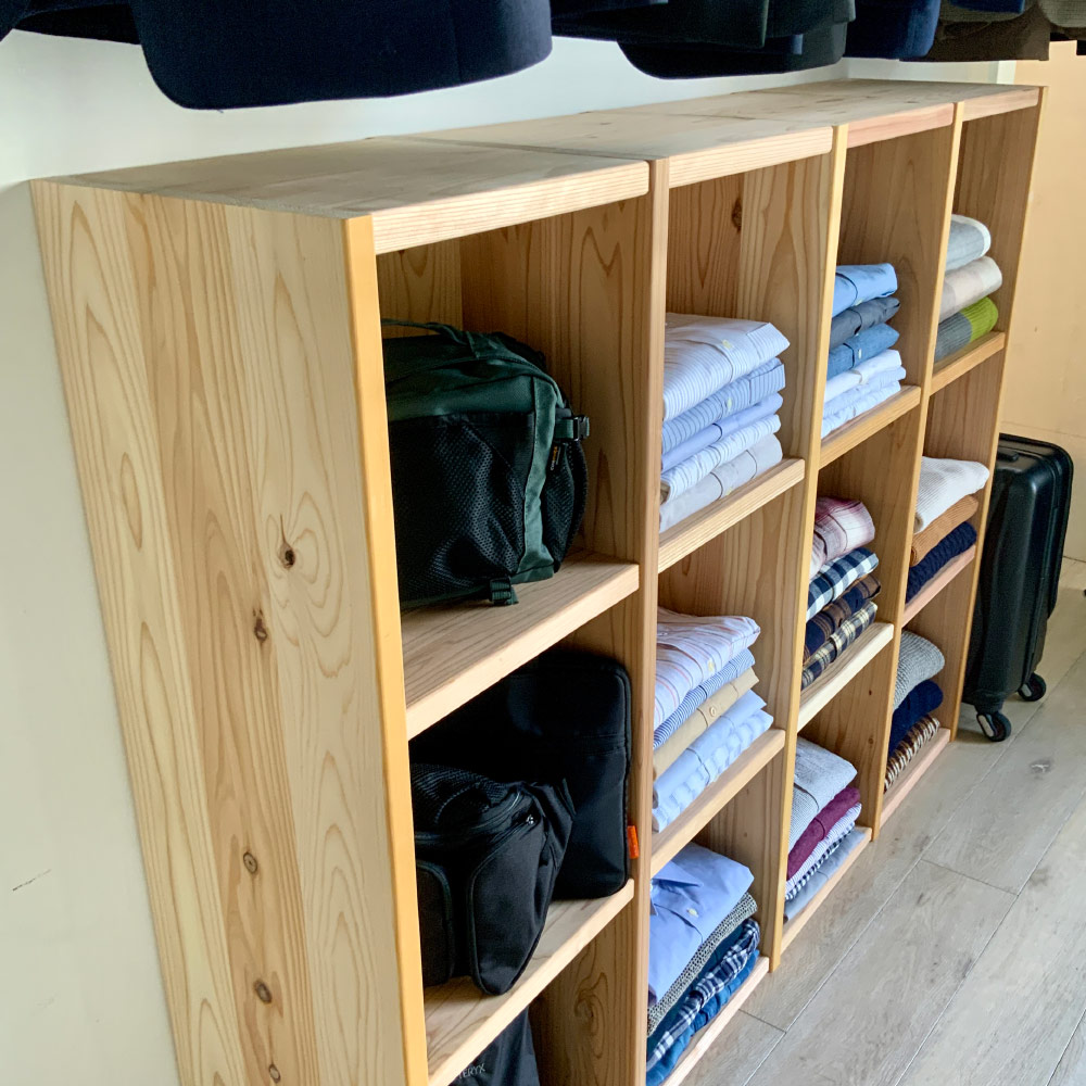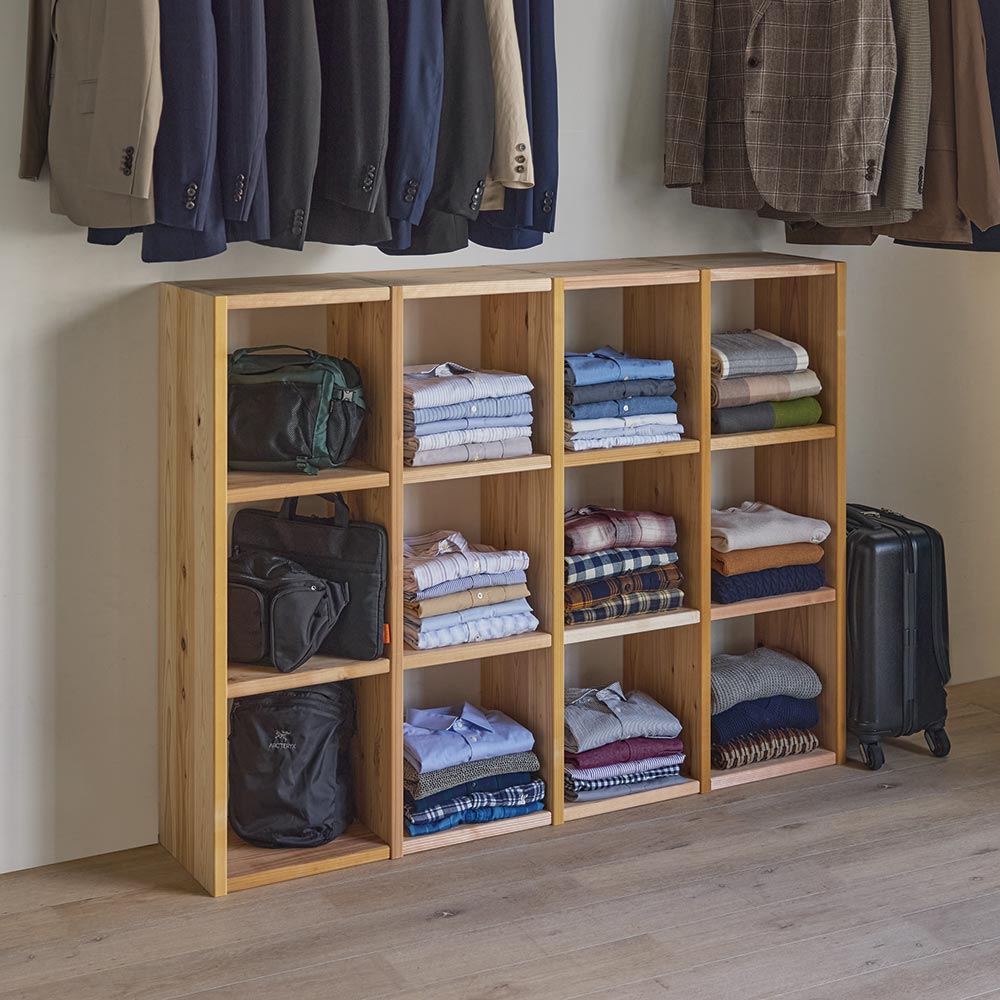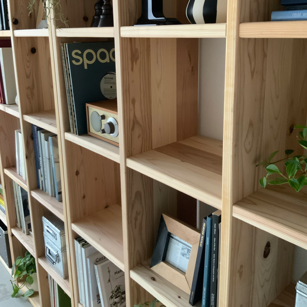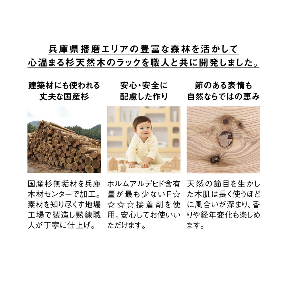 国産杉無垢材ならではの頑丈さ。洗練された天然木のオープンシェルフ。長く使うほどに味わいが増すサステナブルなオープンシェルフ兵庫県播磨エリアの豊富な森林資源を活かして、杉天然木を使用した心温まるラックを職人と共に開発しました。杉の爽やかな香りがお部屋に広がります。本棚や飾り棚、クローゼット収納、壁面収納など、さまざまな用途でお使いいただけます。収納部内寸は幅33.5cm奥行30.5cm高さ33.5cm。LPレコード、A4ファイル、雑誌類、重たい書籍もしっかり収納できます。棚板耐荷重があるので、工夫次第で様々な用途に棚板1枚あたりの耐荷重は30kgなので、重たいアイテムも安心して収納可能です。更に幅が33.5cmと短いので棚板がたわみません。ブックシェルフや、ディスプレイ棚、おしゃれなショップのクローゼットのように洋服を平置きするなど、多用途に活用できます。工夫次第で、見せる収納の可能性が広がります。棚の横列と縦の段は全部で12通りのサイズからお選びいただけます。梁や窓の高さに合わせて複数組み合わせても、単体で使ってもOK。シンプルなデザインがお部屋のインテリアに自然と馴染み、便利に使えるアイテムです。造り付けの家具より安くリーズナブルに壁面収納をつくりことができます。さらに組立商品なので模様替えや引っ越しが多くても安心です。建築材にも使われる丈夫な国産杉杉は古くから建築材料として使用されてきました。このオープンシェルフは、国産杉の原木を兵庫県宍粟市の兵庫木材センターで製材。近隣の家具メーカーでその材料を加工し家具を製造しています。材料供給から製造まで地元企業で連携をとることで、持続可能な森林育成を推進しています。素材を知り尽くした家具職人が、受注を受けてから一つずつ丁寧に仕上げています。修正無垢材には安心・安全なF☆☆☆☆クラスの接着剤使用シックハウス症候群の原因となるホルムアルデヒトの含有量が最も少ないF☆☆☆☆クラスの接着剤を使用し、健康に配慮した安心・安全な作りになっています。合板は一切使用していない無垢の家具です。節のある表情も自然ならではの恵み木目や節が一枚ごとに異なる趣があるのも天然木の特長です。本来なら破棄されてしまう場合もある死節がある部分も有功活用しています。天然素材ならではの風合いをお楽しみください。また、杉天然木は日光に触れることでゆっくりと色味が濃くなり、年月と共に味わい深い風合いに変化。清々しい杉の香りで、まるで森林浴をしているかのような心地よさを楽しめます。