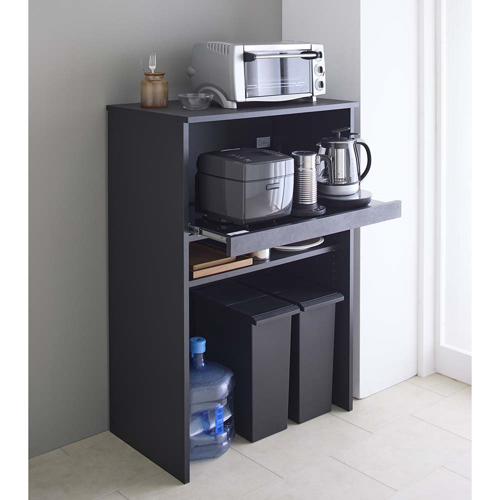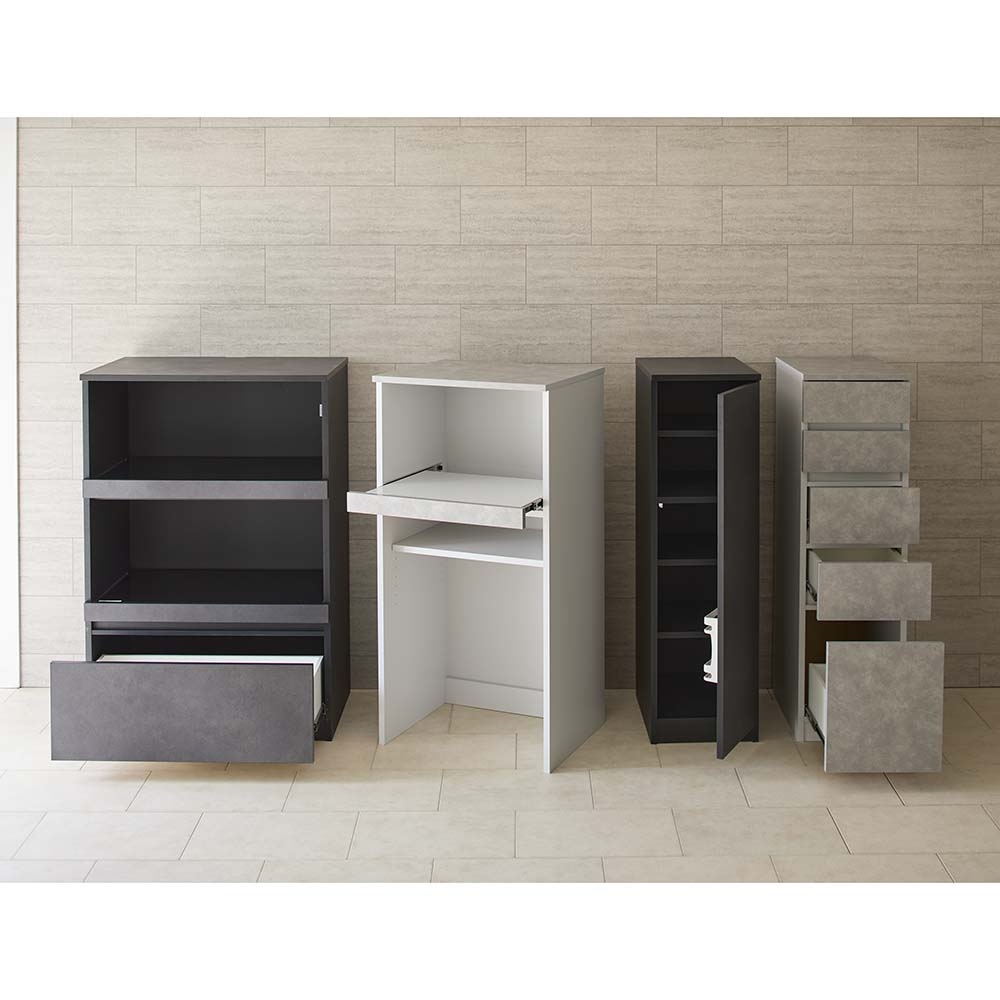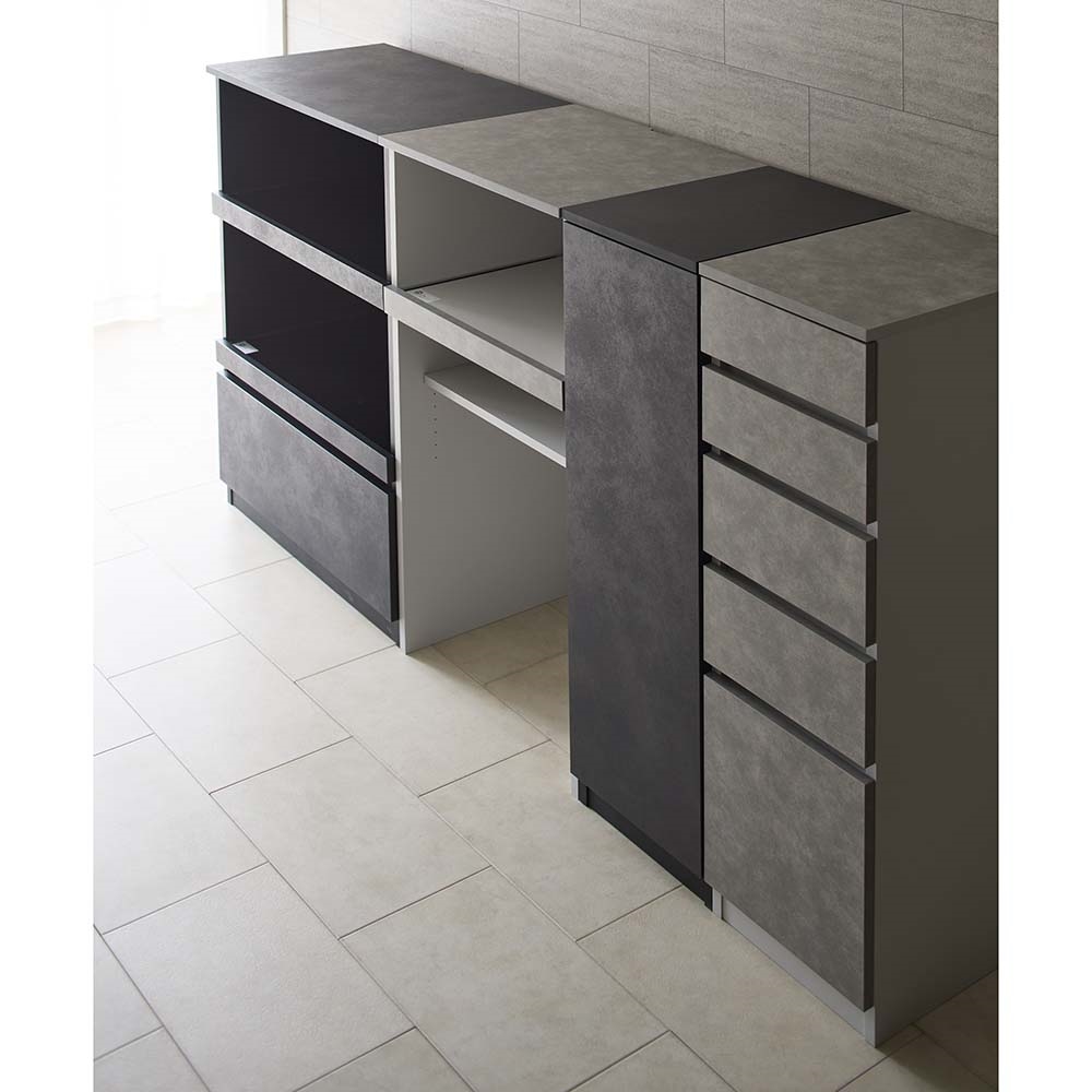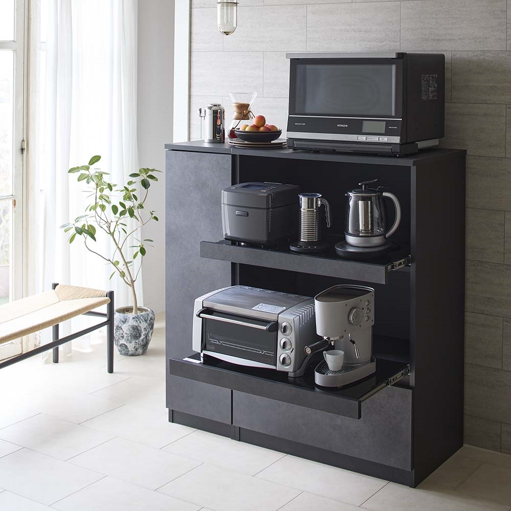 1システムキッチンや他の家具と調和できる石目調(セラミック調)のデザイン。100cmの程よい高さと、大型レンジの使いやすさにも配慮した省スペース収納庫シリーズ。高級感ある石目調(セラミック調)デザイン■モードブラックとモードグレーの2色から選択できます。■システムキッチンにも合う高級感ある雰囲気です。細部まで使いやすさにこだわったキッチン収納■天板、前板は汚れがつきにくく傷にも強いオレフィン化粧板■収納内部も化粧を施して、美しい仕上がりです。■家電収納部、引き出しはフルスライドレール仕様で奥まで引き出せて出し入れがしやすい。熟練の家具職人が作る、国産家具■職人技が光る、安心の日本製■熟練の家具職人が、一点一点心をこめて丁寧に仕上げております。面倒な組み立てのいらない完成品■組み立て不要の完成商品でのお届けになります。届いたその日からすぐにご使用いただけます。