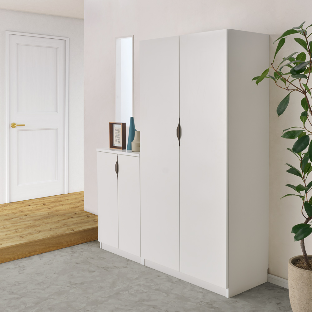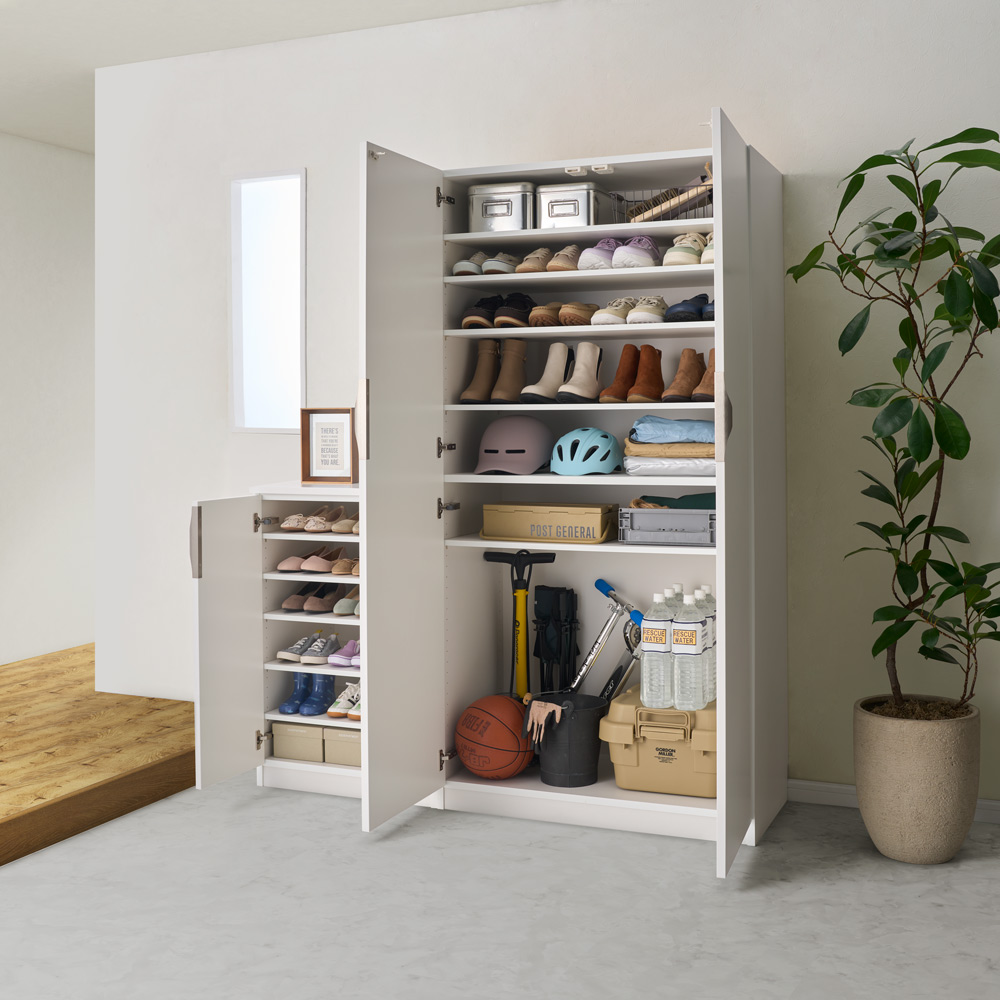 使用イメージ(イ)前面:マットホワイト/側面・内装:ホワイト 玄関に収納したいものは靴だけじゃない。 ※写真左から幅60cm奥行47.5cm高さ90cmタイプ、幅90cm奥行47.5cm高さ180cmタイプです。(一部棚板を外しています)