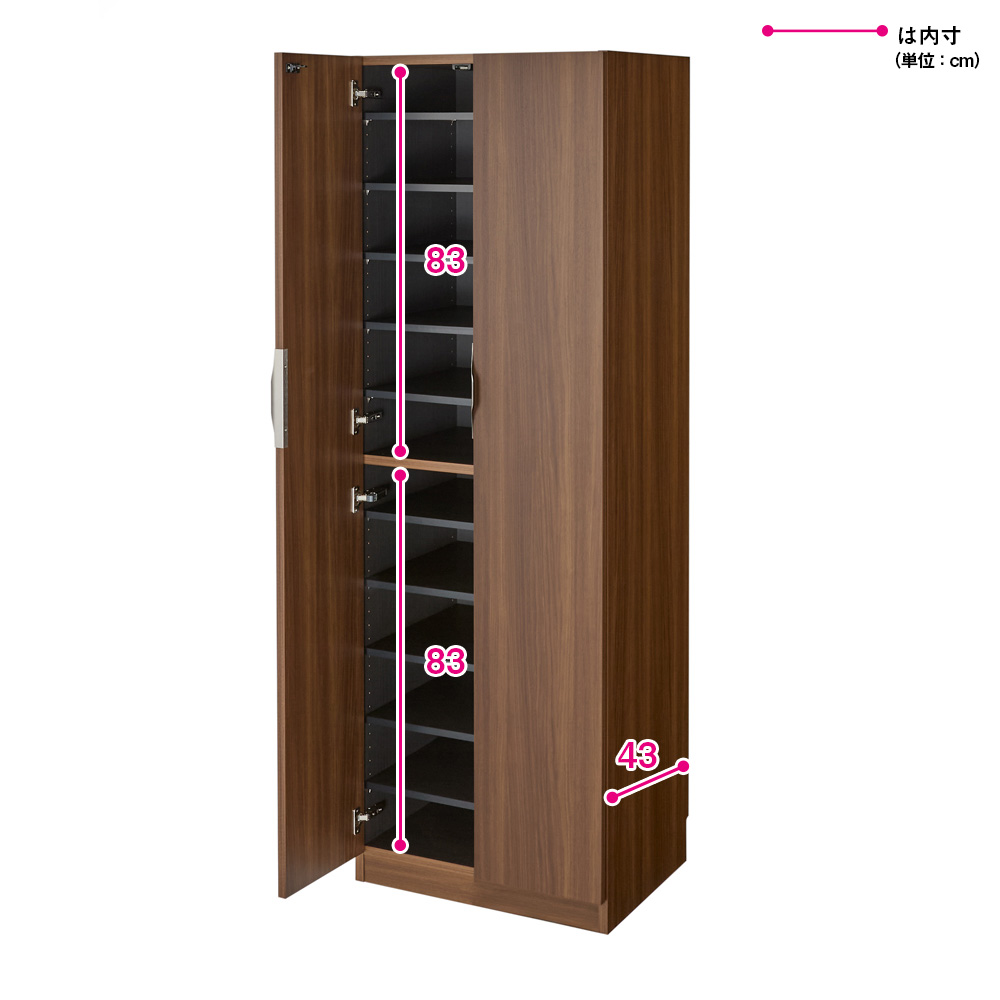 (ウ)前面・側面:ウォルナット/内装:黒木目 内寸奥行43cmで、靴はもちろん遊び道具や防災用品など、さまざまなものが収納可能。 ※写真はお届けする商品です。(一部棚板を外しています)
