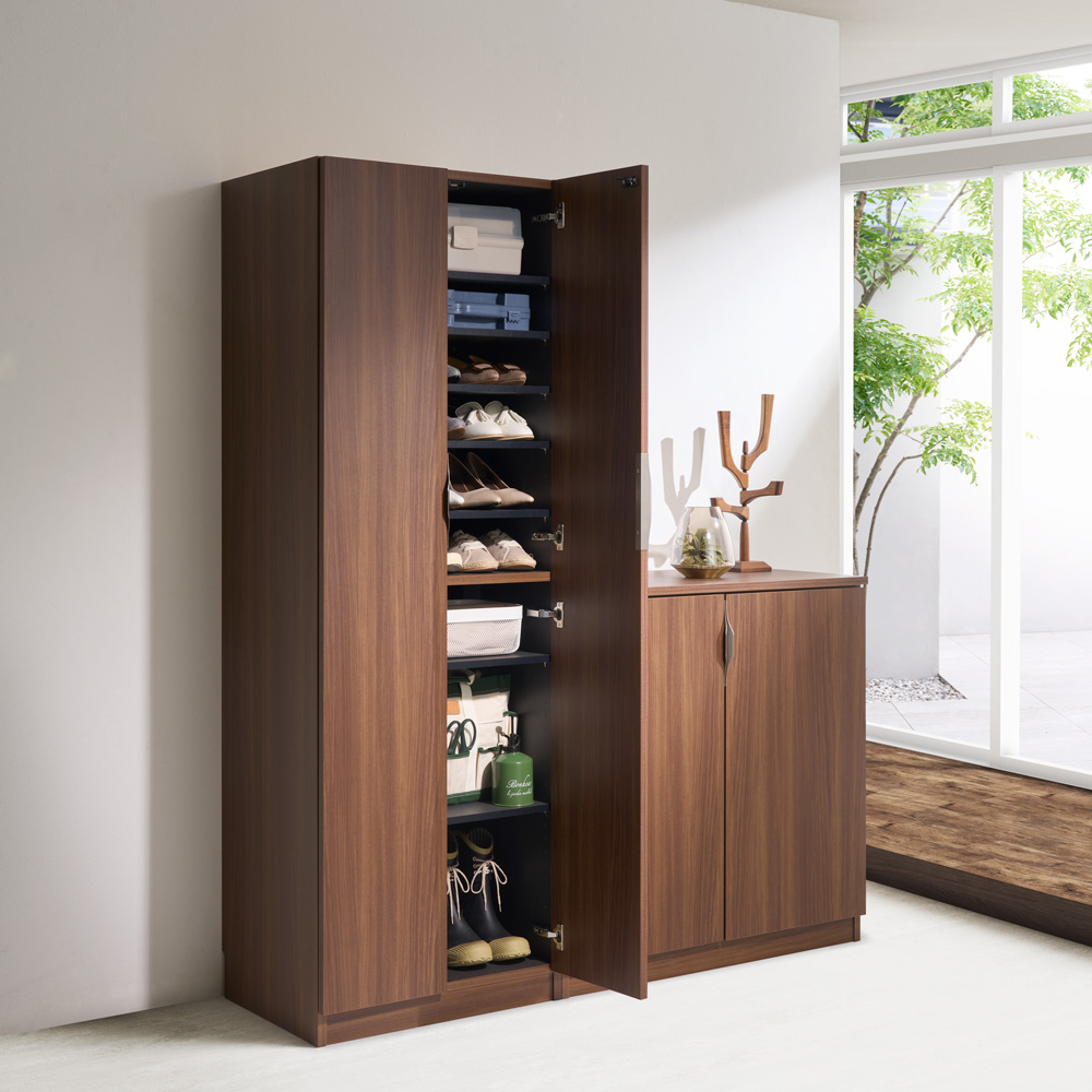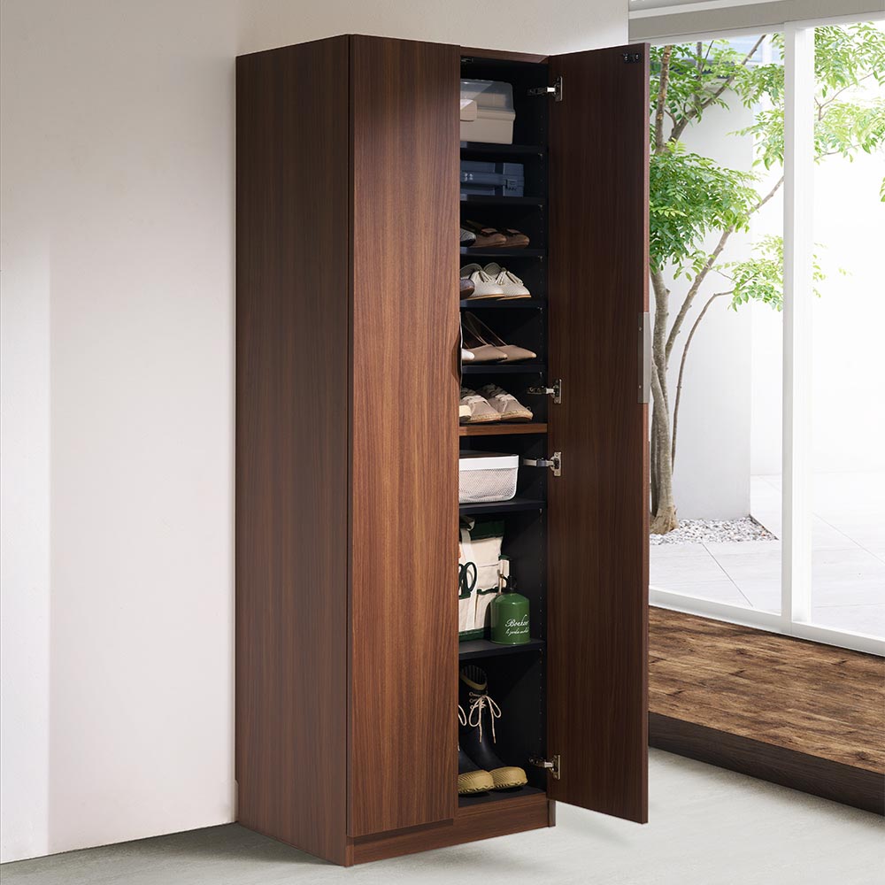 コーディネート例(ウ)前面・側面:ウォルナット/内装:黒木目 深型なので生活感は目隠しして、整った玄関に。 ※お届けは写真左の幅60cm奥行47.5cm高さ180cmタイプです。(一部棚板を外しています)