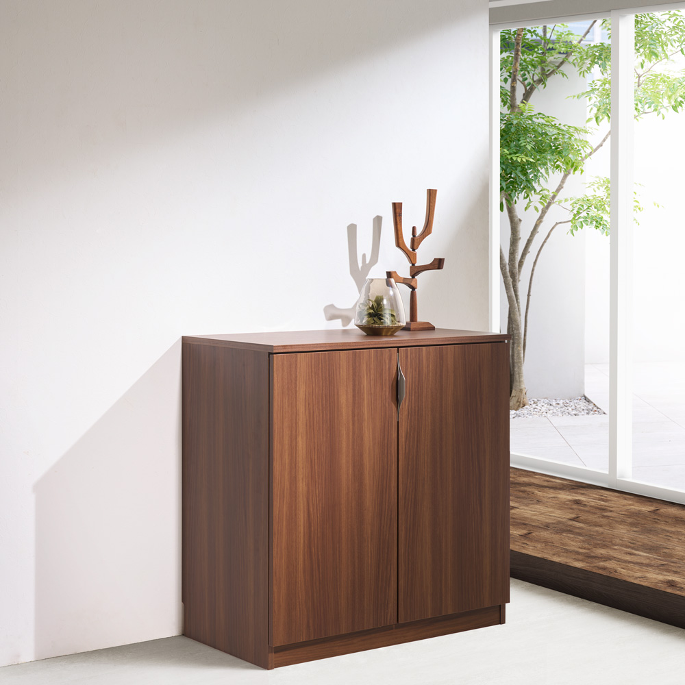 コーディネート例(ウ)前面・側面:ウォルナット/内装:黒木目 深型なので生活感は目隠しして、整った玄関に。 ※お届けは写真右の幅90cm奥行47.5cm高さ90cmタイプです。(一部棚板を外しています)