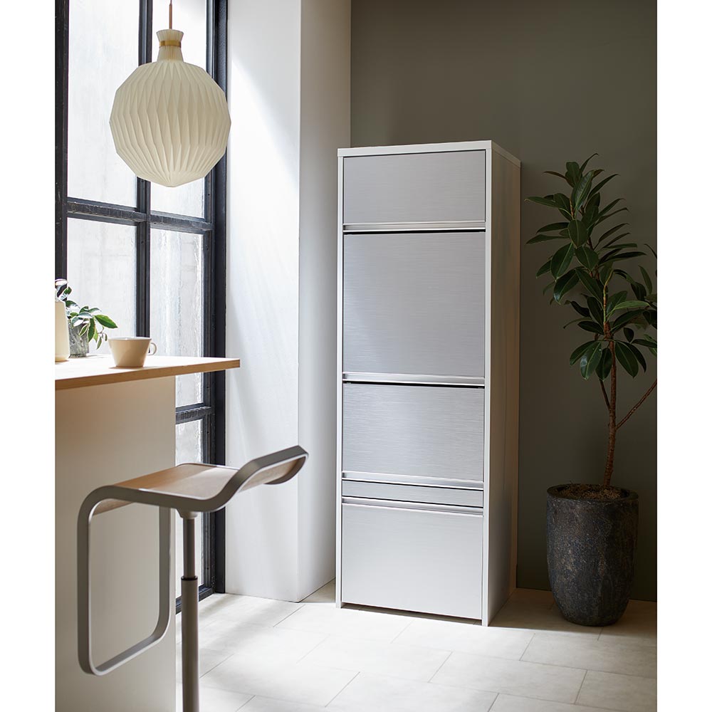 キッチン家電、キッチン雑貨をすっきり目隠し。上品な光沢にアルミが映えるおしゃれなデザインと、多彩なサイズ展開がおすすめのシリーズです。美しく清潔感のある光沢素材×アルミ素材収納物をすっきり目隠しできるキッチン収納◆前面は光沢のある素材で、水に強く拭き掃除もしやすいのがポイントです。◆家電を隠したいけど使いやすく。そんな要望に応えるフラップ扉のおすすめキッチン収納棚です。使いやすさにこだわった機能◆2、3段目の扉はフラップ式で開けたままをキープでき、キッチン作業に便利です。◆家電を使う時は開けたまま、来客時は扉を閉めれば家電を隠せます。◆引き出しはフルスライドレール仕様で奥まで開閉がスムーズです。◆引き出し内部は化粧仕上げ。汚れにも配慮した収納物に優しい仕様です。◆フラップ扉の家電収納部(2カ所)は2口コンセント付き。きれいに配線できます。◆巾木カットを施しているので壁にピッタリ寄せて設置できます。奥行・幅が選べる豊富なラインナップ◆奥行は45cmと55cmの2タイプをご用意。奥行55cmは大型電子レンジも収納可能。◆幅は40cm〜80cmまで10cm単位で5タイプご用意しています。◆狭いキッチンスペースでもゆったり使えるように扉は手前に引き出す構造です。造りもしっかり、安心の国産家具◆日本の家具職人が、一点一点心を込めて丁寧に仕上げております。◆組立不要。届いたらすぐに使える完成品なのも嬉しいポイント。◆日本製ですがお求めやすい価格帯なので、新生活にもおすすめです。