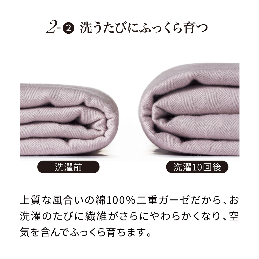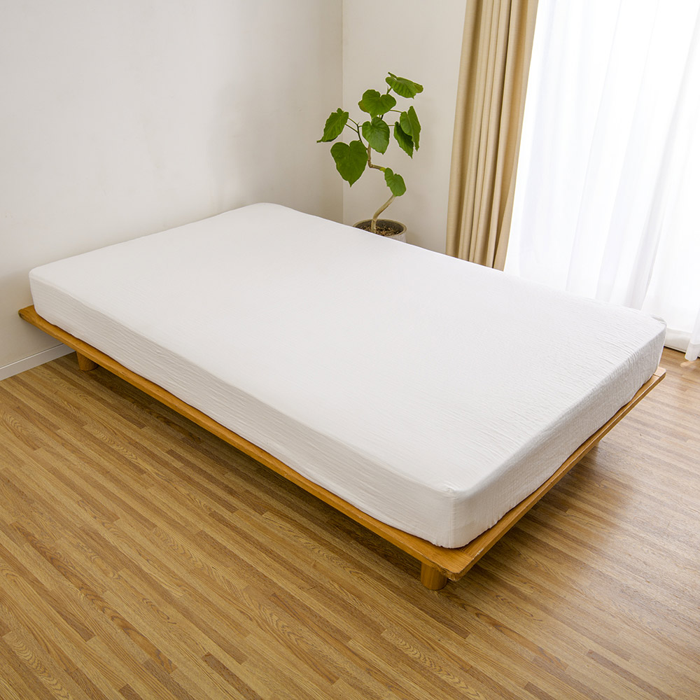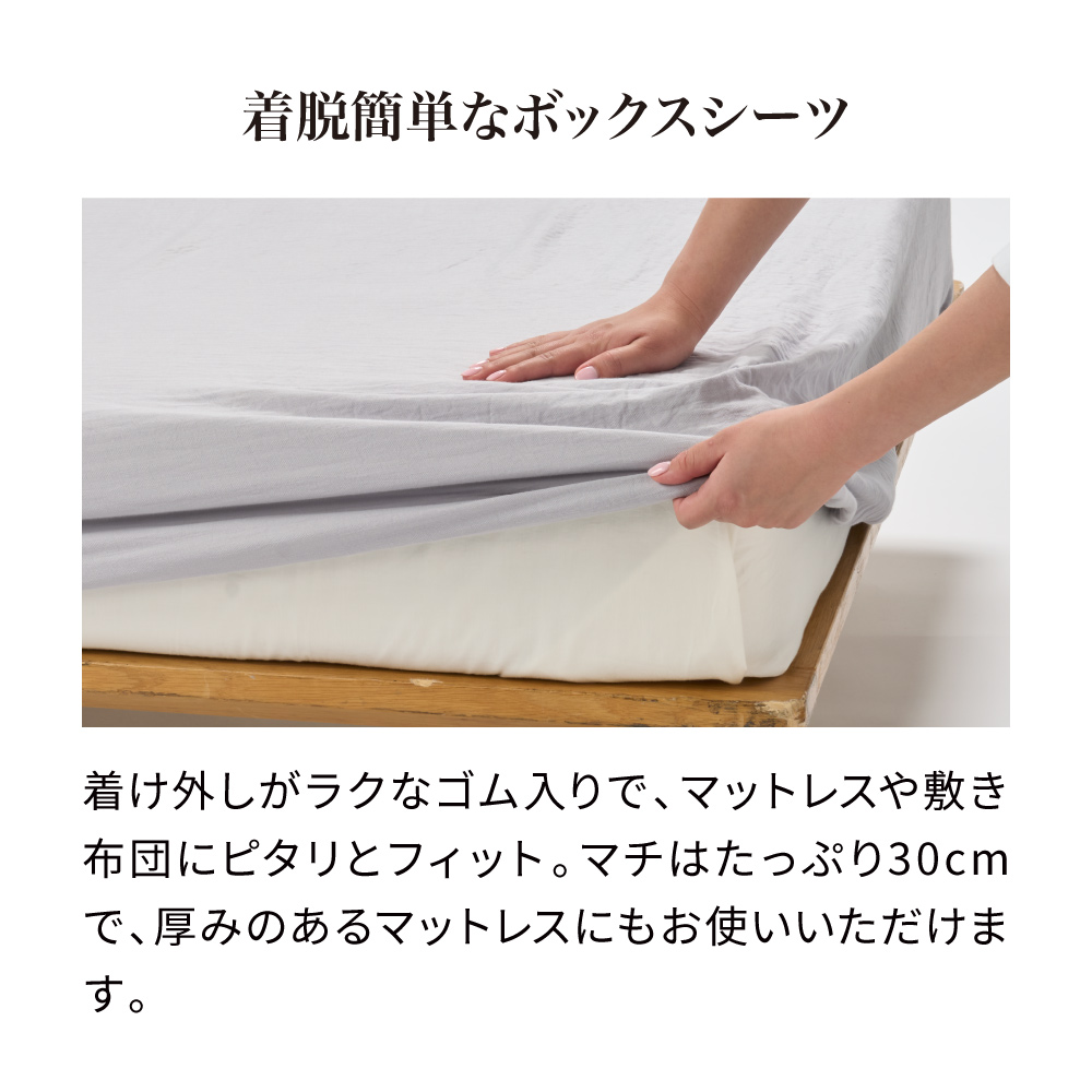 昔ながらの和ざらし製法でとびきりリッチな風合いを実現したボックスシーツです。上質な糸でしっかり織り上げた丈夫な二重ガーゼ生地は、洗うほどほんのり起毛しながらやわらかく育ちます。寒い時期もひんやりしにくく、マットレスや敷布団の使い心地をアップしてくれます。ゆっくりと風合いを育てたい、和ざらし二重ガーゼのボックスシーツ布団にくるまる時、その感触はとても大切。「和ざらし二重ガーゼのボックスシーツ」の素材は、昔ながらの製法で仕上げた綿100%の二重ガーゼ。使えば使うほど、洗えば洗うほど、ほんのりと起毛しながら、ぬくもりのある風合いに育っていき、心まで満たされるやさしい使い心地になっていきます。使い始めからやわらかな和ざらし製法私たちが目指したのは、届いた時から気持ちよく使えるボックスシーツ。そこで選んだのが「和ざらし製法」です。時間をかけてじっくりと綿の不純物を除去していくこの方法なら、生地に負担をかけずに上質な風合いに仕立てることができるのです。ヘリンボーン織りのやわらかくしっかりとした二重ガーゼにしたてました。江戸時代から受け継がれる伝統の技「和ざらし」という言葉をご存知ですか?繊維にストレスを与えないよう、ゆっくり時間をかけて油分や不純物を取り除く伝統の技法。江戸時代から受け継がれてきたこの方法で、ふっくらやわらかな風合いが引き出されます。「和ざらし」と「洋ざらし」の違い 「さらし」とは、天然綿花が持っている脂質や不純物などを除去し、繊維の色素やにおいを取り除く工程のこと。この和ざらしされた二重ガーゼ生地は、創業100年の老舗工場で、手間暇かけて丁寧に加工しています。長い歴史の中で培われた技術が活かされた一枚です。2枚重ねのガーゼがもたらす快適さ二重ガーゼの魅力といえば、やはりその心地よさ。2層の間に空気をたっぷり含んでふっくら軽やか。さらに繊維内の空気が温度調節してくれることで、オールシーズン快適にお使いいただけます。愛着育つ、洗うたびのふっくら上質な綿100%二重ガーゼは、お洗濯のたびに繊維がやわらかくなり、空気を含んでふっくら育ちます。あなただけの風合いが、毎日の眠りをやさしく包み込みます。こだわりの使い心地ぴったりフィット、着脱簡単ボックスシーツ面倒なシーツ交換も、簡単に。全周ゴム仕様だから、マットレスにサッとかぶせるだけでぴったりフィット。たっぷり30cmのマチ幅で、厚手のマットレスにも対応します。ナチュラルかつ高級感のある4カラーをご用意和ざらしガーゼのやわらかさと上質感を引き立てる4カラーからお選びいただけます。和ざらし二重ガーゼのカバーリングは、毎日の眠りをそっと包み込む大切な相棒になってくれるはず。ぜひ長く使って、あなただけの風合いに育ててみてください。