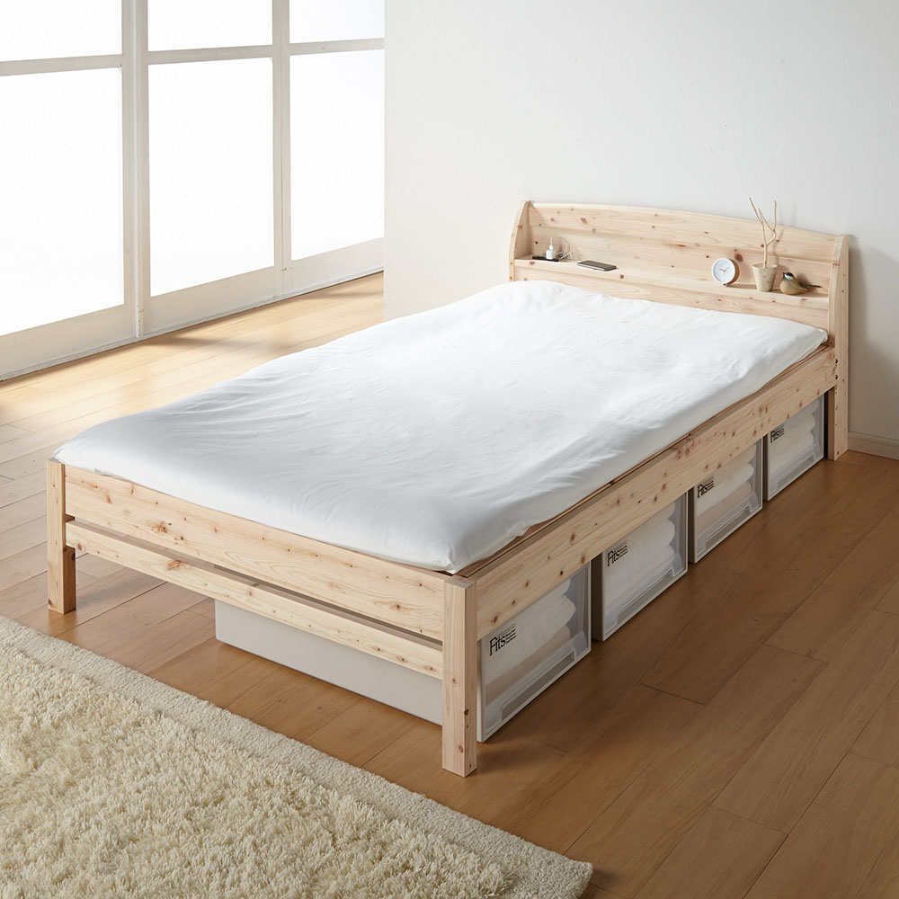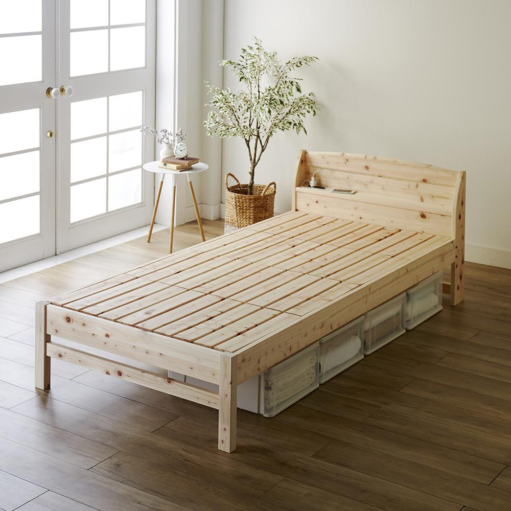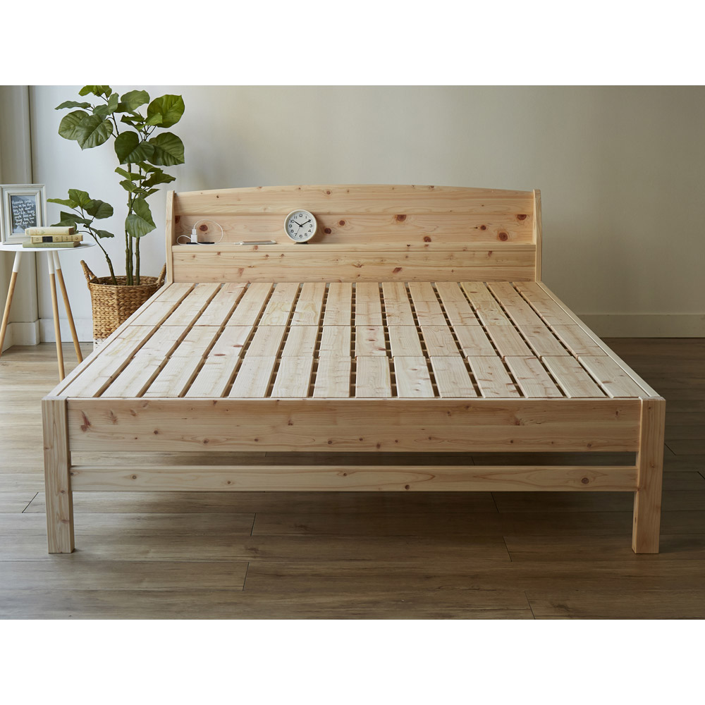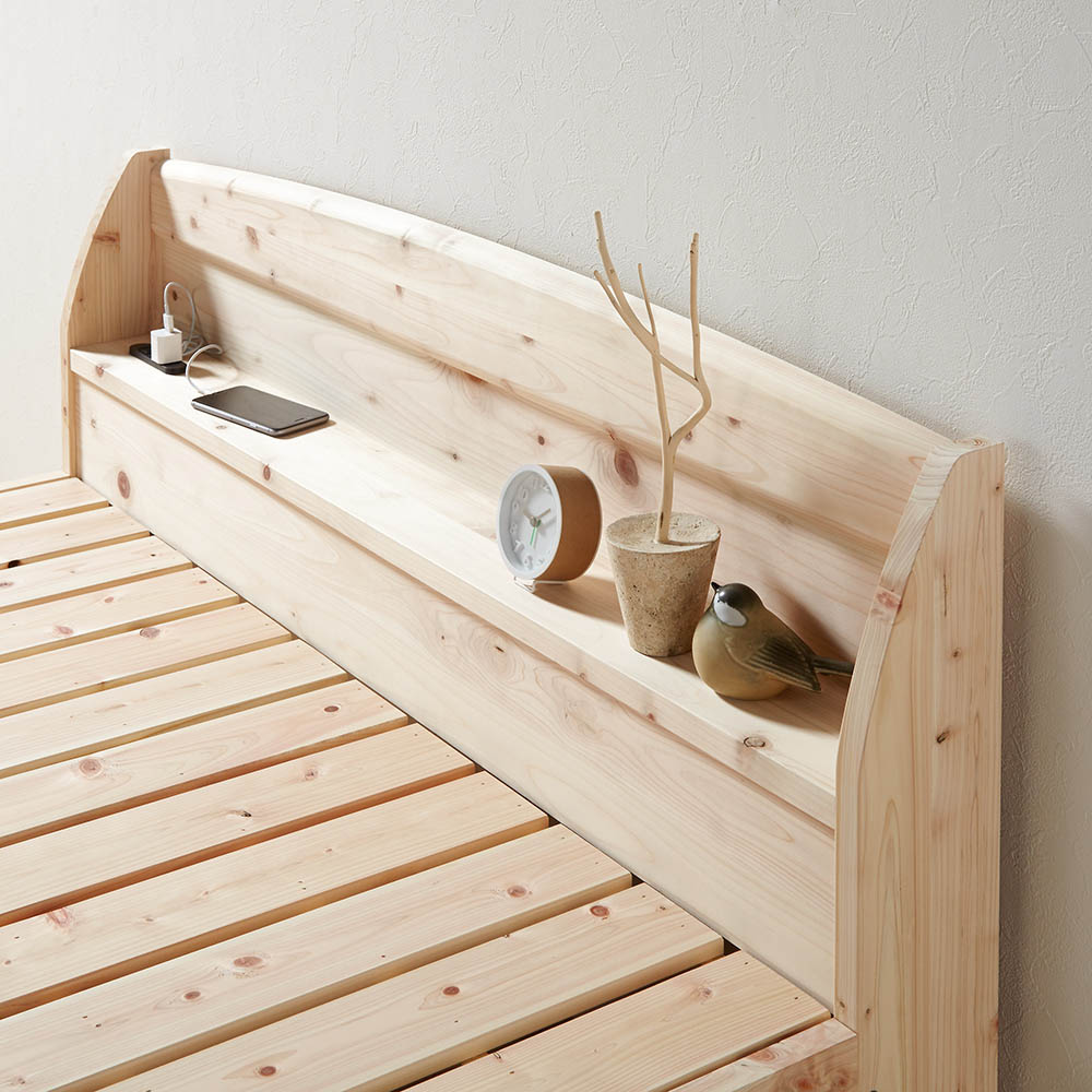無塗装の国産ひのきを使用し、香りも心地よい天然素材のベッドフレーム。ヘッドボードに小棚とコンセントがあり使いやすさもバッチリ。サイズはシングル・セミダブル・ダブルをご用意。国産のひのき天然木を使用した国内一貫生産のひのきベッドフレームフレームもすのこ板部もひのき天然木を使用しました。すのこ板は4分割仕様です。(すのこ板の桟木は強度を保つため積層合板を使用)ひのき材の香りと温もりが魅力です。無塗装なので、使うほどに色が変化し、味わいが増してきます。※お届けした際、匂いが強くしますが、ひのき材の香りです。少しずつ香りは弱まりますが、予めご承知おきください。便利な棚付きヘッドボードヘッドボードには、目覚まし時計や携帯電話、本などが置ける棚付きです。また、向かって棚の左端には携帯電話の充電にも便利な電源コンセント(2口コンセント 計1500W)が付いています。コンセントは棚の上部についております。(以前コンセントが枕元にありましたが改善いたしました)棚のサイズは、シングル …幅95.5×奥行10cm セミダブル…幅115.5×奥行10cm ダブル …幅135.5×奥行10cmベッドの高さが4段階に調節できます寝る高さ(床面高さ)をサイドフレームの組み立て位置の調節によって変えることができます。厚みのあるスプリング式マットレスを載せる場合は、サイドフレームを低く取り付け、布団で寝る場合にはサイドフレームを高く取り付けます。床面高さは21・26・31・36cmと調節可能。サイドフレーム下の高さは9・14・19・24cmとなります。高さによっては、樹脂製の衣装ケースなどをベッド下に収納することができます。通気性のいいすのこ仕様床面には通気性のいいすのこを採用。すのこもひのきを使用しております。梅雨の季節のカビ・湿気対策おすすめベッド。床面サイズは、シングル …幅100.5×長さ196cm セミダブル…幅120.5×長さ196cm ダブル …幅139.5×長さ196cm「ウッドデザイン賞2018」受賞商品ウッドデザイン賞とは?…木の良さや価値を再発見させる、優れた製品や取り組みに対し与えられる賞です。当商品は木を使って人の心を豊かにするハートフルデザイン部門にて入賞しました。【国産家具の造りの良さを伝え、お客様への価値を追求】◆価値ある素材の魅力と匠の技、ディノスならではのノウハウがコラボした日本製ベッドです。◆熟練の家具職人が一点一点丁寧に仕上げた国産ひのき天然木ベッド。◆長年の経験と職人たちのお客様を思う気持ちが品質の高さで物語っています。〜ベッドの選び方についての特集はこちら〜ベッドの選び方〜暮らしに合わせた大きさ選びのポイントとフレームの種類について〜
