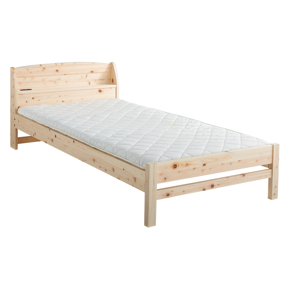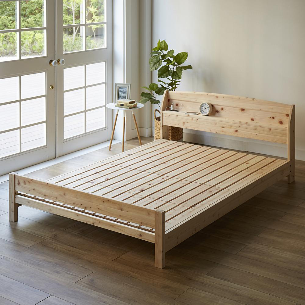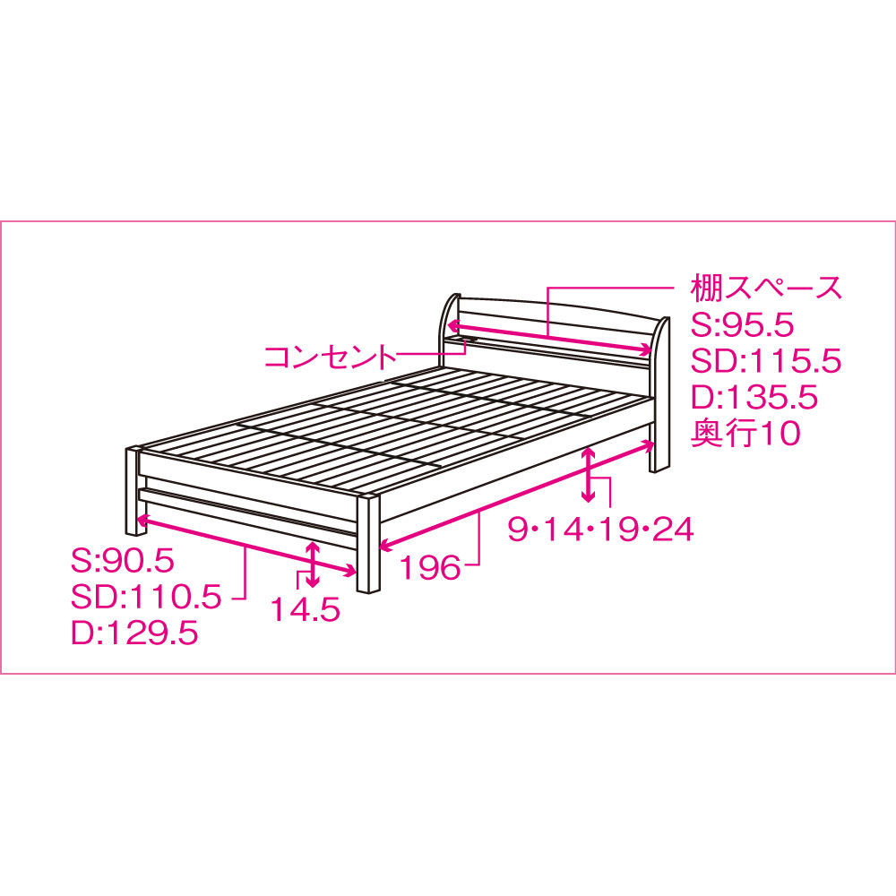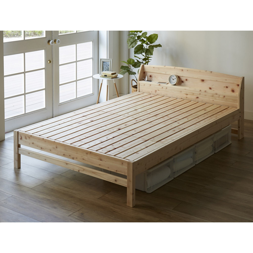 無塗装の国産ひのきを使用し、香りも心地よい天然素材のベッドフレーム。ヘッドボードに小棚とコンセントがあり使いやすさもバッチリ。サイズはシングル・セミダブル・ダブルをご用意。国産のひのき天然木を使用した国内一貫生産のひのきベッドフレームフレームもすのこ板部もひのき天然木を使用しました。すのこ板は4分割仕様です。(すのこ板の桟木は強度を保つため積層合板を使用)ひのき材の香りと温もりが魅力です。無塗装なので、使うほどに色が変化し、味わいが増してきます。※お届けした際、匂いが強くしますが、ひのき材の香りです。少しずつ香りは弱まりますが、予めご承知おきください。便利な棚付きヘッドボードヘッドボードには、目覚まし時計や携帯電話、本などが置ける棚付きです。また、向かって棚の左端には携帯電話の充電にも便利な電源コンセント(2口コンセント 計1500W)が付いています。コンセントは棚の上部についております。(以前コンセントが枕元にありましたが改善いたしました)棚のサイズは、シングル …幅95.5×奥行10cm セミダブル…幅115.5×奥行10cm ダブル …幅135.5×奥行10cmベッドの高さが4段階に調節できます寝る高さ(床面高さ)をサイドフレームの組み立て位置の調節によって変えることができます。厚みのあるスプリング式マットレスを載せる場合は、サイドフレームを低く取り付け、布団で寝る場合にはサイドフレームを高く取り付けます。床面高さは21・26・31・36cmと調節可能。サイドフレーム下の高さは9・14・19・24cmとなります。高さによっては、樹脂製の衣装ケースなどをベッド下に収納することができます。通気性のいいすのこ仕様床面には通気性のいいすのこを採用。すのこもひのきを使用しております。梅雨の季節のカビ・湿気対策おすすめベッド。床面サイズは、シングル …幅100.5×長さ196cm セミダブル…幅120.5×長さ196cm ダブル …幅139.5×長さ196cm「ウッドデザイン賞2018」受賞商品ウッドデザイン賞とは?…木の良さや価値を再発見させる、優れた製品や取り組みに対し与えられる賞です。当商品は木を使って人の心を豊かにするハートフルデザイン部門にて入賞しました。【国産家具の造りの良さを伝え、お客様への価値を追求】◆価値ある素材の魅力と匠の技、ディノスならではのノウハウがコラボした日本製ベッドです。◆熟練の家具職人が一点一点丁寧に仕上げた国産ひのき天然木ベッド。◆長年の経験と職人たちのお客様を思う気持ちが品質の高さで物語っています。〜ベッドの選び方についての特集はこちら〜ベッドの選び方〜暮らしに合わせた大きさ選びのポイントとフレームの種類について〜