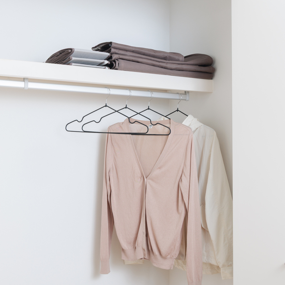 使用頻度が低い着物類はクローゼットの上に。スリムに収納できるので、すき間にぴったり収まります。