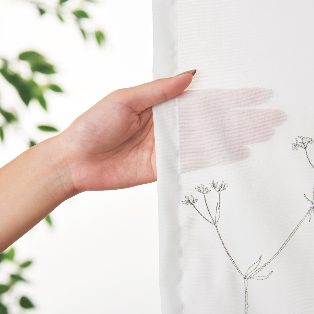 可憐な草花をモチーフに刺しゅうを、カーテンの裾に施しました。野に咲く愛らしい草花を、裾部分に刺しゅうで軽やかに表現したボイルレースカーテン。裾からスッと伸びあがった姿が、可愛らしい印象です。プリントにはない立体感があり、洗練されたナチュラル感が漂います。UV対策にもなりますので、おしゃれと機能性、どちらも欲しいという方にぴったり。来客用のお部屋のカーテンにも素敵です。【ポイント1】優しい配色の刺しゅうアースカラーのやさしい配色で、手刺しゅうで表現したような素朴な雰囲気も魅力です。【ポイント2】UVカット率約75%以上家の中にいても安心できないのが紫外線。室内にも知らず知らずに紫外線が降り注いでいます。本品はUVカット率約75%以上。光を取り入れつつ、気になる紫外線をカットできます。お肌だけでなく、家具やフローリングなどの色あせも防いでくれます。【ポイント3】日本製中国製の生地を国内で丁寧に縫製しました。【ポイント4】丸洗いOK洗濯機で洗えるので、いつでも清潔にお使いいただけます。