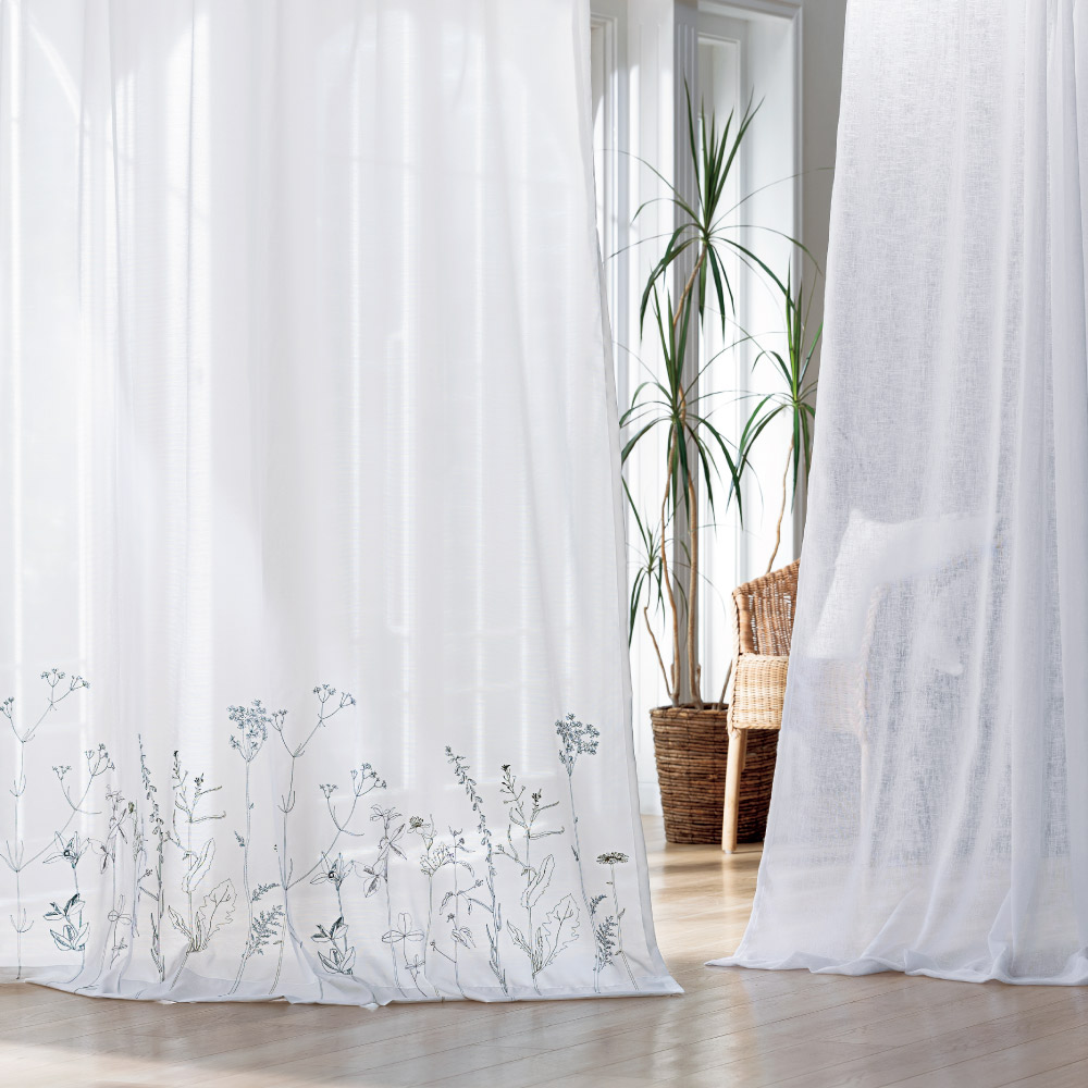 生地の色ホワイト(写真はミックス調防炎・遮光カーテン ブルーグレー系とのコーディネート) 繊細で落ち着いた色合いの草花刺しゅうが、ナチュラル感漂う大人の窓辺に。 ※お届けはレースカーテンのみになります。(100cm幅2枚組・200cm幅1枚)