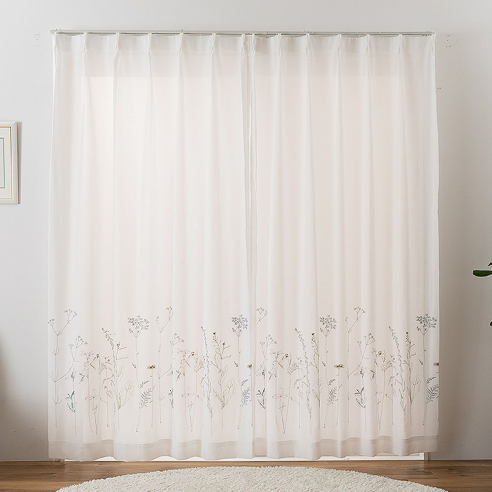 草花柄を刺しゅうで表現したアートのようなボイルレースカーテン。(100cm幅2枚組・200cm幅1枚の 既製サイズ)