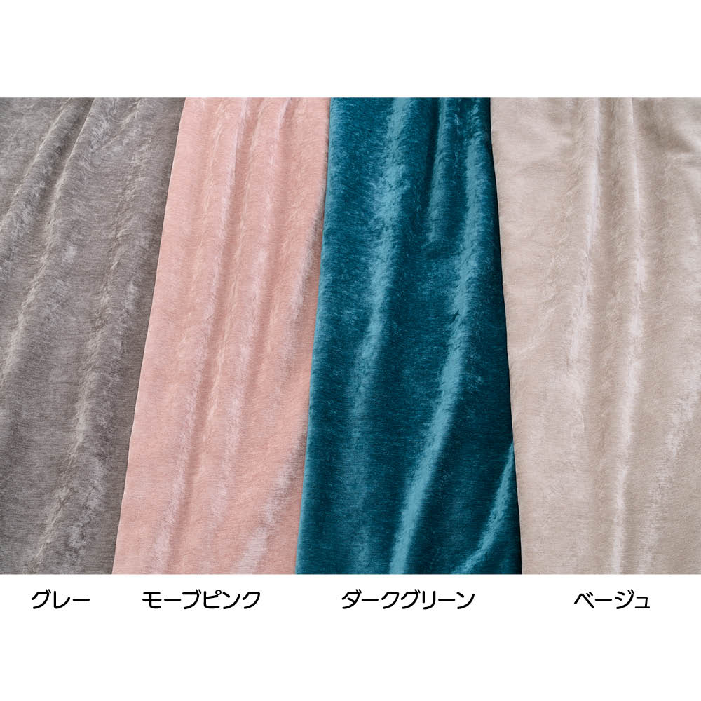 ベルベット調生地なので、ヨーロッパの伝統的なホテルのような、裾を床に長くたれさせる「ブレイクスタイル」にも使えて、クラシックでエレガントな印象が演出できます。ドレープもとてもキレイなので、お手持ちのビーズや金属の装飾が施されたタッセルを合わせるのもおすすめです。カーテンレールを隠す、正面付けのサイズでのお届けになります。【ポイント1】上質なベルベット調生地光沢感があり、トロっとしたやわらかなベルベット調生地が高級感を演出します。使いやすい淡色から重厚な雰囲気の濃色まで、4色をご用意しました。裏地は表地の同系色になります。【ポイント2】1級遮光日差しを遮るので朝日を気にせず眠れ、西日から家具や床の日焼けを守ります。夜は明かりが外に漏れにくいためプライバシー対策にもなります。