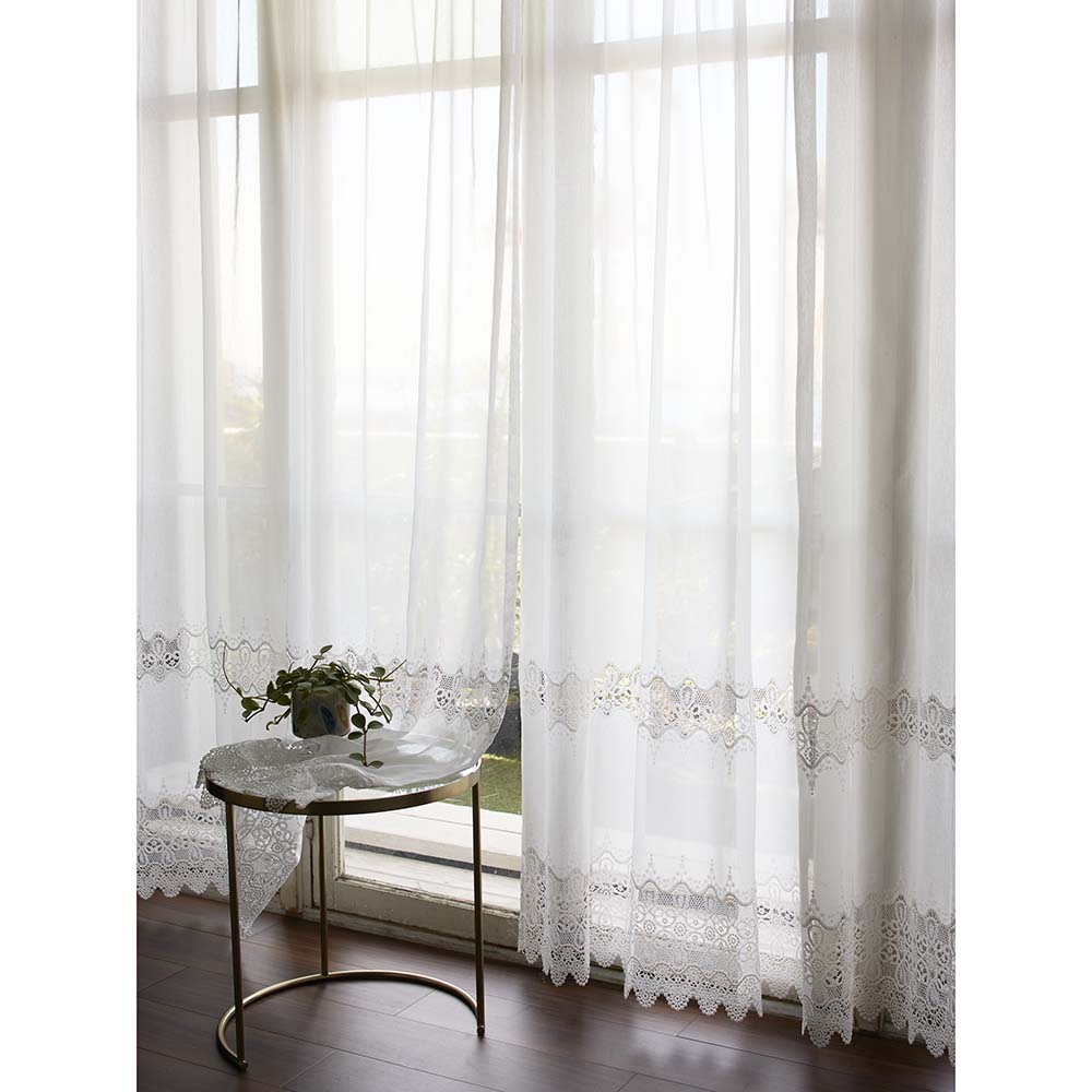 まるで綿のようなやさしい風合いに、裾部分にあしらったマクラメ刺繍が優雅なレースカーテン。窓辺を優美にドレスアップしてくれるカーテンはトルコ製生地を使用。幅、丈のイージーオーダーも承っております。トルコ製のレースカーテンで、刺繍模様が繊細で華やか。ハギのない一枚布仕様なのでグレード感があります。