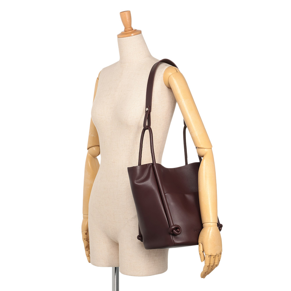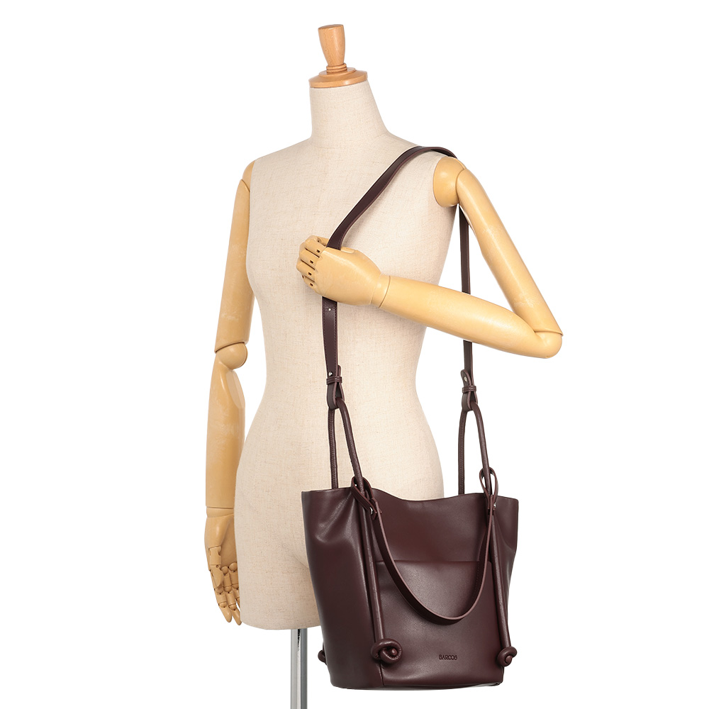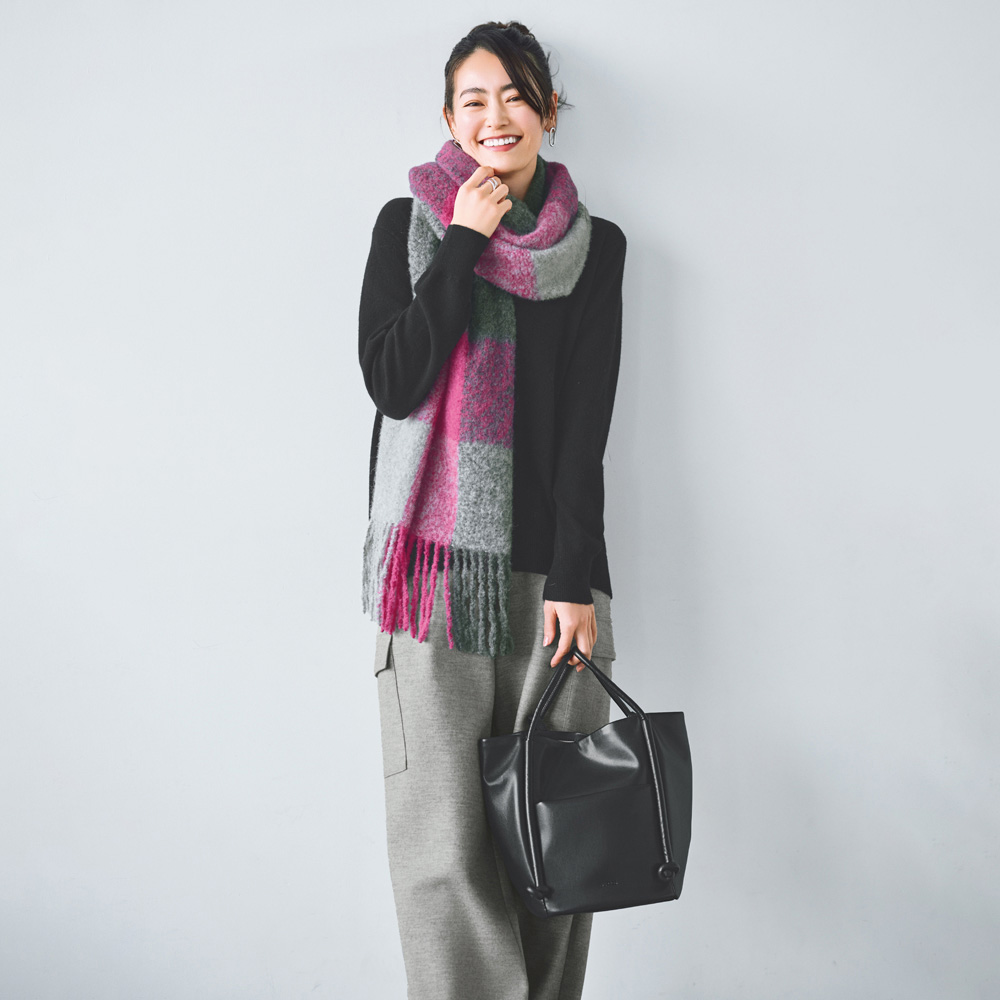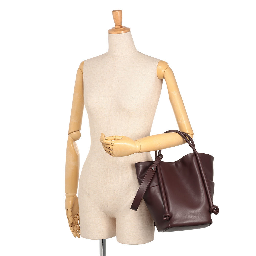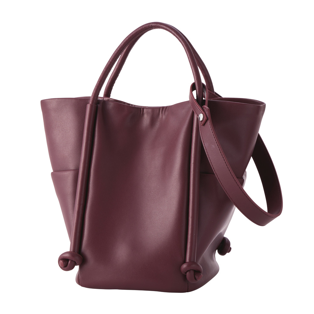 FASHION GOODS“旬”を盛り込んだ冬の小物リスト今っぽさを手軽に楽しめるのはもちろん、使いやすさにも拘り抜いたアイテムです。ストラップや向きの変化で簡単にイメチェン可能柔らかな素材で仕立てた大きめバッグは、ハンドル付け根のノットモチーフがポイント。手持ちと肩掛けに加え、ロングストラップでの斜め掛けも可能。持ち方によって見える面が変わり、バッグの印象が違って見えます。